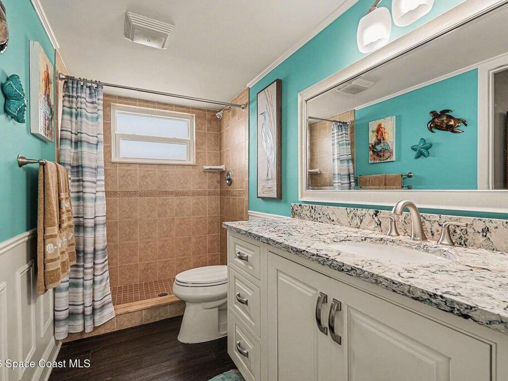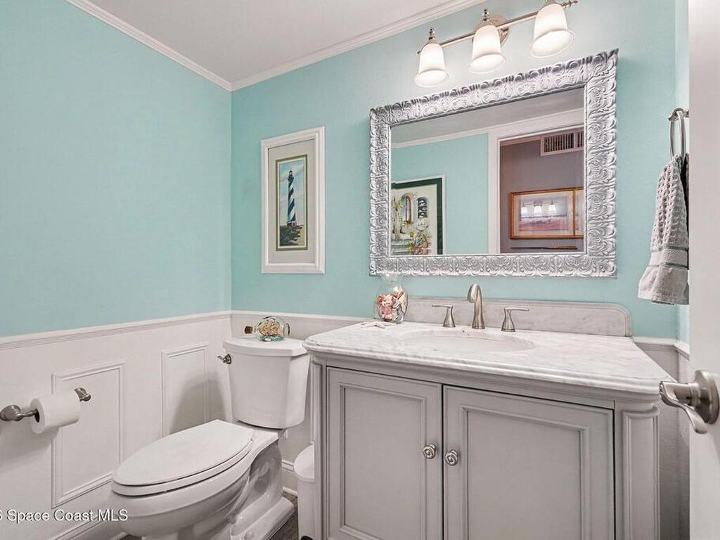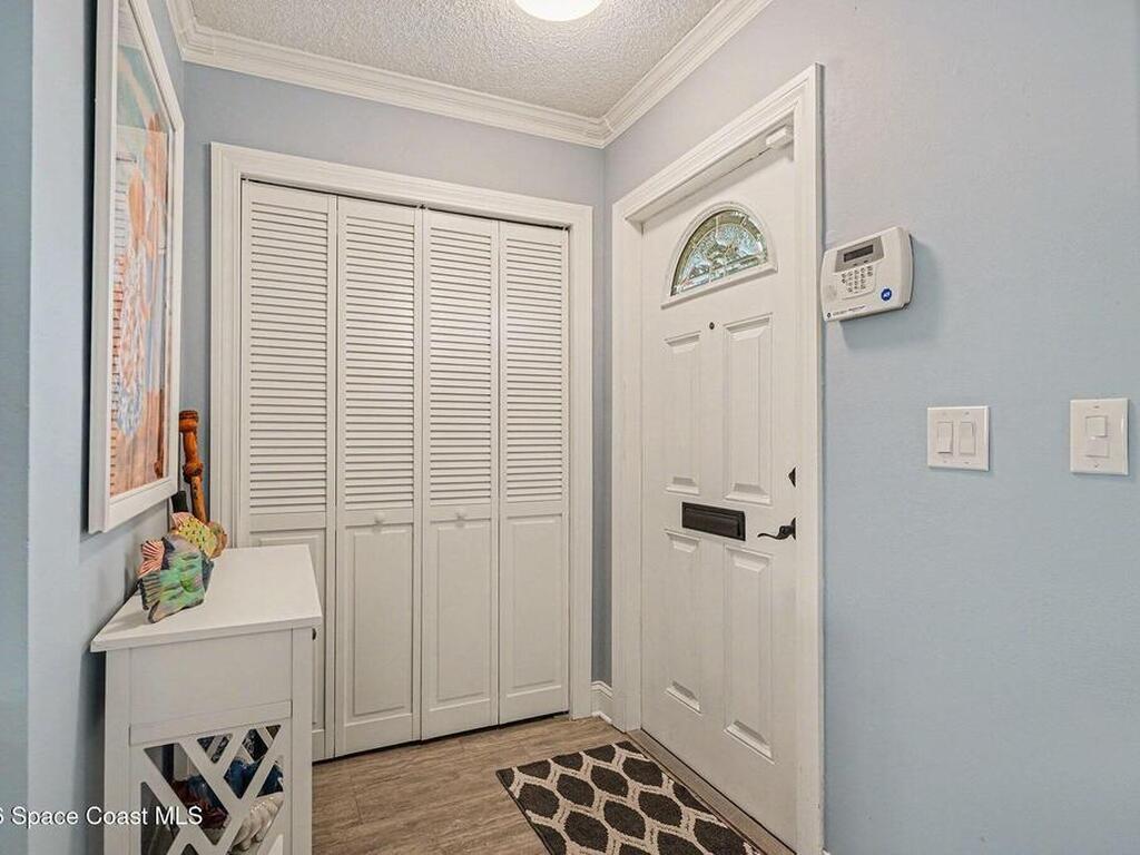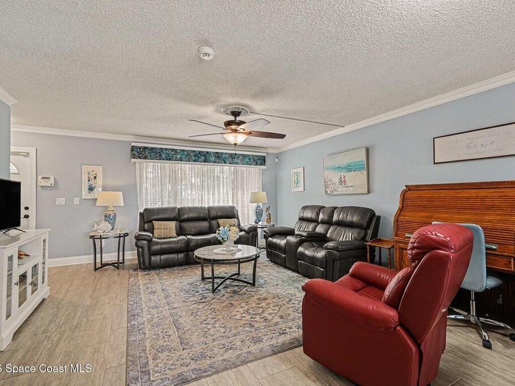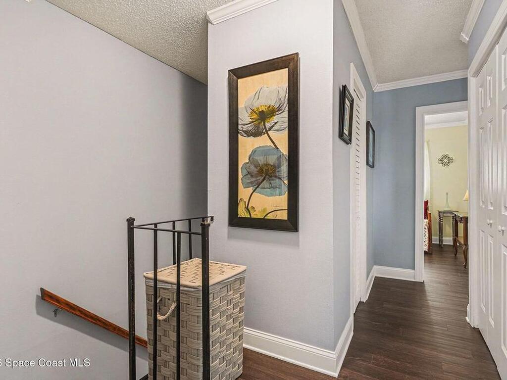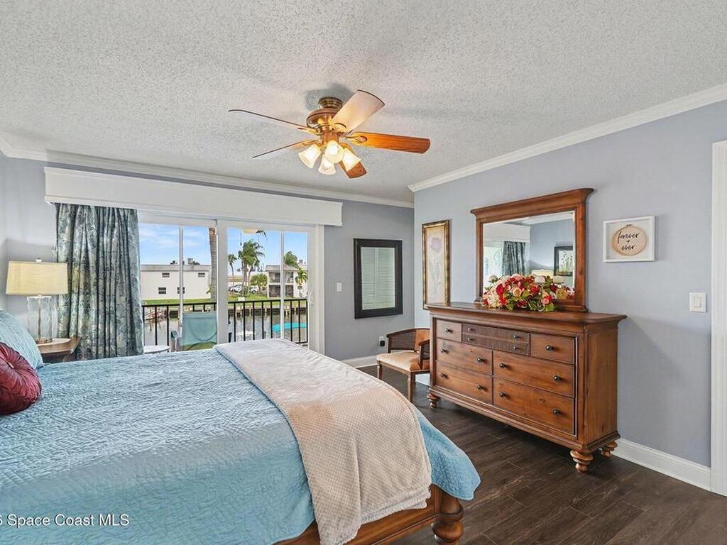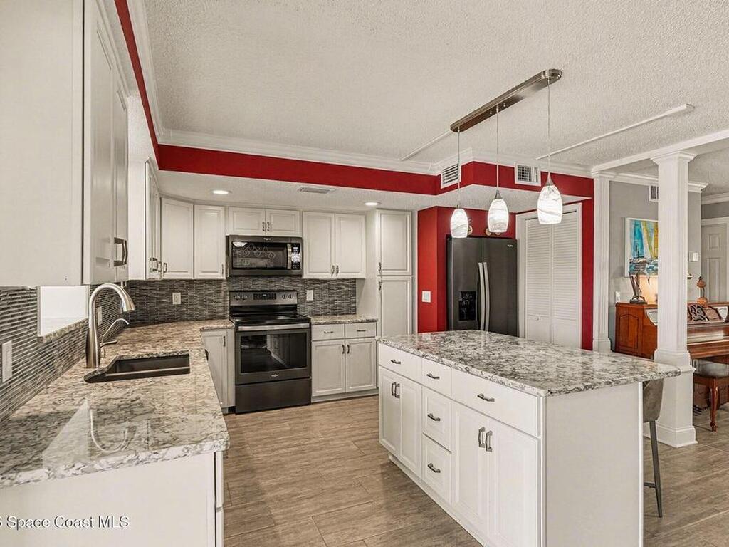 Fully renovated and ideally located in Satellite Beach, this 2-story waterfront home offers an exceptional blend of style, comfort, & carefree coastal living. The upper level features three bedrooms & two full baths, highlighted by crown molding and LVP throughout. Downstairs, an open living and dining area creates a welcoming space for entertaining, complemented by a convenient half bath. The stunning kitchen is the heart of the home, showcasing quartz countertops, white cabinetry, tile backsplash, a spacious island, pantry with pull-out drawers, and sleek gun-metal appliances. The enclosed lanai adds approx.120 square feet of living space and allows for an indoor laundry area, adding everyday convenience. Enjoy tranquil water views and the rare advantage of a private, designated boat slip with direct access to the Banana River. Additional upgrades include impact windows, HVAC 2018, Roof 2017, HWH 2018, and xtra outlets. One of the nicest unit in the complex. A must see!