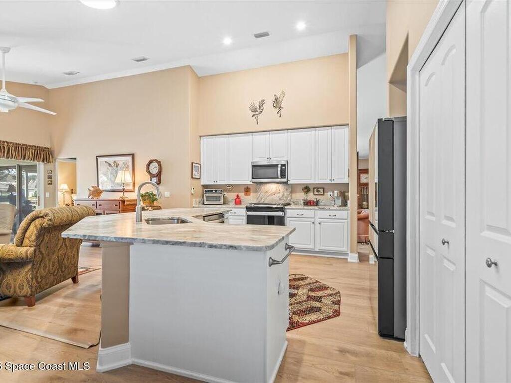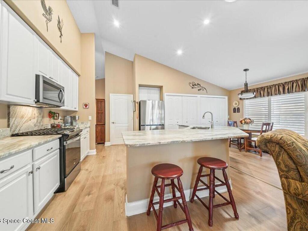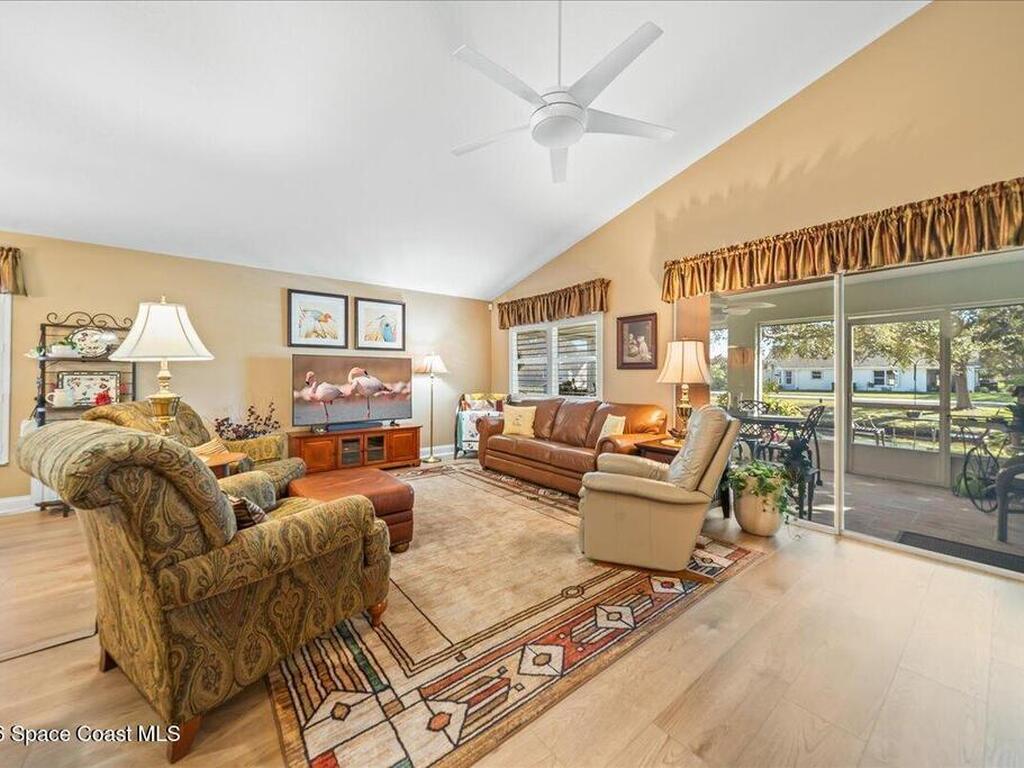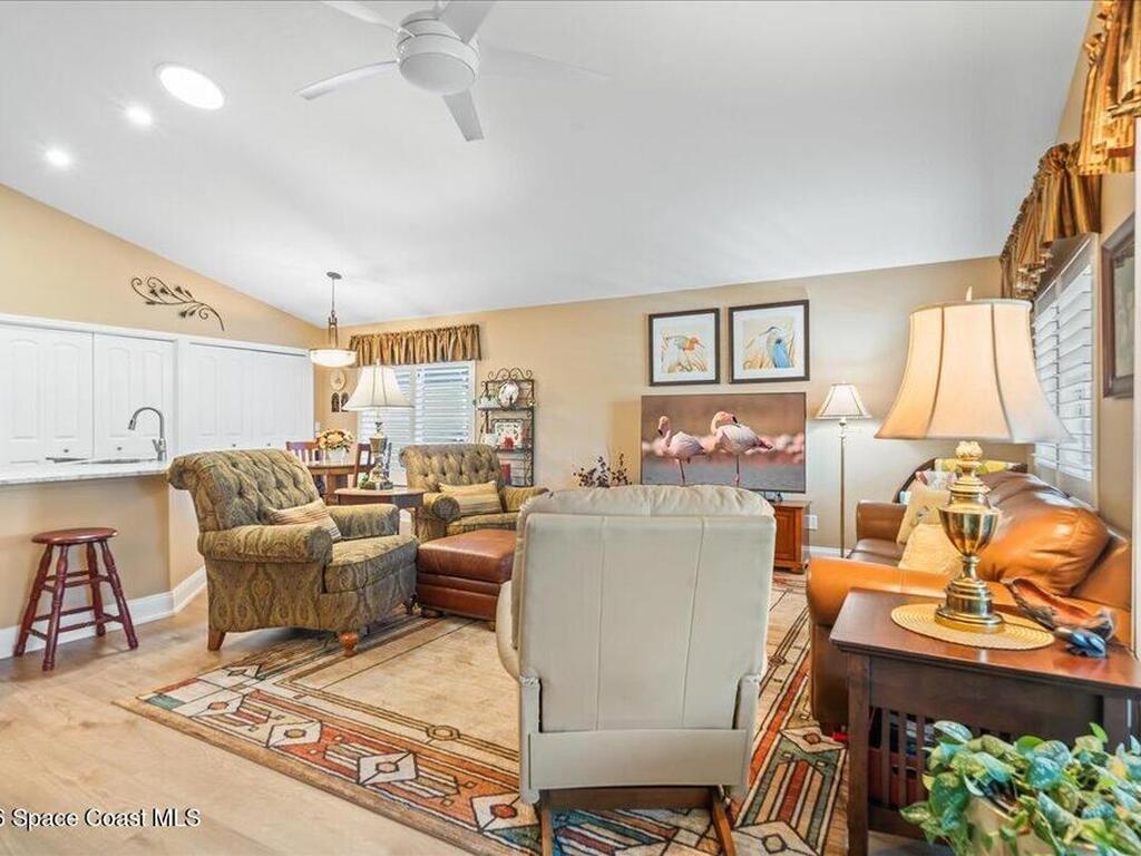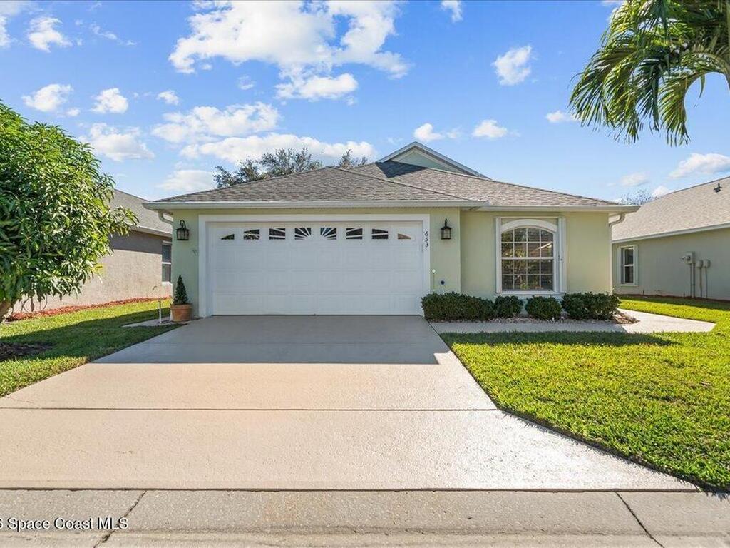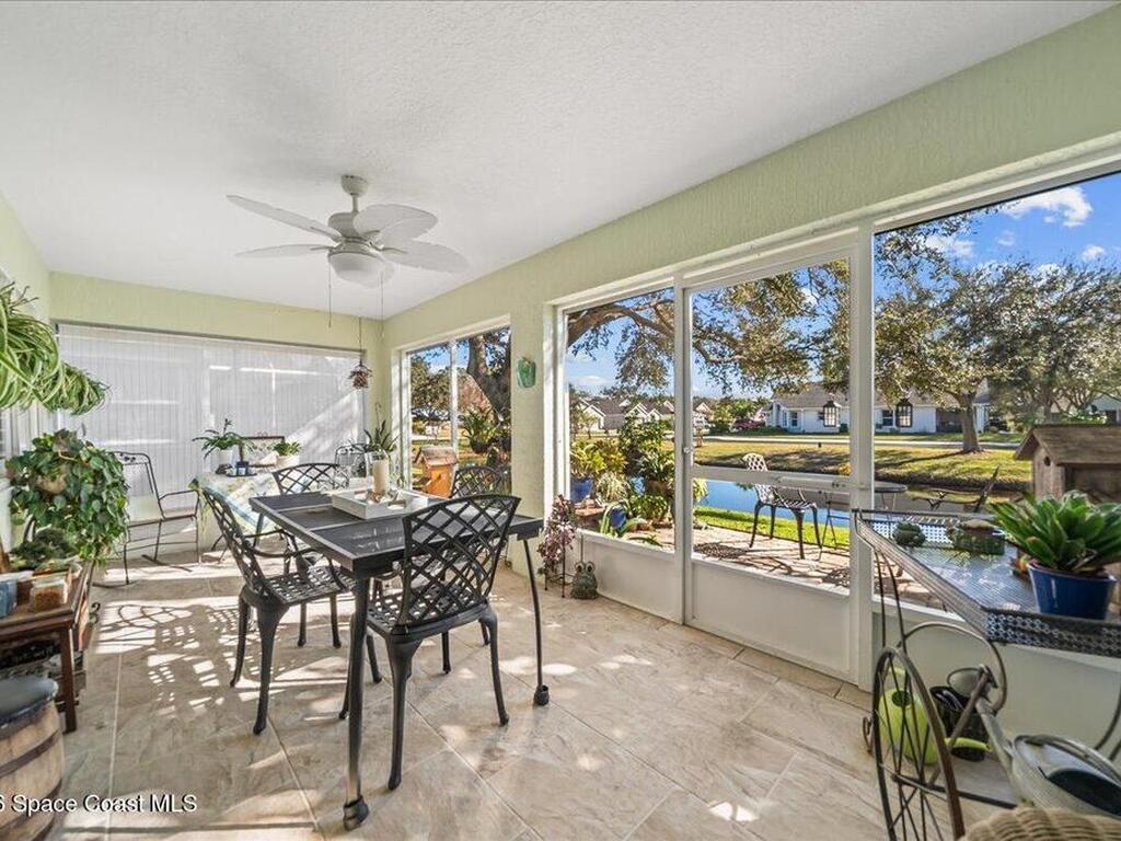 Welcome to your Waterfront Home in the gated community of Compass Pointe. This 3BD/2BA move-in ready home has been updated throughout. Enjoy the updated kitchen with 42'' white cabinets, appliances and an enlarged pantry. The flooring has been updated throughout with Luxury Vinyl Plank for easy maintenance and beauty. This home was upgraded with all new accordion shutters throughout. Both bathrooms have beautifully upgraded seamless glass showers and updated fixtures. The open floorplan of this home offers water views from the kitchen, family room, primary bedroom and welcoming screened lanai. The 2023 roof and gutters add an additional layer of comfort. Enjoy the community amenities, including a screen heated pool and spa, bocce ball, putting green, shuffleboard and organized activities. Conveniently located to shopping, dining and the beaches.