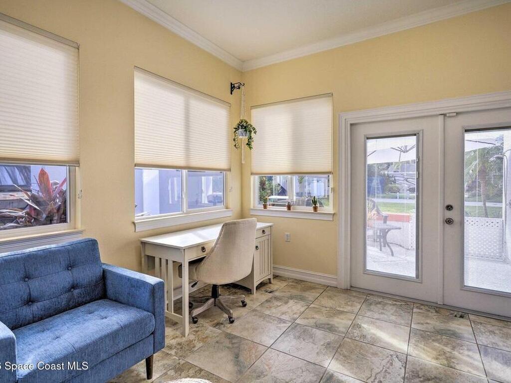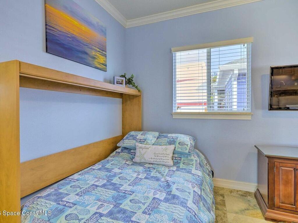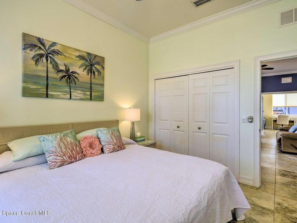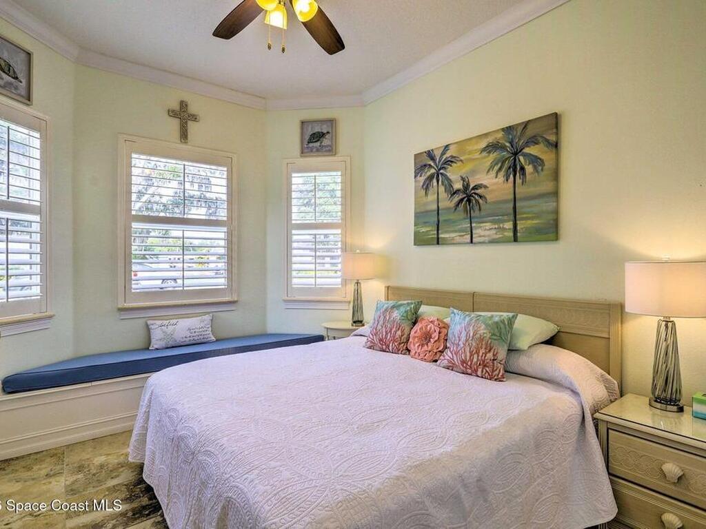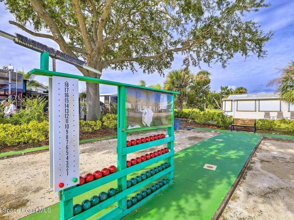 The shell house! The stucco has sea shells incorporated into it. RV Resort living at this active 55+ community for year round or seasonal use. This lot will accommodate any size or style RV with additional hookups for water, sewer, electricity and cable. . This cute, roomy cottage has a master bedroom and an additional bonus room that could be used for sleeping. It is being offered furnished turn-key. You could rent the property short or long term while you aren't using it. In fact, there is a rental manager in place, which could continue. There is a gated entry and and an executive golf course on the property. Amenities include a clubhouse, heated pool, tennis, pickleball, shuffleboard, bocce and tennis. The community is close to airports, theme parks, beaches, shopping and restaurants. Watch the rocket launches from your own yard. The inexpensive association dues cover deluxe cable, your own internet modem/router, sewer, water, trash removal, lawn care and access to common area.