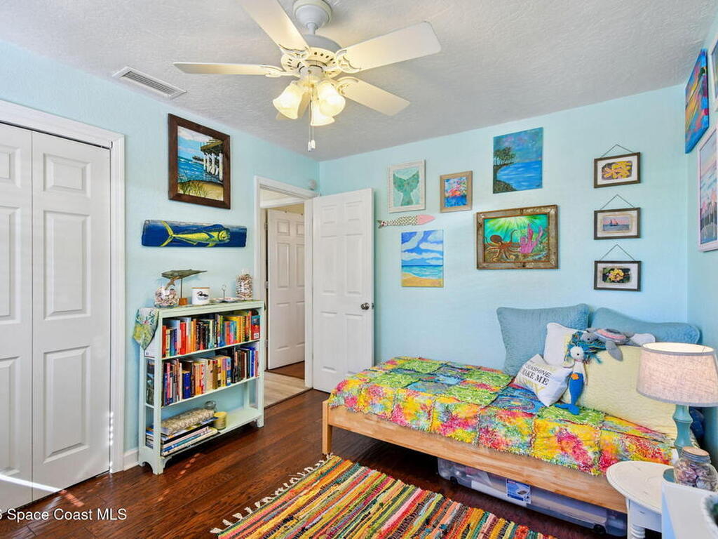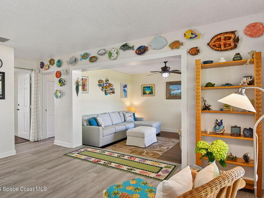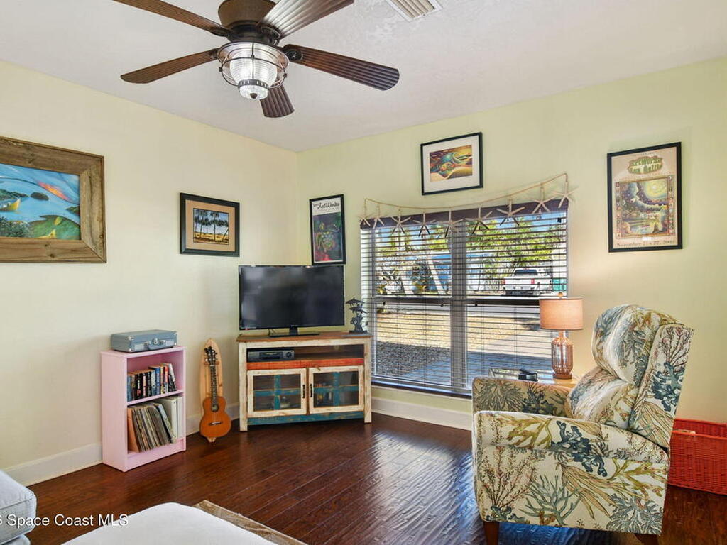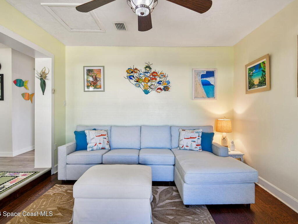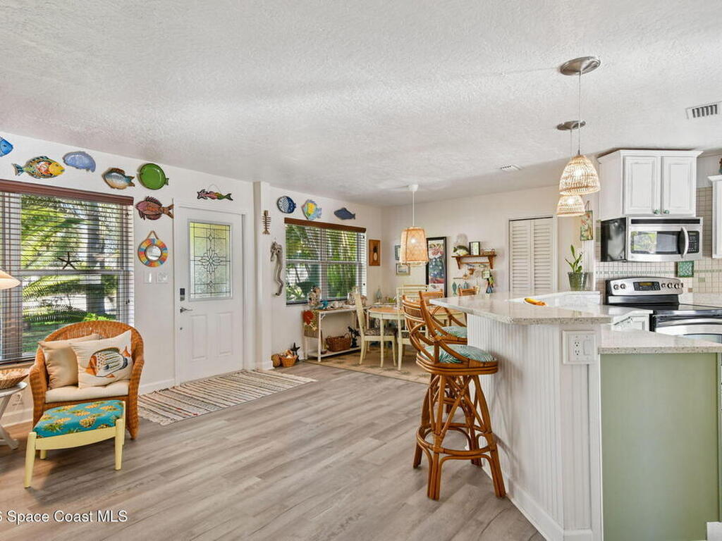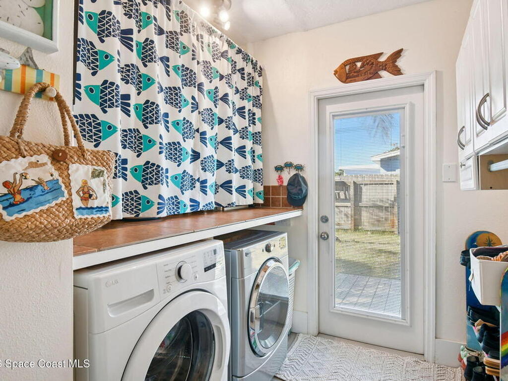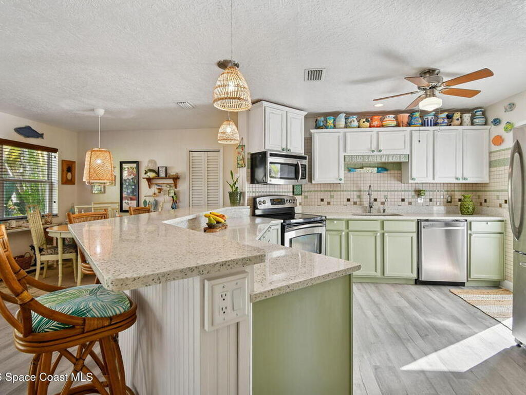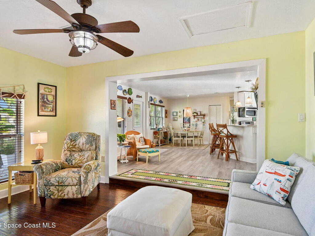 Located just minutes from the ocean, this beautifully updated 3-bedroom, 2-bath Satellite Beach pool home captures the best of relaxed coastal living with exceptional versatility. The spacious primary suite is ideal as a private in-law retreat, featuring a walk-in shower, kitchenette with refrigerator and microwave, king-size sleeping area, closet, and private rear entrance.The backyard is a true island oasis with an inground pool, fire pit, outdoor shower, and lush tropical landscaping accented by fruit trees, gardenias, and night-blooming jasmine--perfect after a beach day. Inside, enjoy an updated kitchen with white quartz countertops, stainless steel appliances, and modern finishes. Major upgrades include a new roof, newer HVAC, and updated washer and dryer.A charming she-shed for hobbies, plus additional storage for gardening and equipment, add flexibility and function. The tropical front yard offers standout curb appeal. Ideal as a full-time residence, multi-generational