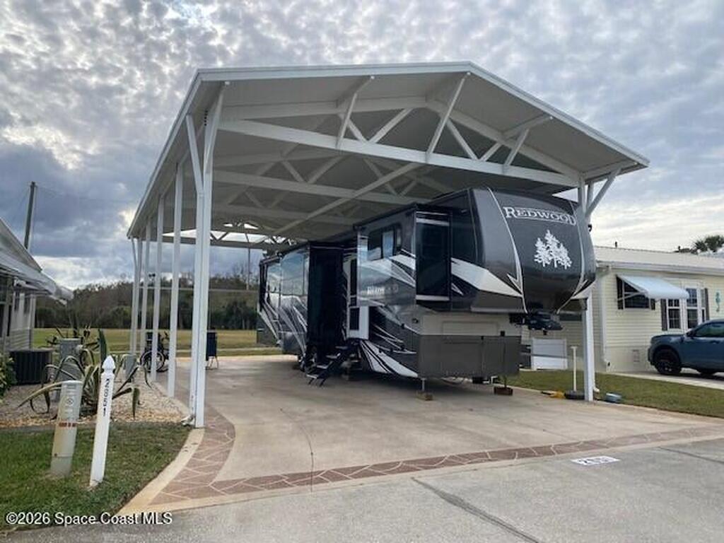 Large lot on the golf course with covered port just waiting for you to pull in with your RV. Enjoy year round or seasonal living in this active 55+ community. Covered Port is 24' x 40' with additional paver patio 24' x 11'. Plenty of space for your RV and vehicles. Motorcycle friendly and space to add a storage building or executive suite under the port. 9 hole executive golf course on property, clubhouse, heated pool, pickleball, and more. Located near beaches, airports, shopping, restaurants, theme parks and more.