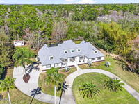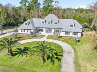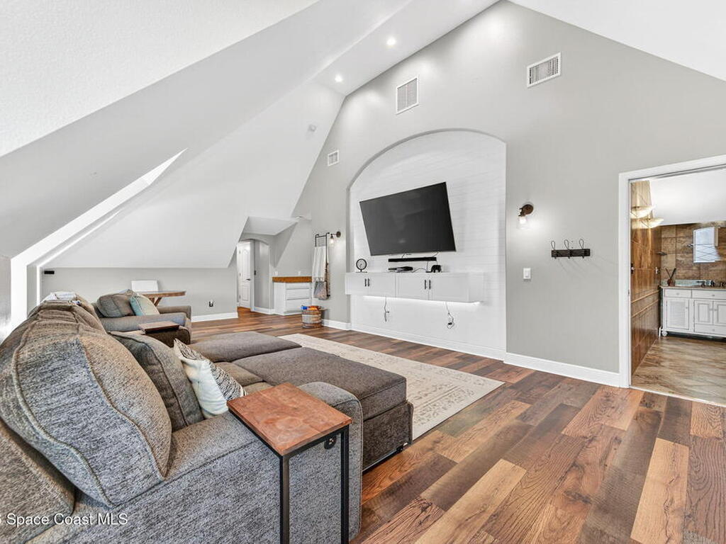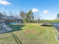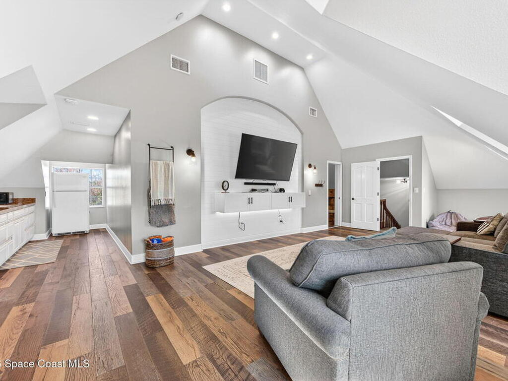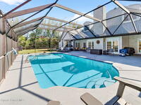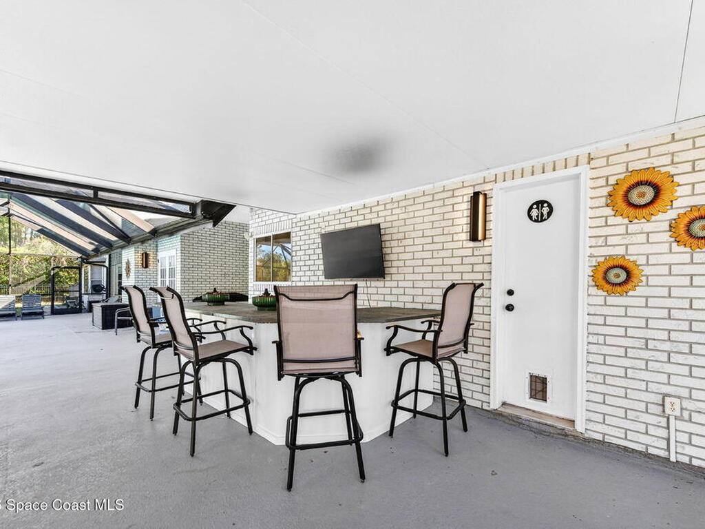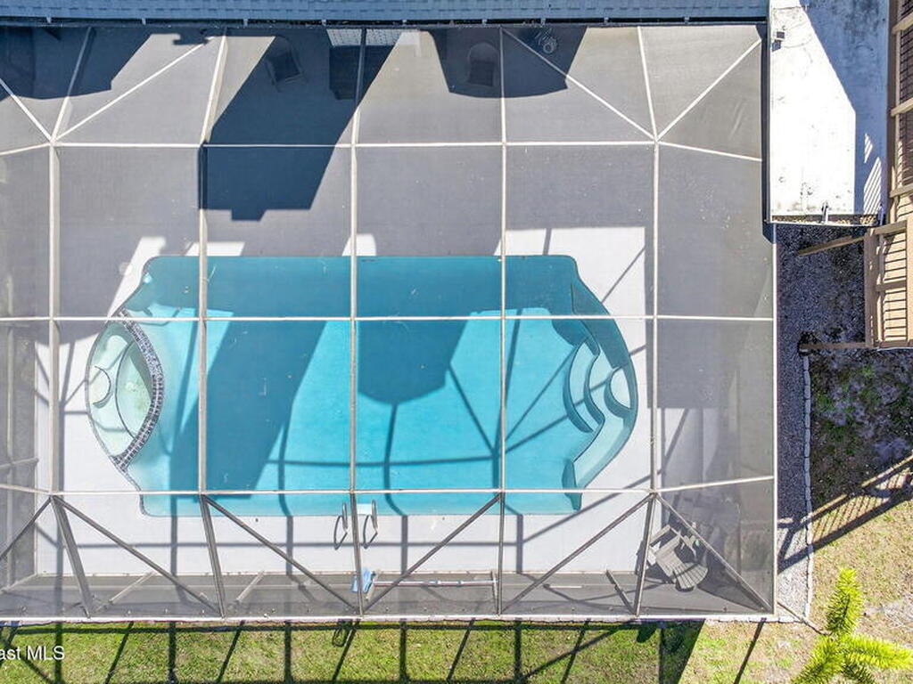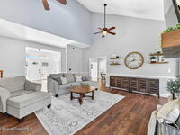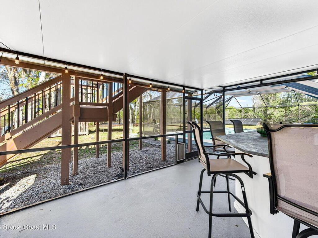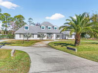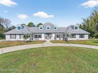 Situated on a 1 acre lot, this 5000+ SF modern farmhouse style pool home is located in the well regarded Rambling Acres subdivision in NW Titusville. The 1st floor offers 4 bedrooms, a formal living room, formal dining room, family room with electric fireplace, updated gourmet eat in kitchen with granite countertops, stainless steel appliances & a beverage fridge plus a mud room & laundry room off of the kitchen with a seperate entrance. The 2nd level includes a family room, kitchenette, game room, 1 bedroom with an ensuite bathroom, an additional full guest bathroom & a private entrance with an exterior deck that overlooks the backyard. Exterior features include a screened in solar heated chlorine pool, fully fenced yard with a shed and a playground backing up to a wooded area where wildlife resides. Under the lanai there is an outdoor entertainment area with a bar. There are so many upgrades to note to include a new roof with solar vents in 2025.
