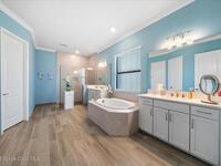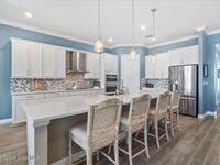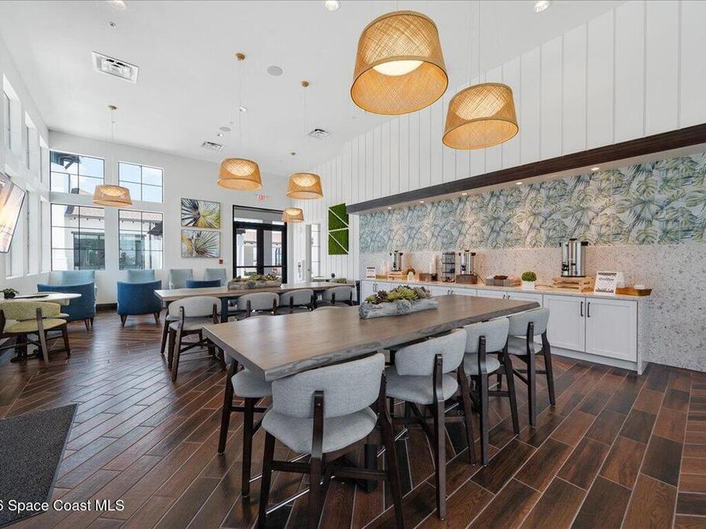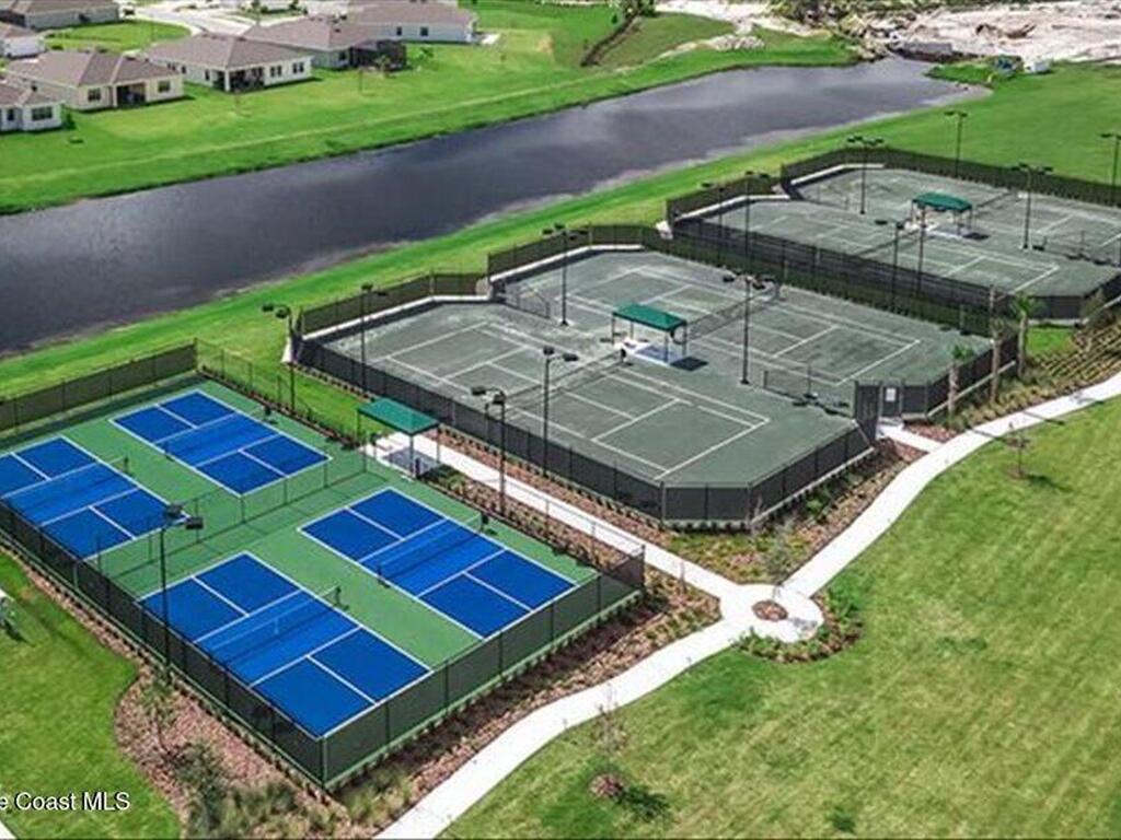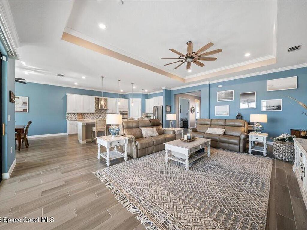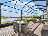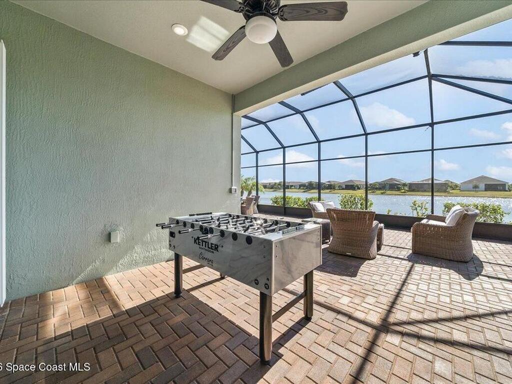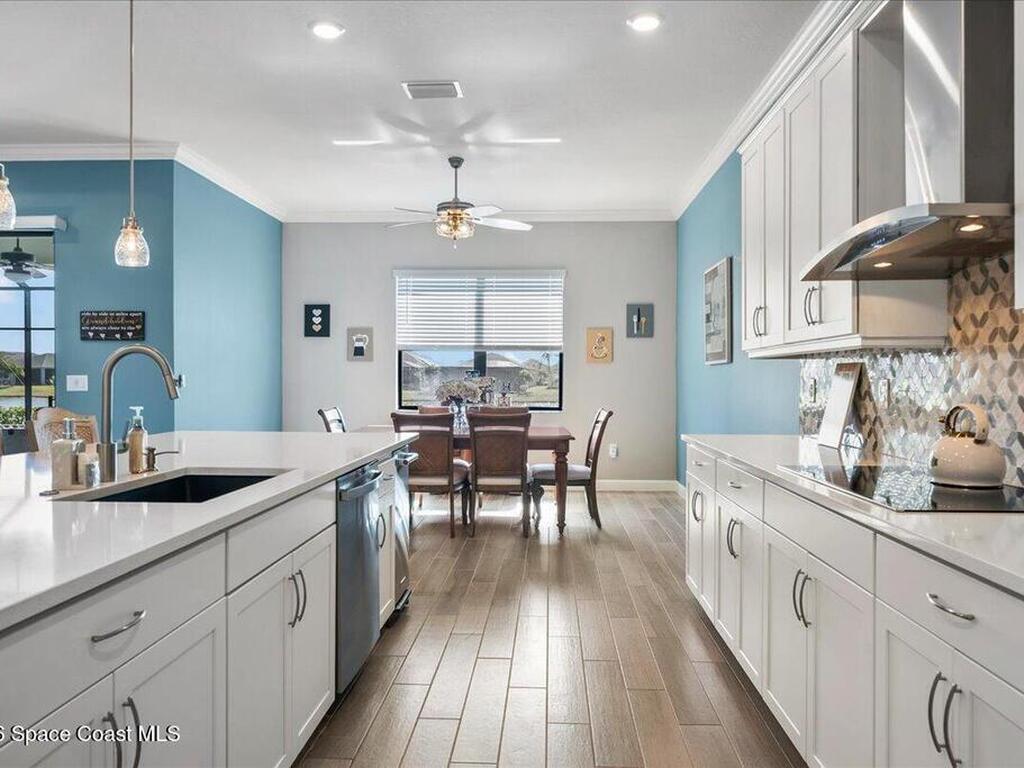 Live like you're on vacation in this better than builder new home on a premium lot close to all the resort like amenities in 55+ Bridgewater at VIera. Quality, tasteful upgrades including wood look tile throughout the bedrooms, tile backsplash, crown molding, vaulted screen patio enclosure, storage cabinets in the laundry room and leaded glass impact front doors.Stunning kitchen has a massive island open to the dining and family room framing incredible views of the lake. The three bedrooms have their own bathrooms and are separated into different wings for privacy. Primary bedroom looks out to the lake and has a spacious ensuite bathroom with large shower. double vanities, walk in closets, and soaking tub. Den or 4th bedroom. Take your golf cart or miles of community sidewalks to the pool, gym, work out rooms, pickleball or tennis courts, or catch a movie in the movie theater. HOA covers lawn maintenance so you can enjoy all Florida living has to offer. Minutes to the beach and I-95