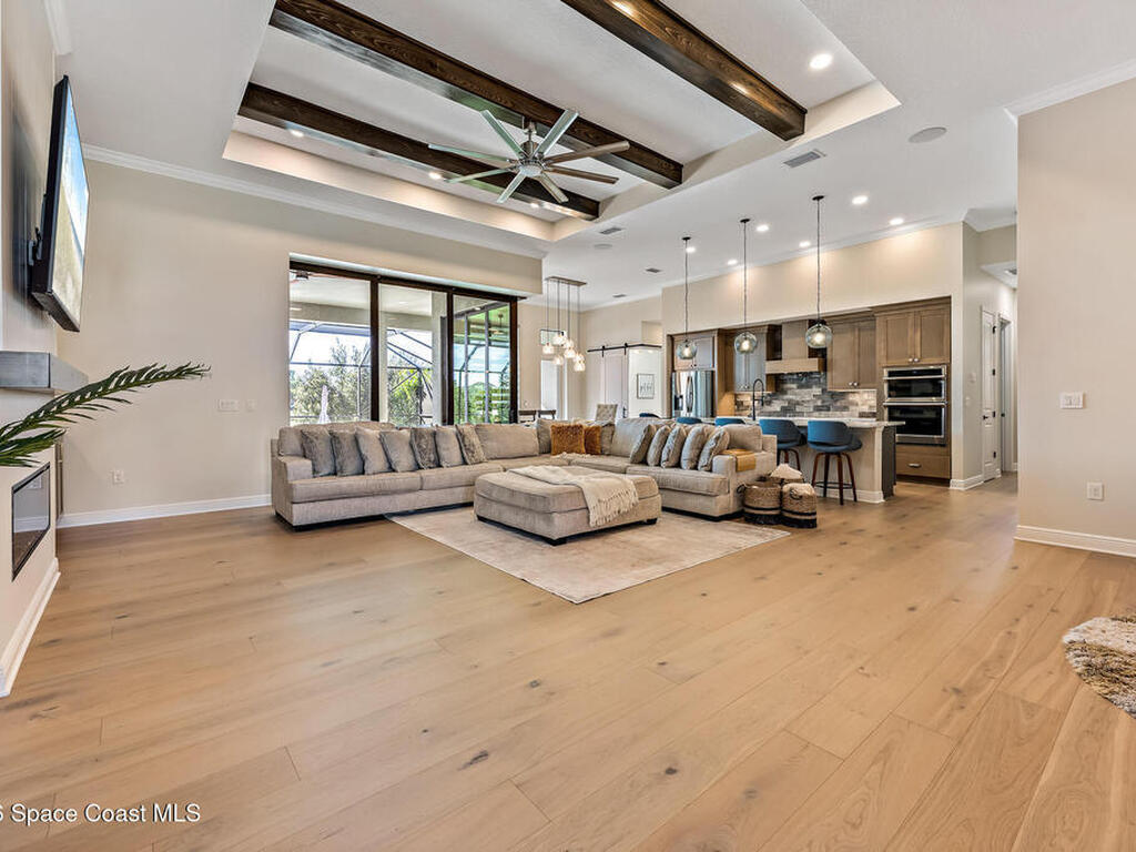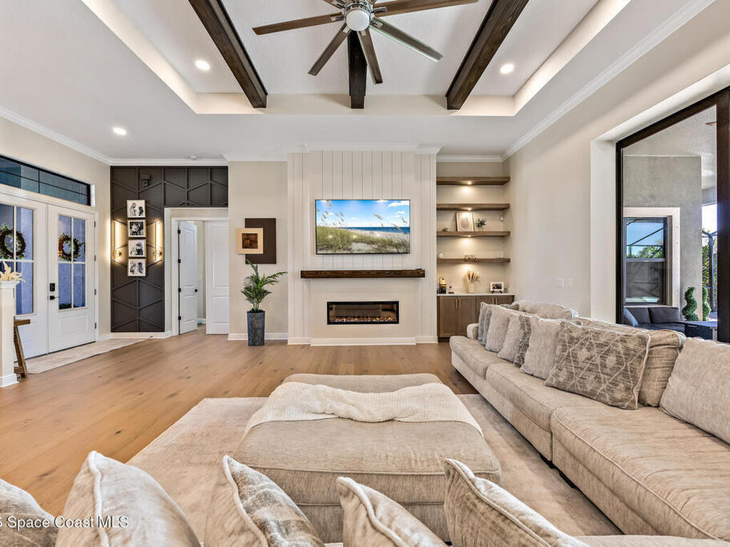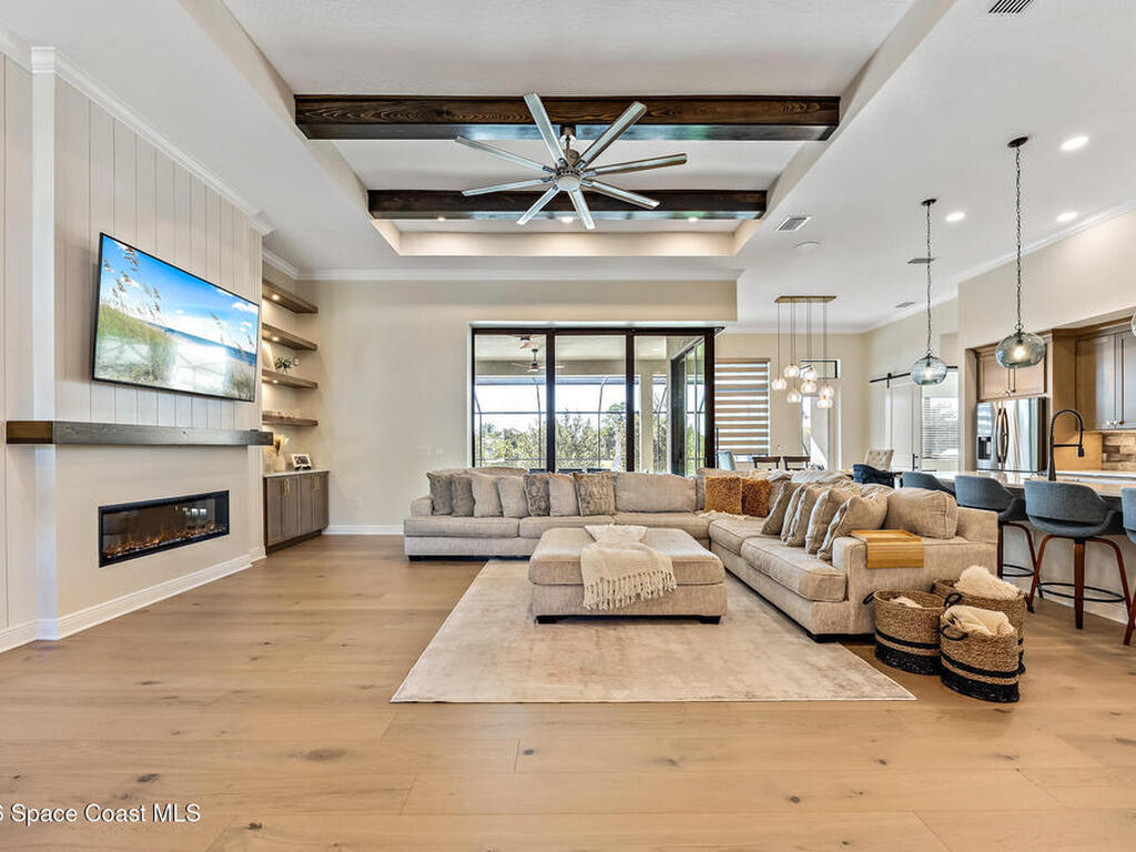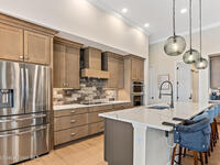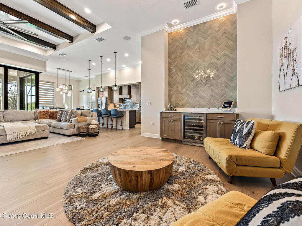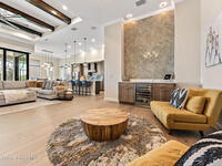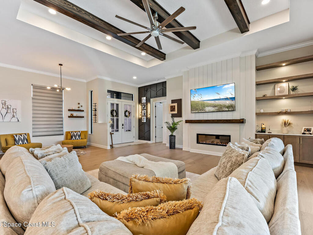 Step into modern luxury in this stunning 2023-built 4 bedroom, 3 bath home, thoughtfully designed for today's lifestyle. From the moment you arrive, you'll notice the attention to detail--the expansive living area showcases soaring 12 Foot ceilings, a custom fireplace wall with accent shelving, decorative feature walls, and built-in lighting, along with tray ceilings and wood beams in both the living room and primary suite. A beautifully appointed custom bar and sitting area adds another layer of luxury with a decorative tile wall, custom cabinetry, and Level 3 quartz--perfect for entertaining guests in style. Inside, the home delivers an impressive blend of style and functionality with 8' doors throughout, wood flooring in main areas, and custom tile in all wet spaces. The heart of the home is the chef's kitchen, featuring custom designed cabinetry, built-in stainless steel appliances,