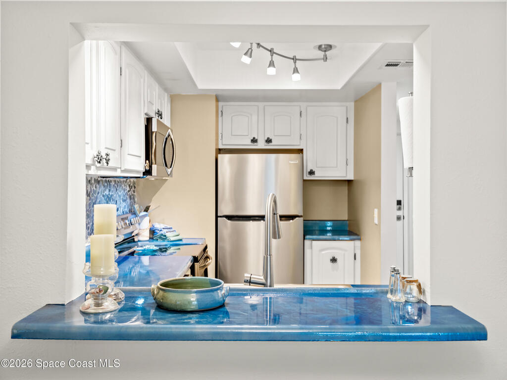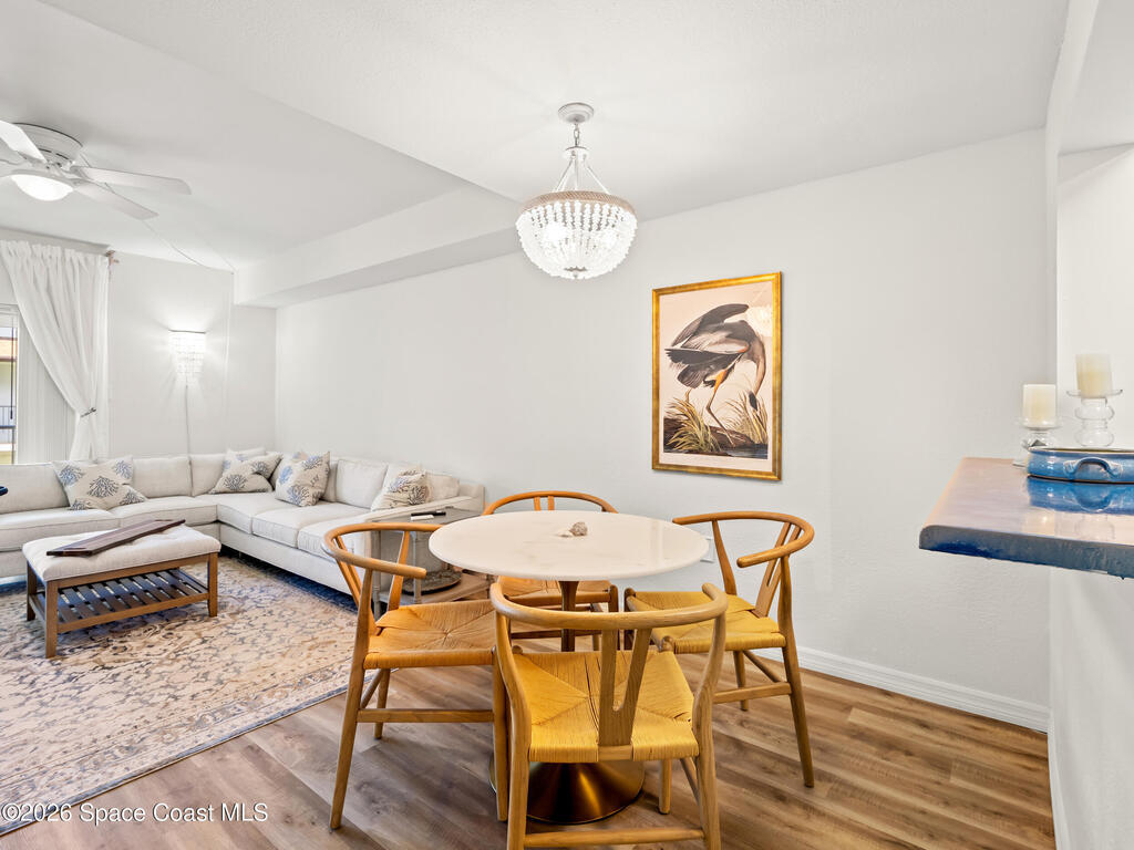 Wake up to ocean breezes in this beautifully updated 2-bedroom, 2.5-bath, two-story condo located in an oceanfront community in Satellite Beach. This unit offers peek-a-boo ocean views from the balcony and primary bedroom and is fully furnished and move-in ready. The entry level features LVP flooring, a stylish powder room with shiplap walls and Serena & Lily wallpaper, and a well-appointed kitchen with stainless steel appliances and a stackable washer and dryer, plus balcony access for coastal air. Upstairs are two spacious bedrooms, each with en-suite bathrooms and continued LVP flooring. Additional highlights include a newer A/C, all assessments paid, a heated community pool, and pet-friendly policies allowing larger dogs. Rentals are permitted for as short as one month, offering excellent flexibility. Condo dues include insurance, exterior maintenance, water, sewer, trash, cable, and high-speed internet, making ownership simple and carefree in this desirable beachside setting.
