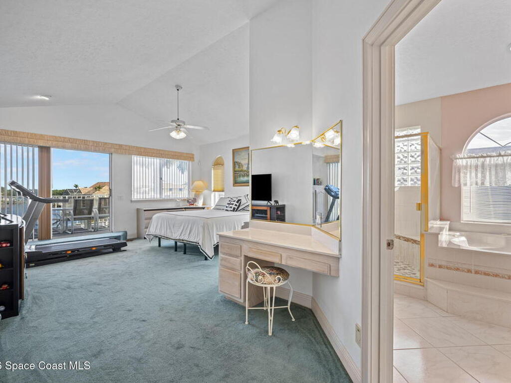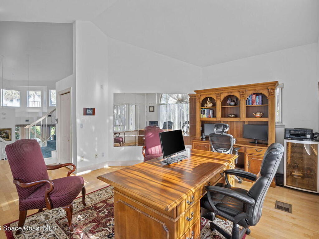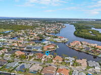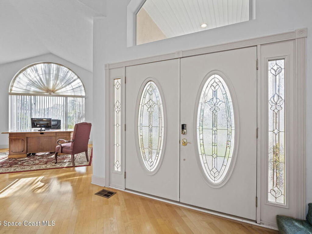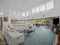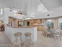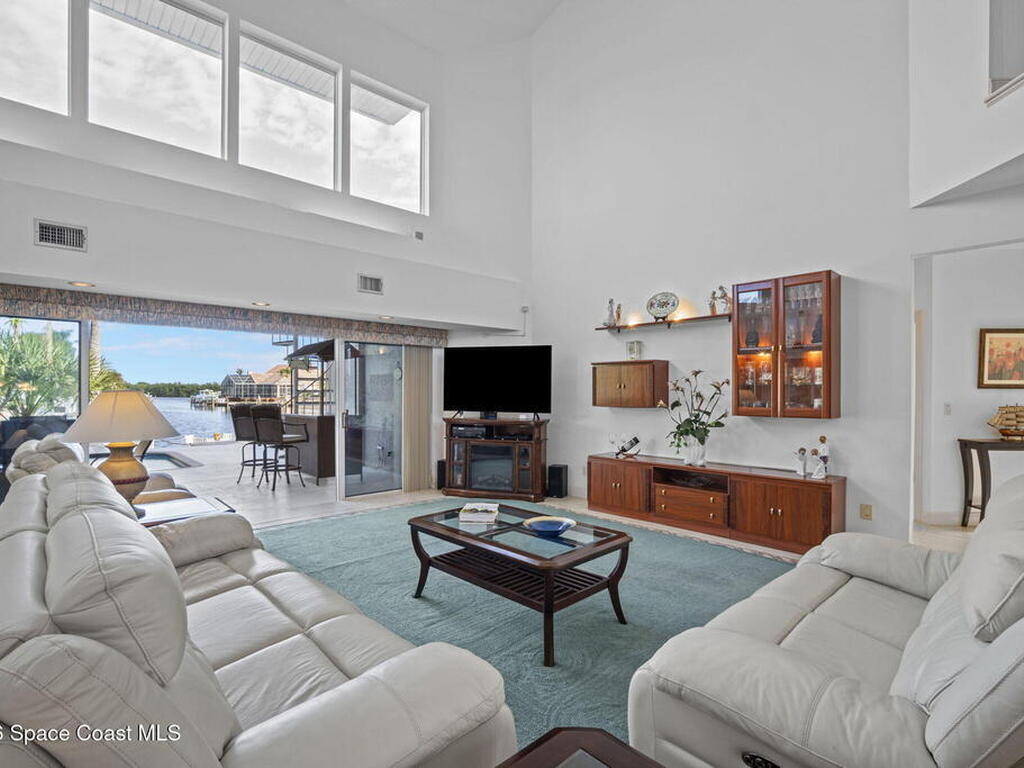 Located in the heart of Central Merritt Island on a deepwater canal with easy access to the Banana River, Indian River, and Atlantic Ocean, this waterfront home offers the ideal coastal lifestyle. The neighborhood features manicured landscaping, sidewalk-lined streets, and quiet dead-end roads. 1994 Sykes Creek Drive is grand and extremely well maintained. Inside, soaring 20-foot ceilings and a spacious family room are perfect for entertaining. The expansive kitchen offers ample counter space, storage, and beautiful Sykes Creek views. Natural light pours in through walls of windows and a dramatic oversized slider, creating seamless indoor-outdoor living. Step outside to a tropical backyard with covered lanai, pool with spillover spa, outdoor kitchen, generous seating areas, and a private dock just steps away. Water views continue in the primary suite with vaulted ceilings, private balcony, and spa-like bath ready for your personal touch. Three additional bedrooms share two full baths!