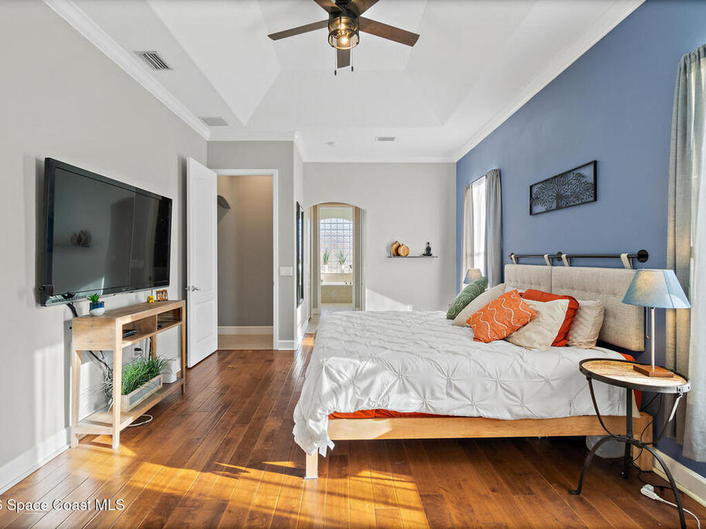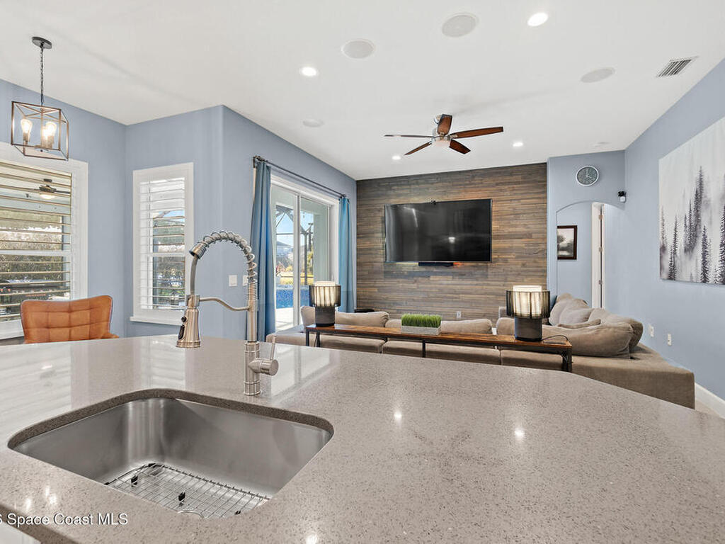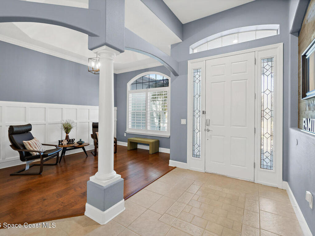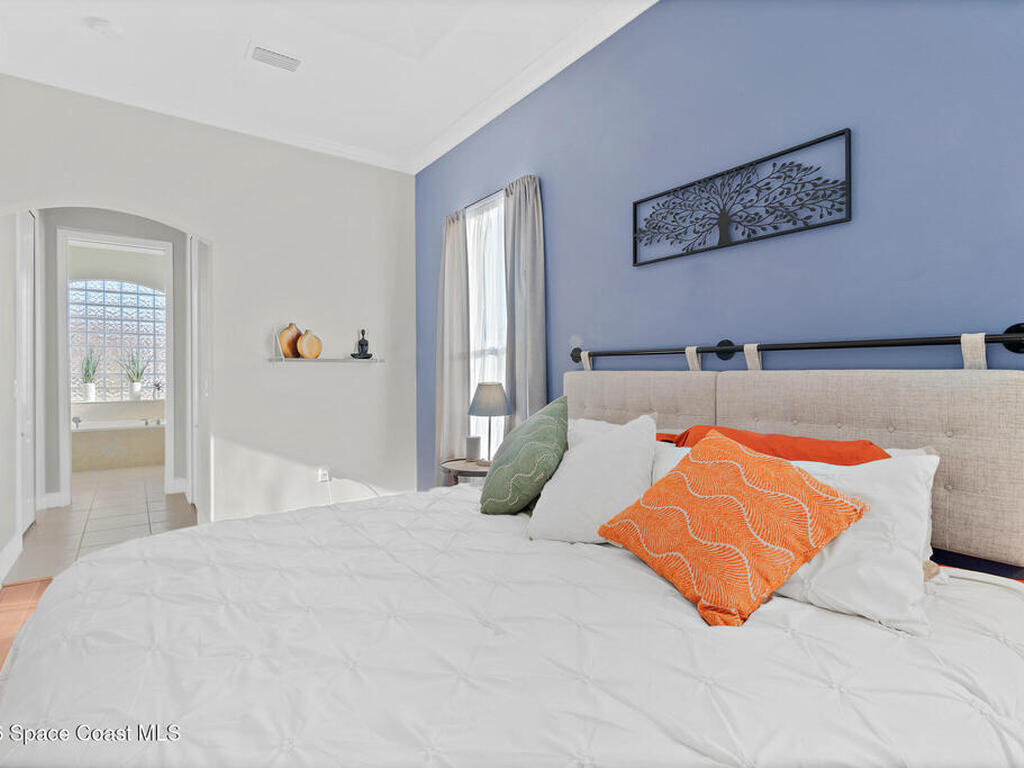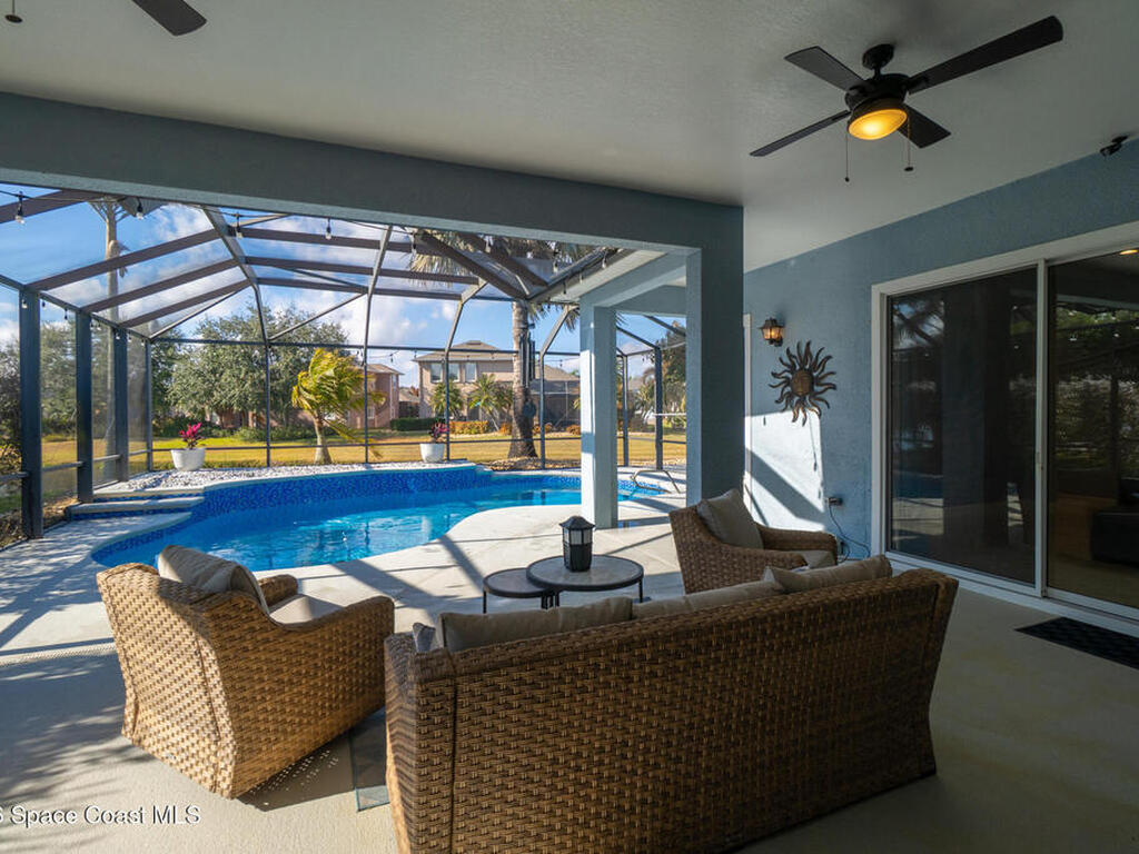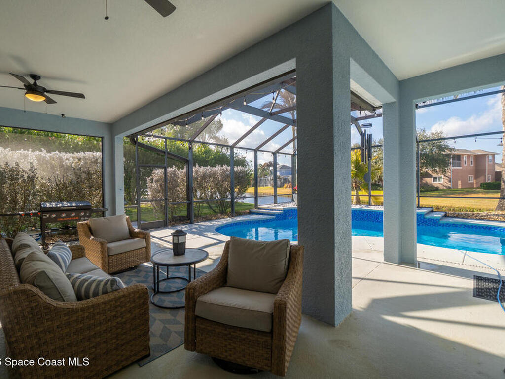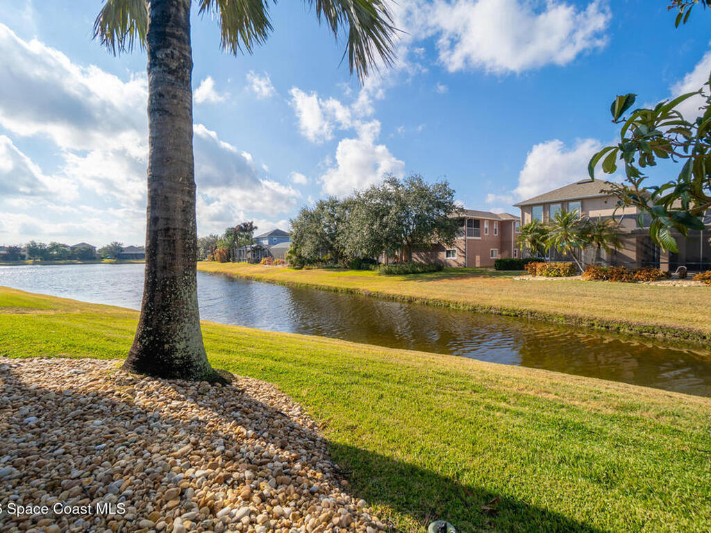 Transferable VA loan--ask for details on the approx. 2.75% INTEREST RATE! Welcome to this beautifully updated, lakefront pool home located in the gated Sunstone community of Viera. This 4-bedroom, 3-bath home with an upstairs BONUS ROOM blends timeless design with modern updates throughout. Recent improvements include fresh interior and exterior paint, an updated kitchen, and a recently resurfaced saltwater, solar-heated pool, creating a truly move-in-ready home. The open floor plan is filled with natural light and features tray ceilings, crown molding, 8-foot doors, and generous living spaces ideal for everyday living and entertaining. The oversized primary suite offers a sitting area perfect for a home office or flex space, dual walk-in closets, and a spa-style bath. Step outside to a screened lanai with a saltwater, solar-heated pool, summer kitchen, and tranquil lake views. Notable updates include roof (2018), upstairs A/C (2020), and downstairs A/C (2025).