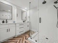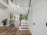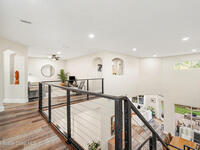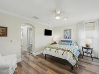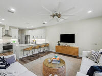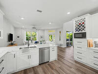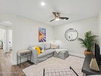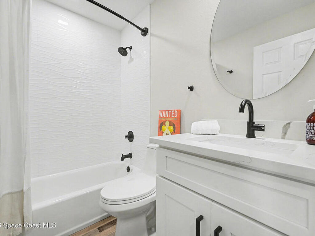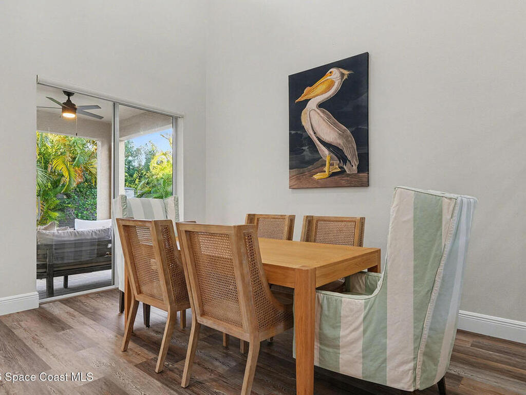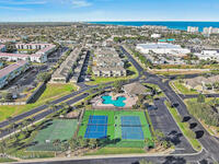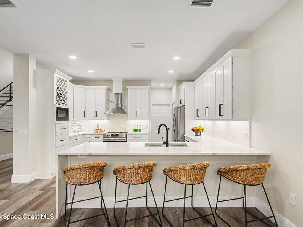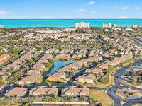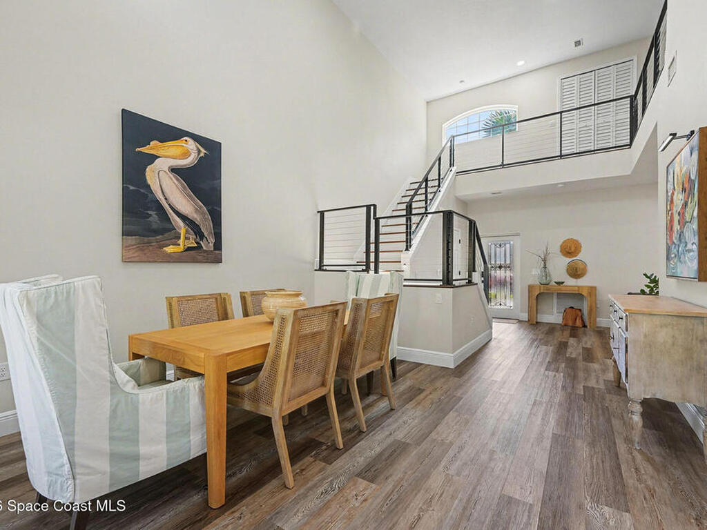 Gorgeous fully renovated end unit perfectly situated beachside gated community of Oceanside Village, offering resort-style amenities including pool, clubhouse, tennis, and basketball courts. This modern home features an open concept layout with a newly designed kitchen showcasing quartz countertops with waterfall edges and backsplash, under-cabinet lighting and newer stainless appliances. Luxury plank flooring, 7 inch baseboards throughout, hardwood stairs. All bathrooms have been tastefully updated with high-end finishes. Designer staircase & railing open the space and draw in natural light to the upstairs loft, ideal as a second family room or office. Updates include 2020 roof, newer air handlers, UV low-E impact glass windows upstairs for efficiency, fresh interior paint, new exterior paint, and custom blinds throughout. Building and flood insurance, roof replacement, exterior painting, landscape, grass, tree and shrubbery maintenance, irrigation, community amenities and security.