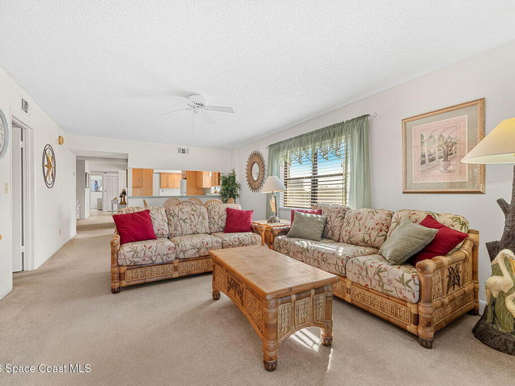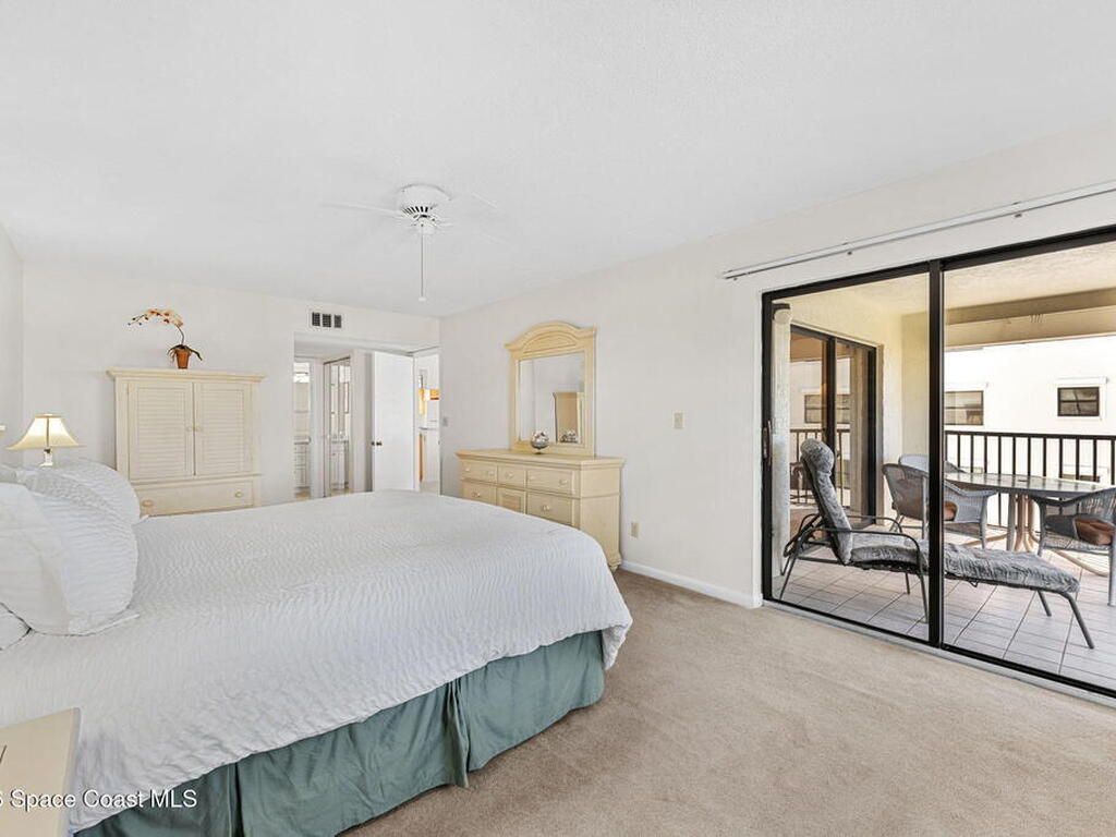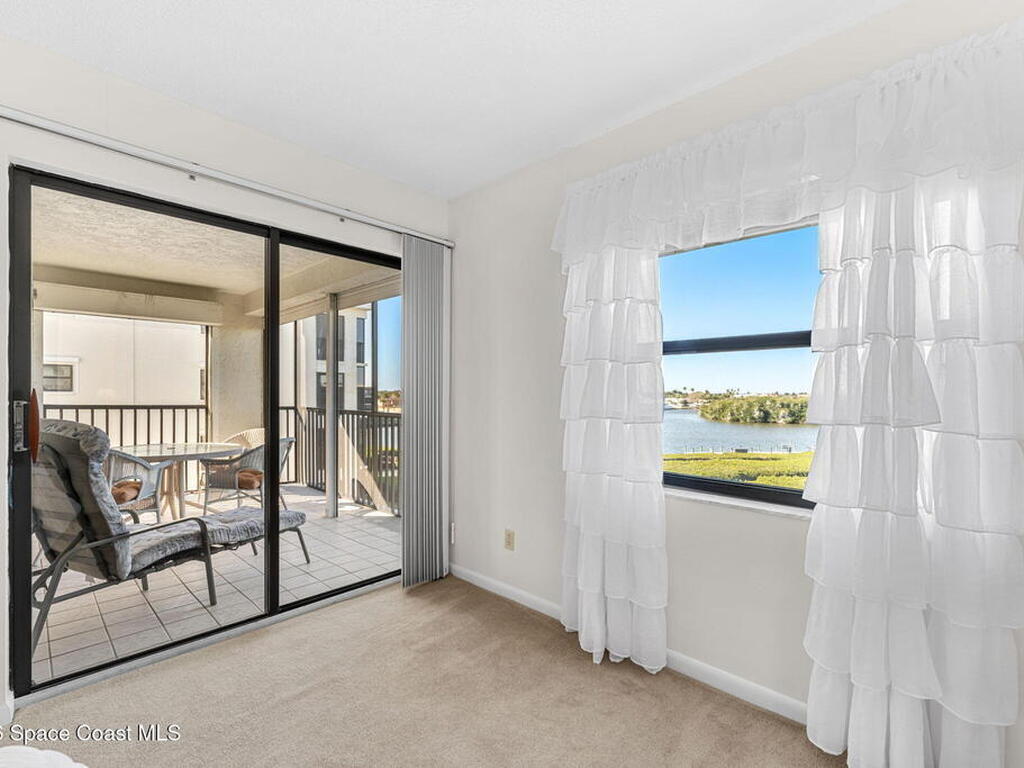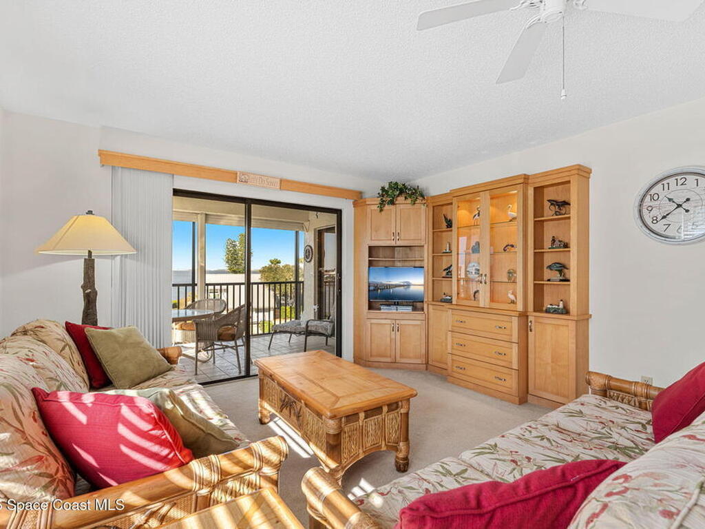 Rarely available 3-bedroom, 2-bath residence in Fountain Cove--an exceptional find in Cocoa Beach. Lovingly maintained as a second home, this fourth-floor unit offers custom wood cabinetry and Corian countertops in both the kitchen and baths, complemented by matching custom built-ins in the living room. Plush carpeting creates comfortable retreats in each bedroom. Enjoy sweeping Banana River views from the private balcony and the primary suite, where dual closets lead into a well-appointed en-suite bath. The balcony has recently completed restoration and is equipped with shutters for added peace of mind. Fountain Cove offers an inviting waterfront lifestyle with a pool, clubhouse, shuffleboard, river access, and car wash station. A deeded private one-car garage plus ample open parking complete this special offering.