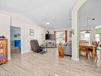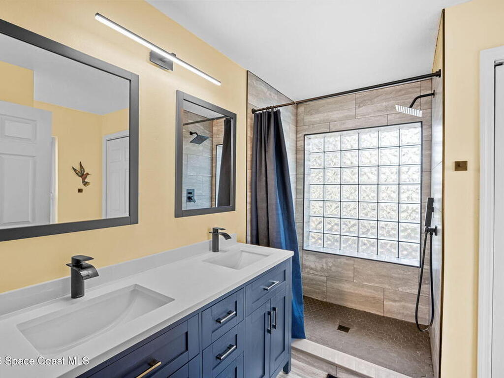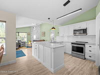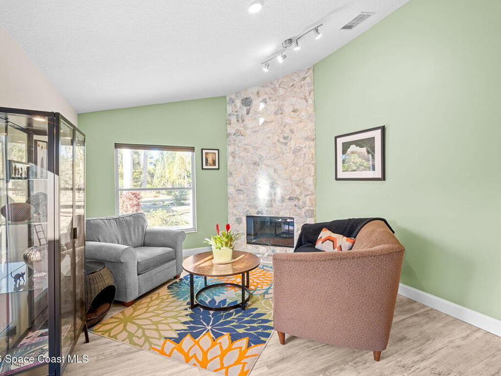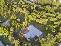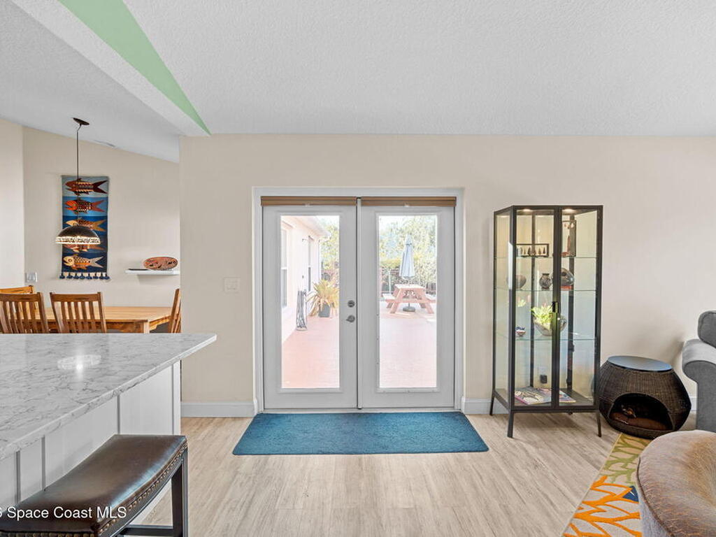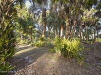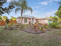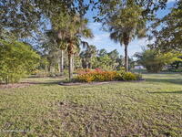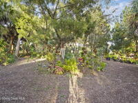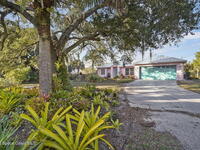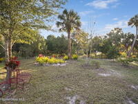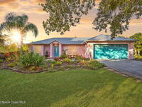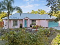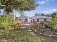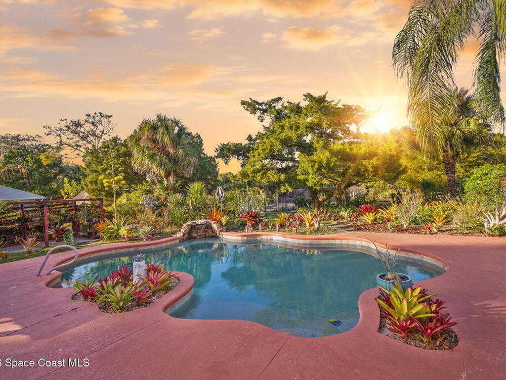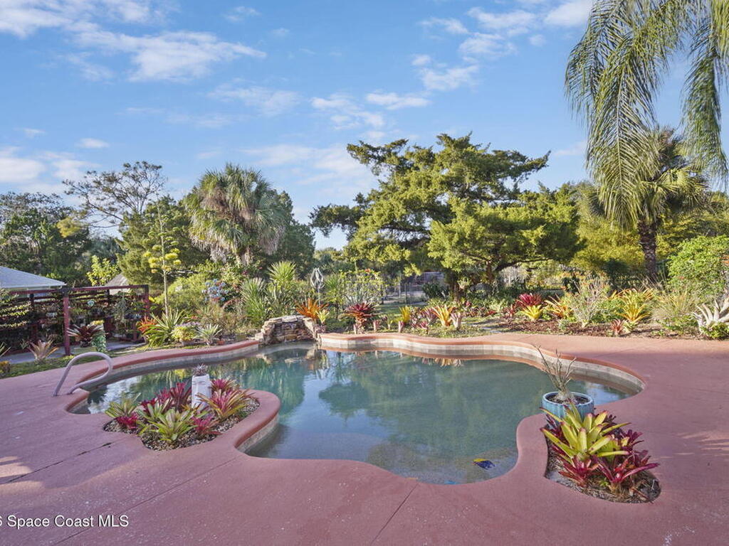Garden, raise animals, or relax poolside. This unique two-acre retreat has it all. Sunlight pours through large windows, highlighting an open, easy floor plan with seamless luxury vinyl throughout. The spacious primary suite features a walk-in closet and a beautifully updated bath. The remodeled kitchen shines with newer appliances, new counters, sink, disposal, and a breakfast bar. French doors lead to a lush, tropical pool oasis with a covered shade house--perfect for lounging or showcasing plant collections. Imagine floating in the pool while watching rocket launches overhead. Enjoy peace of mind with a newer AC and newer appliances. Wander through winding paths on the second acre, complete with benches for wildlife viewing in your own private park. The property boasts fruit trees, gingers, bromeliads, plumeria, native plants, and mature oaks and cedars for shade. A rare, versatile paradise full of possibility. 2018 roof, 2023 AC, PEX water lines, shutters, termite bond.