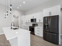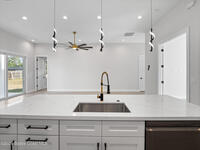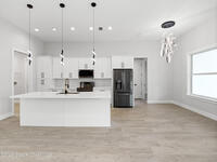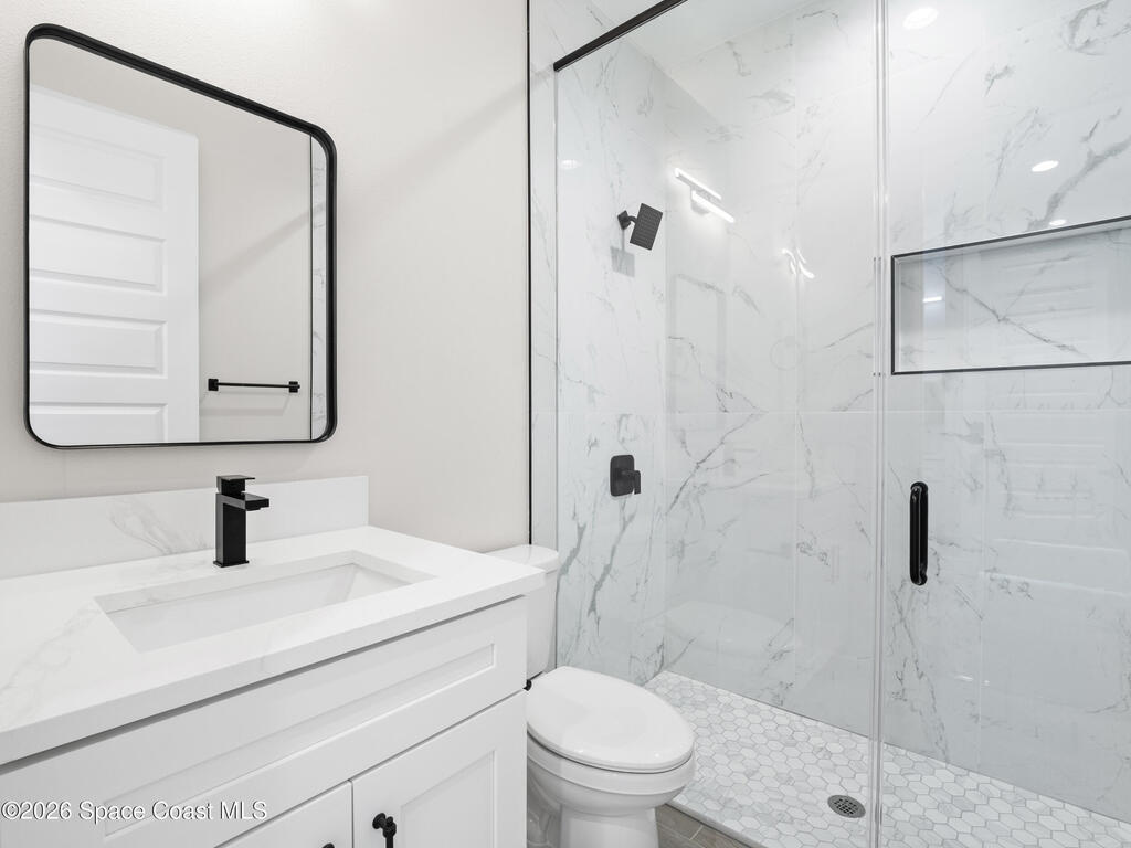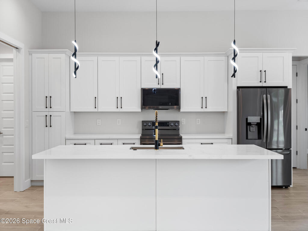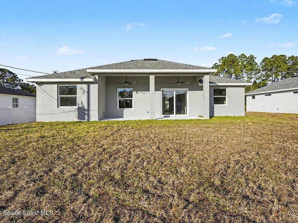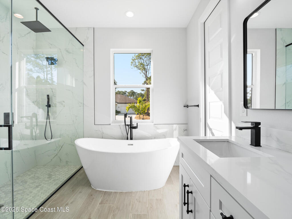 Impeccable craftsmanship and sophisticated design in the heart of Palm Bay, Florida. This stunning home embodies the essence of understated luxury, offering a serene retreat that blends modern high-end finishes with the relaxed atmosphere of the Space Coast. Every detail has been thoughtfully curated to provide a living experience that is both grand and inviting. The kitchen is anchored by a sprawling center island, perfect for entertaining or casual dining. This residence features lustrous quartz countertops not just in the kitchen, but carried seamlessly throughout the home, creating a cohesive aesthetic of elegance. Pristine tile flooring runs throughout the entire property, offering a cool, hypoallergenic, and sophisticated foundation that enhances the open, airy feel of the living spaces. The primary suite is a true sanctuary of relaxation. The en-suite bathroom rivals a high-end spa, featuring a grand walk-in shower equipped with dual rain shower heads, and a stand-alone bathtub