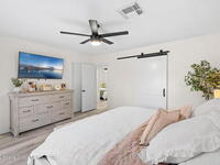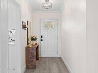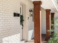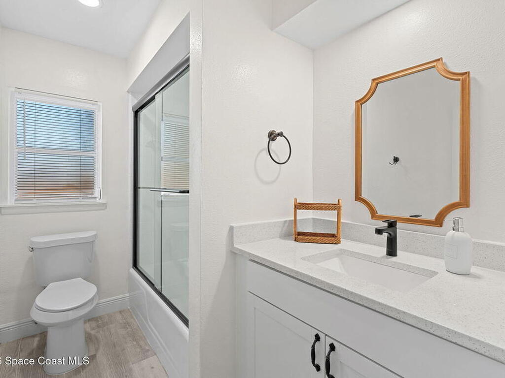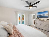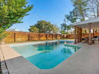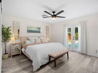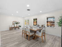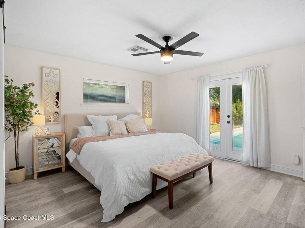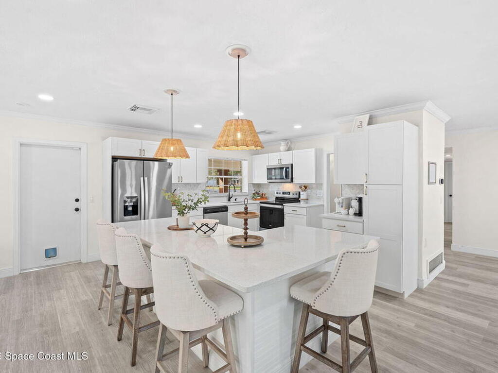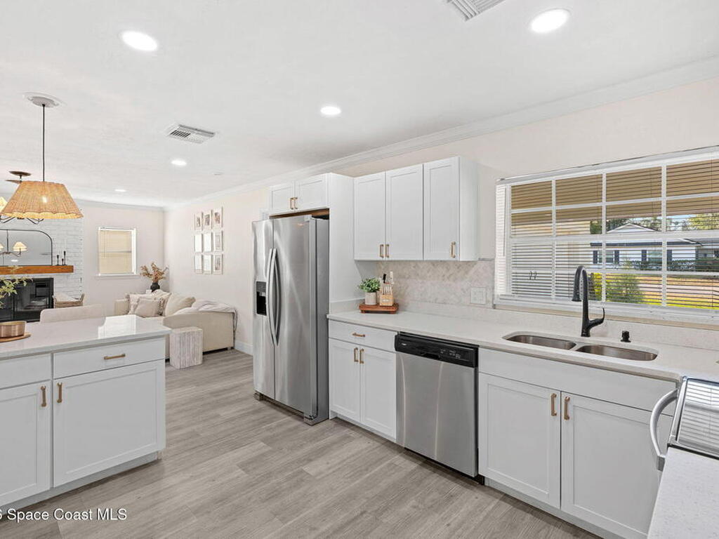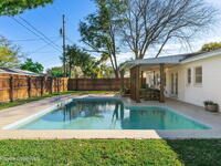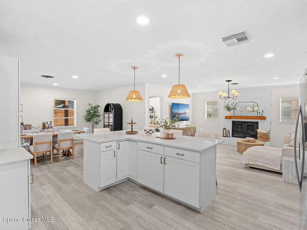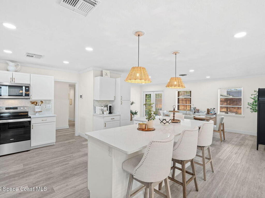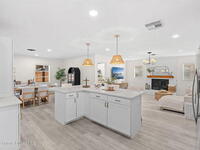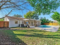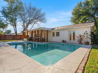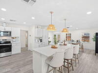 Situated on a desirable corner lot in the lovely English Estates, this beautifully remodeled 4BR / 2BA home blends style with comfort. An open floor plan, LVP flooring throughout (no carpet), and abundant windows create a bright, airy atmosphere filled with natural light. At the heart of the home is a stunning eat-in kitchen with quartz countertops, Whirlpool appliances, and a spacious L-shaped island accented by woven pendant lighting; perfect for entertaining or casual meals. The cozy living room invites you to unwind with an authentic masonry wood-burning fireplace. The primary suite offers a serene retreat with an en-suite bath offering marble countertops and flooring, along with a sleek porcelain tiled glass-door shower. The fourth bedroom has been converted into a generous primary closet and can easily be reverted to a bedroom if desired. French doors lead to the privately fenced-in backyard; enjoy al fresco dining under the covered lanai or take a dip in the sparkling pool.
