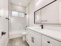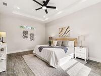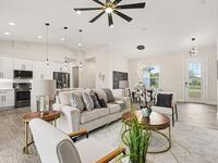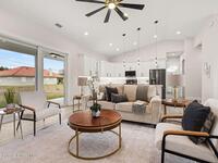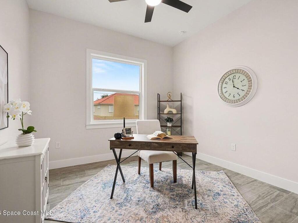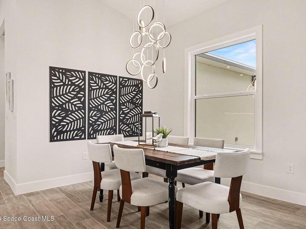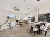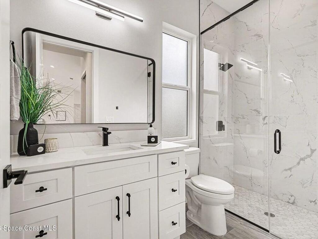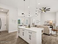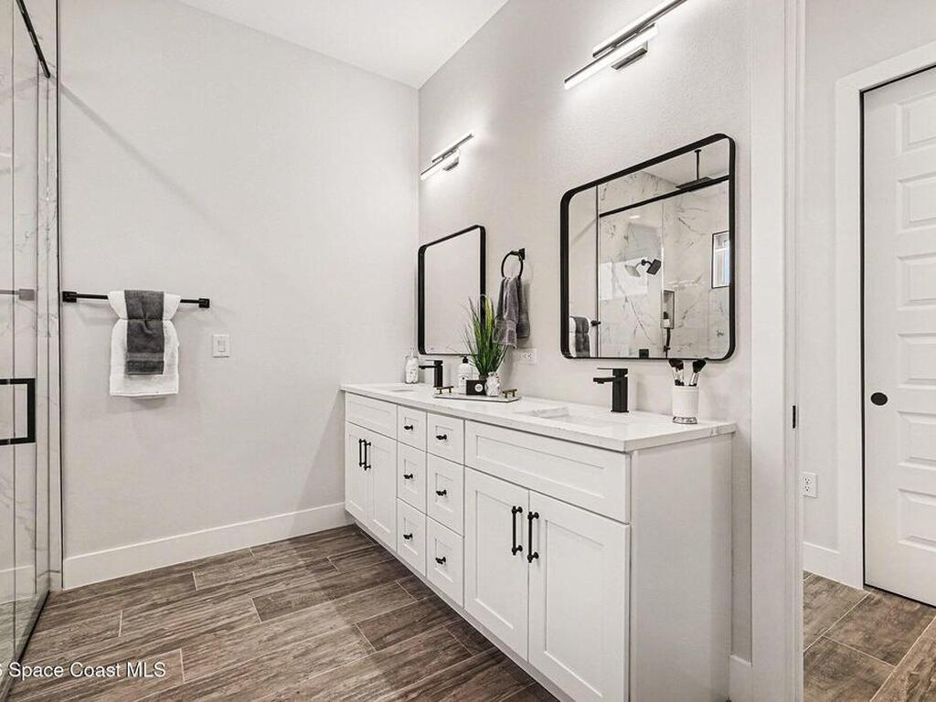 This stunning 4-bedroom, 3-bathroom residence embodies the essence of understated luxury, offering a serene retreat that blends modern high-end finishes with the relaxed atmosphere of the Space Coast. Every detail has been thoughtfully curated to provide a living experience that is both grand and inviting. At the heart of the home lies a gourmet kitchen anchored by a sprawling center island, perfect for entertaining or casual dining. The residence features lustrous quartz countertops not just in the kitchen, but carried seamlessly throughout the home, creating a cohesive aesthetic of elegance. Pristine tile flooring runs throughout the entire property. The primary suite is a true sanctuary of relaxation. The en-suite bathroom rivals a high-end spa, featuring a deluxe grand walk-in shower equipped with dual rain shower heads.