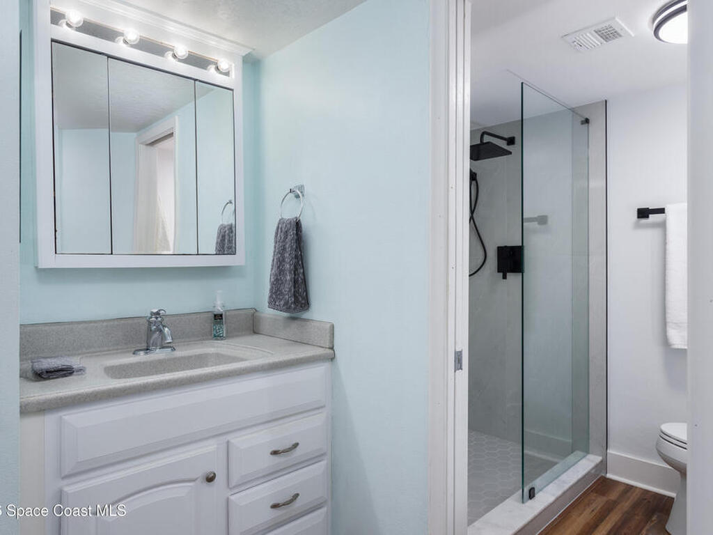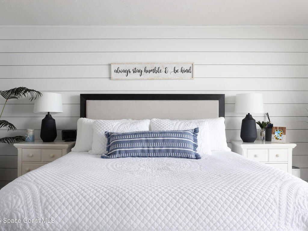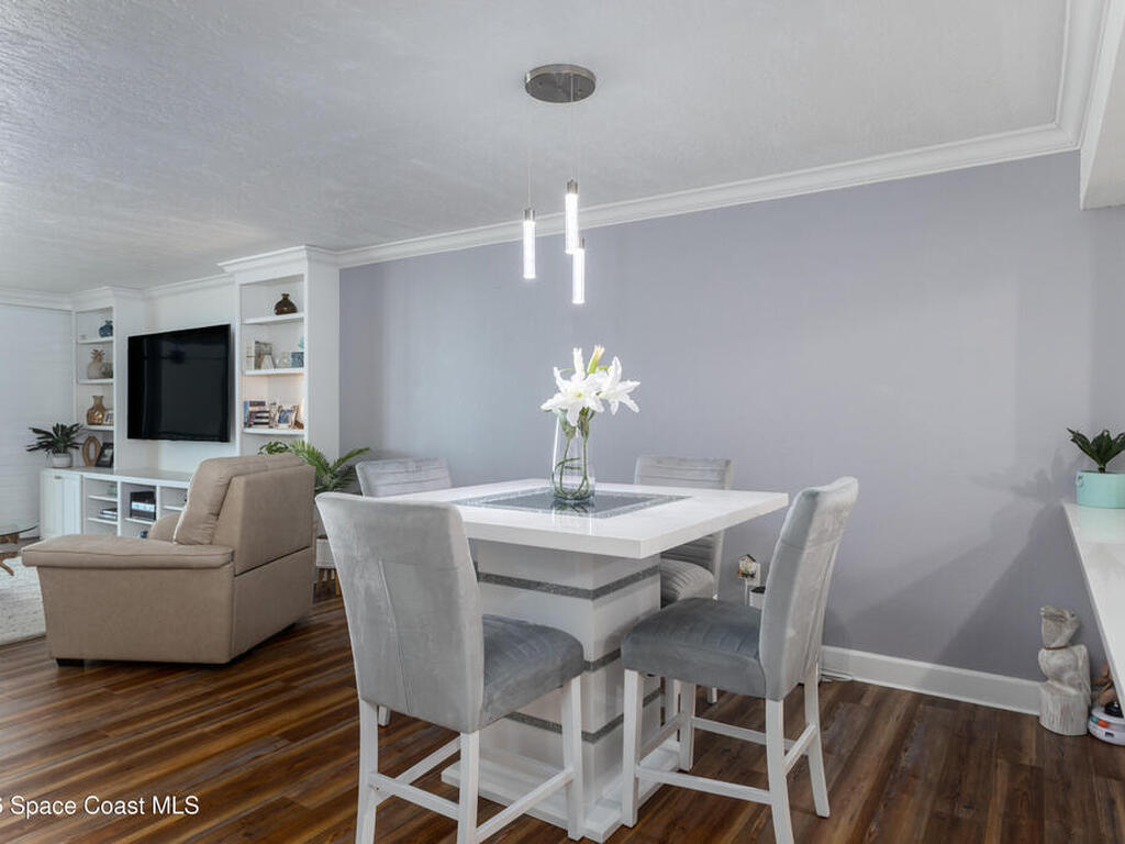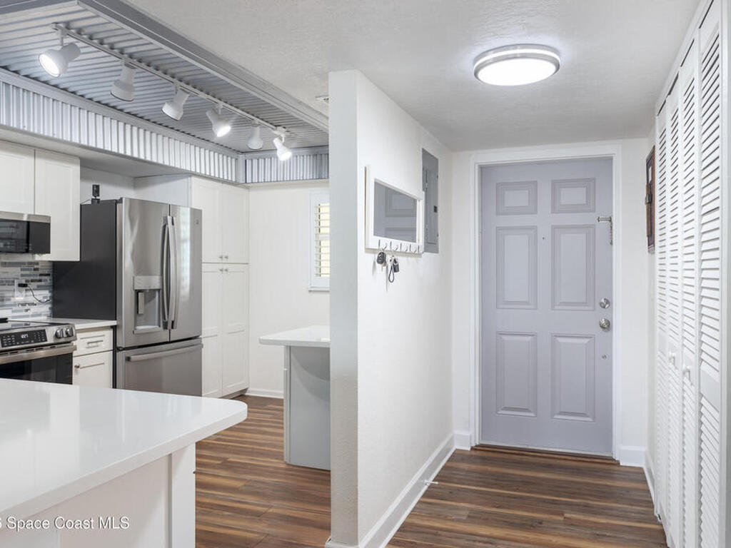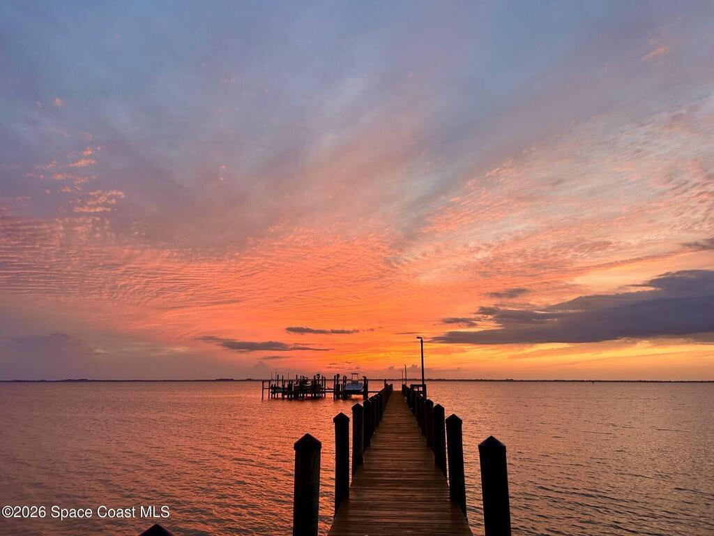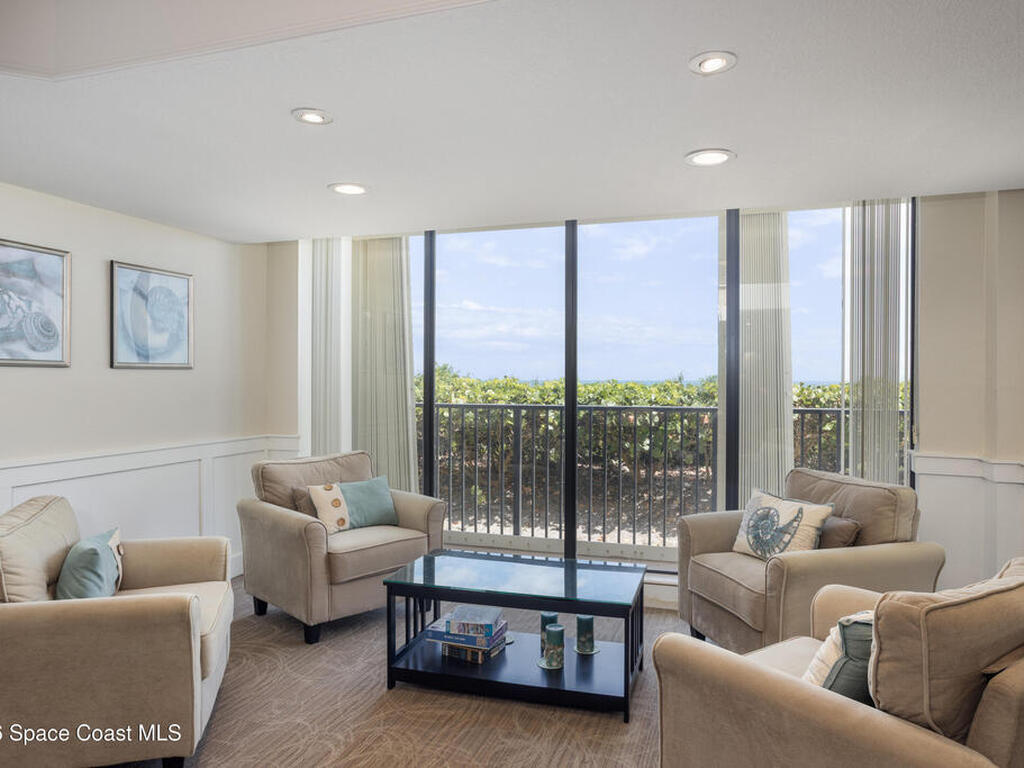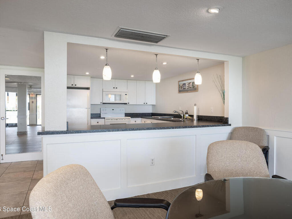 The view says it all in this immaculate unit with a private garage, located in the highly desirable Waters Edge oceanfront condominium on Crescent Beach. Enjoy the ultimate in beachside living with breathtaking river sunsets, ocean sunrises, rocket launches, and sweeping coastal views. This beautifully upgraded unit features a modern kitchen with quartz countertops, tile backsplash, new stainless steel appliances, and a metal tray ceiling, stylish primary suite with a shiplap accent wall, double vanities and walk-in closet with barn door. The spacious living and dining area has a custom built-in entertainment center and opens to a tiled balcony showcasing spectacular ocean views. Additional highlights include impact sliders in both the master suite and living/dining area, vinyl plank flooring throughout and plantation shutters. HOA includes a heated pool and spa, community room, gated dock with deeded slips, kayak launch, and pet-friendly allowing 2 pets no size restrictions.