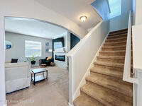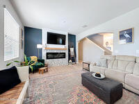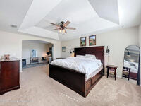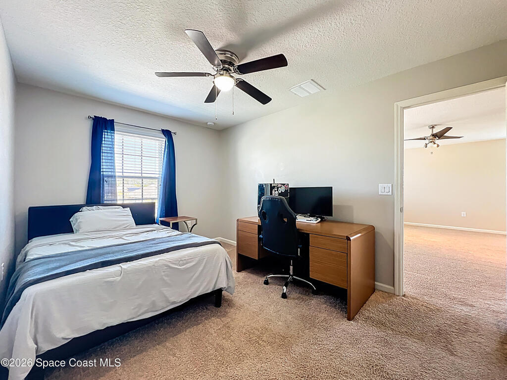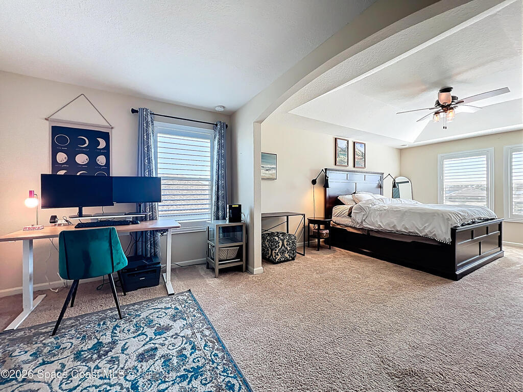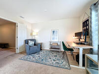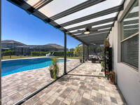 Situated on a .35-acre lot in a highly sought-after community, this spacious pool home offers a balanced layout ideal for everyday living and entertaining. The main level features an open kitchen, living, and dining area, a conveniently located laundry room, and a bedroom currently used as an office. Upstairs includes four bedrooms, three full bathrooms, and a secondary living area ideal for a media or playroom. The primary suite offers a generous sitting area, a custom barn door leading to spacious his-and-hers closets, and a spa-like en-suite bath with a relaxing garden tub. The fully fenced backyard features a saltwater pool and ample space for gatherings or relaxation. A screened-in patio provides year-round enjoyment while overlooking the water. Recent updates include a new roof (2023), AC (2023), and fresh exterior paint. Resort-style amenities include a pool, playground, tennis courts, and a fitness area. Don't miss the opportunity to make this home yours.