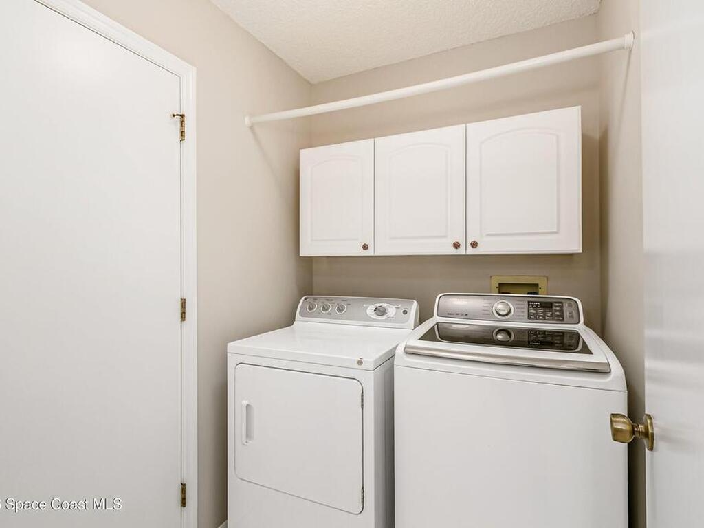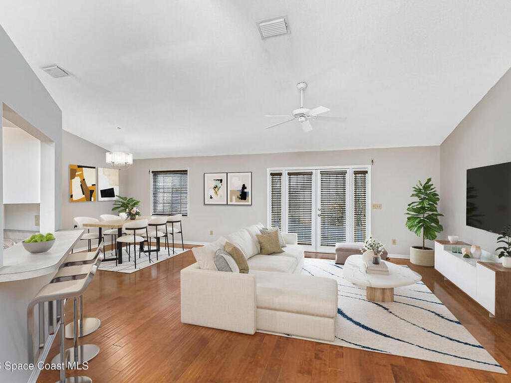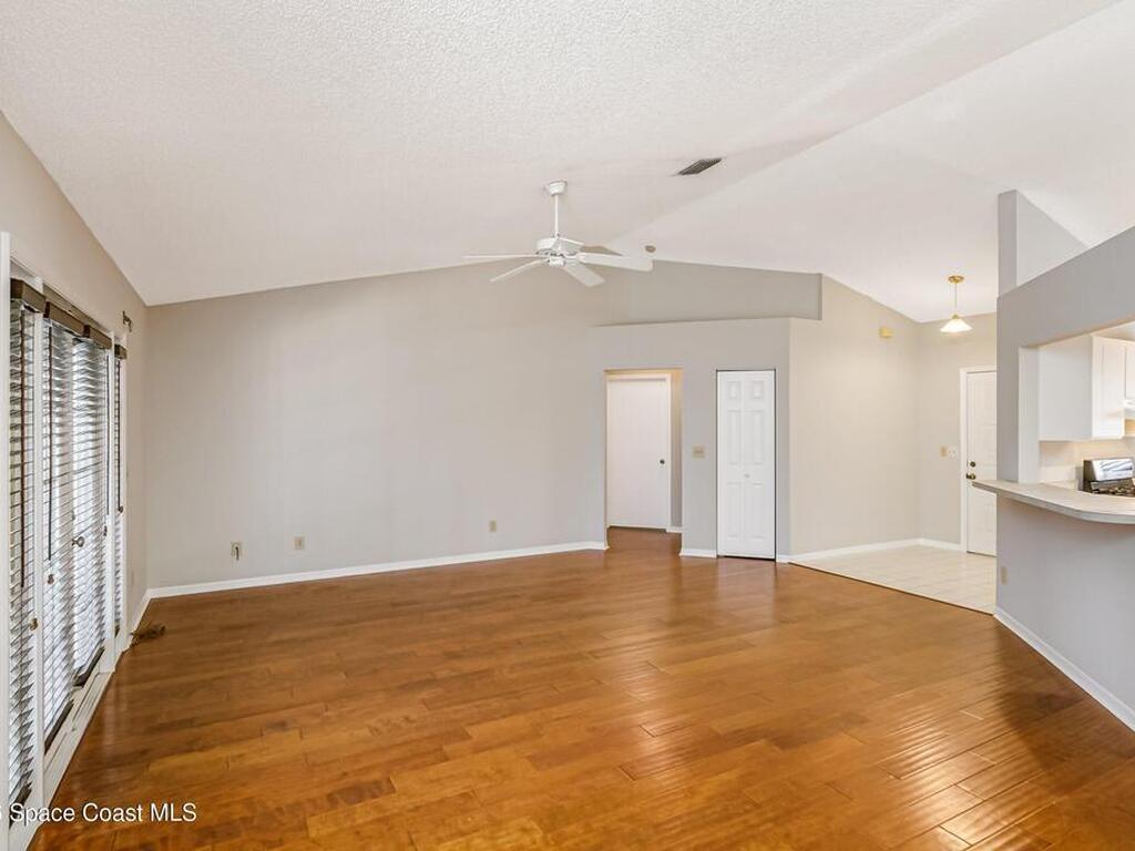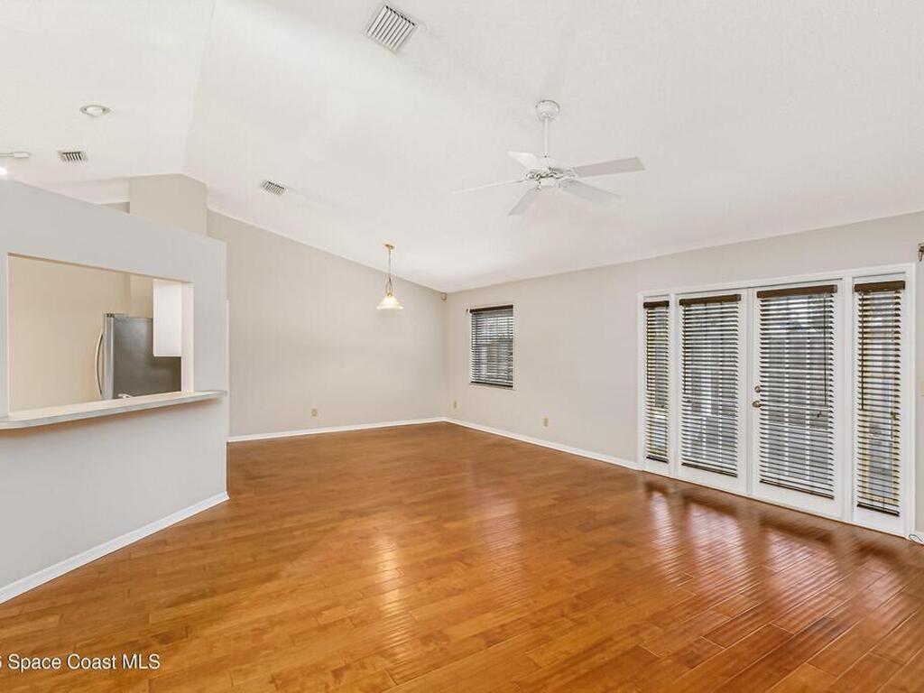 This home is a great place to land on Florida's Space Coast! Welcome to this move-in-ready pool home, where an open floor plan and vaulted ceilings enhance the sense of space. Wood floors run throughout the main living areas and bedrooms-no carpet for easy maintenance! The large eat-in kitchen features a gas stove, stainless appliances, and soft-close cabinet doors. An interior laundry room includes the washer and dryer, so you can settle in right away. Open the brand-new French doors to your private backyard retreat with a newly screened-in lanai and a perfectly sized, easy-care pool designed for relaxation, not endless upkeep. A brand-new exterior door from the primary suite to the pool makes late-night swims extra convenient. There's a NEW ROOF (2025), roll-down storm shutters, a regularly maintained HVAC system with air scrubber & replaced duct work (2017) for cleaner & healthier air, plus a security alarm for added peace of mind. Don't hesitate! Schedule your showing TODAY!