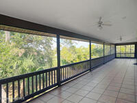 Well built two-story home is tucked among many majestic oak trees and this location is extremely private. The expansive second-floor great room features kitchen with island plus vaulted ceilings, skylights and boasts a wood-burning fireplace. Slider opens to an extra long screened-in lanai with tile floors. Accordion hurricane shutters provide added protection and peace of mind. Downstairs there are two bedrooms and a full bath; upstairs primary suite offers generous space and double closets. Both bathrooms include Jacuzzi tubs. Oversized two car garage is a drive-through with two garage doors. Ocean access is very close and gated and has covered pavilion. The .36-acre lot is larger than most, with lush landscaping and large driveway for parking. This property blends privacy, a wooded feel, and convenient access to ocean and gated entry.