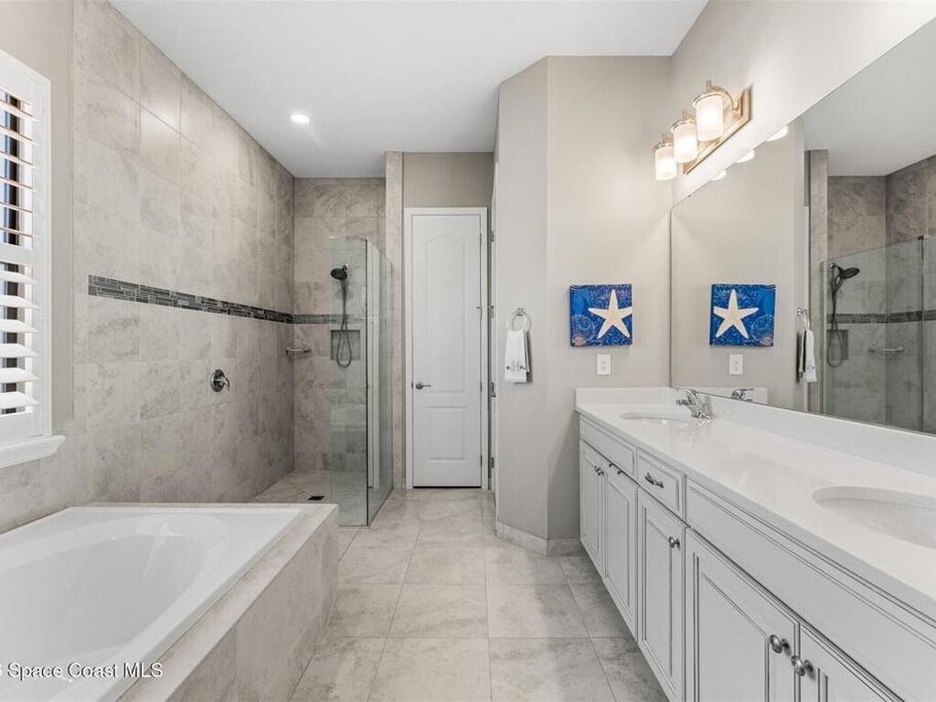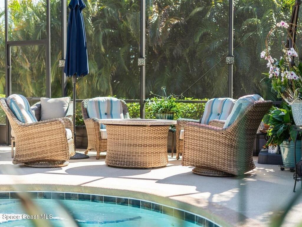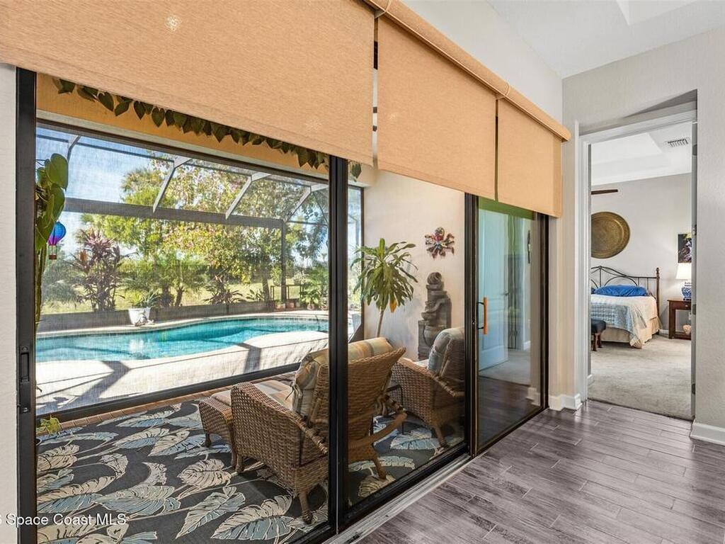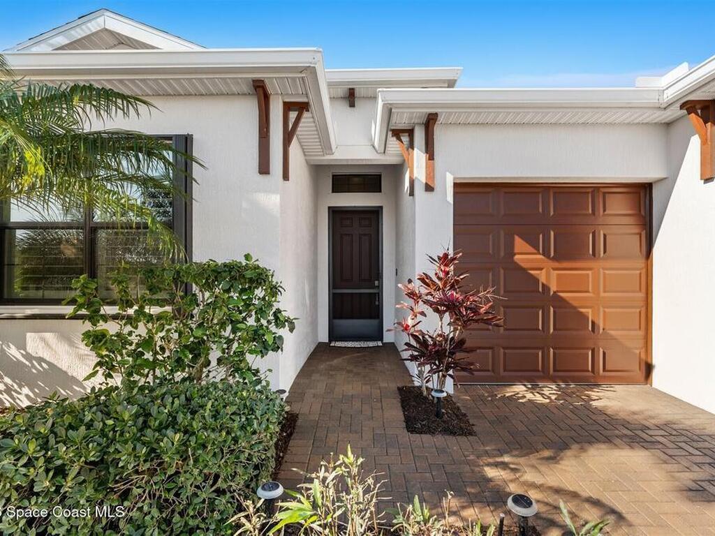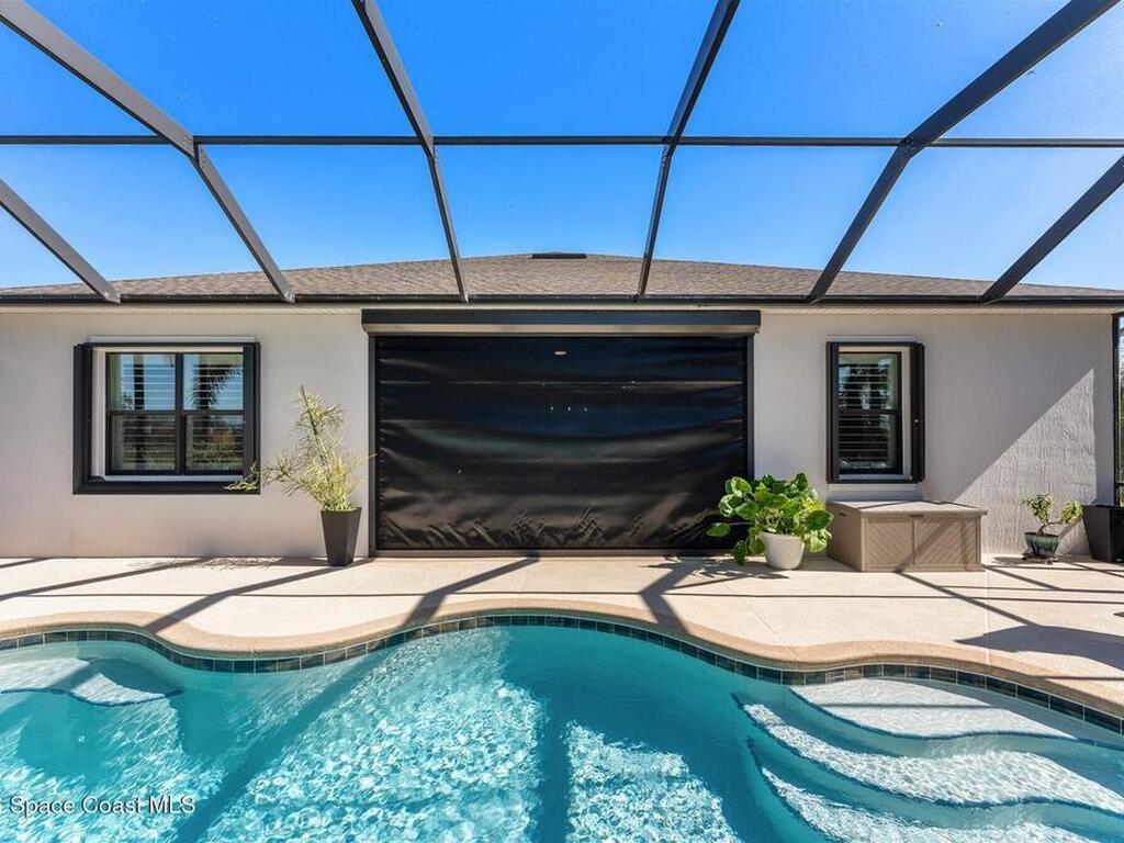 A tropical paradise awaits in this lovely 4 bed, 3 bath, 3 car garage POOL home in Bridgewater, Viera's resort style 55+ community! Located on a cul-de-sac, this meticulous home has additional lush landscaping for extra privacy! You will love the lanai with electric rolldown hurricane panels to keep your patio furniture protected during storms and the heated pool with a huge, screened enclosure! The ideal primary bedroom has a tray ceiling, a walk-in closet with custom built-ins and a bath with soaking tub and shower! Must have features include a guest bedroom w/ensuite bath, plantation shutters, wood look plank tile floors, tray ceiling & remote shades in great room, upgraded kitchen cabinets w/3 cm quartz counters, laundry room with sink, and even an EV plug and epoxy floors in garage! Energy efficient with attic radiant barrier & smart home features! Private clubhouse includes heated pool and spa, fitness center, lighted tennis & pickleball courts, billiards room and movie theater