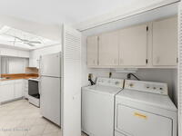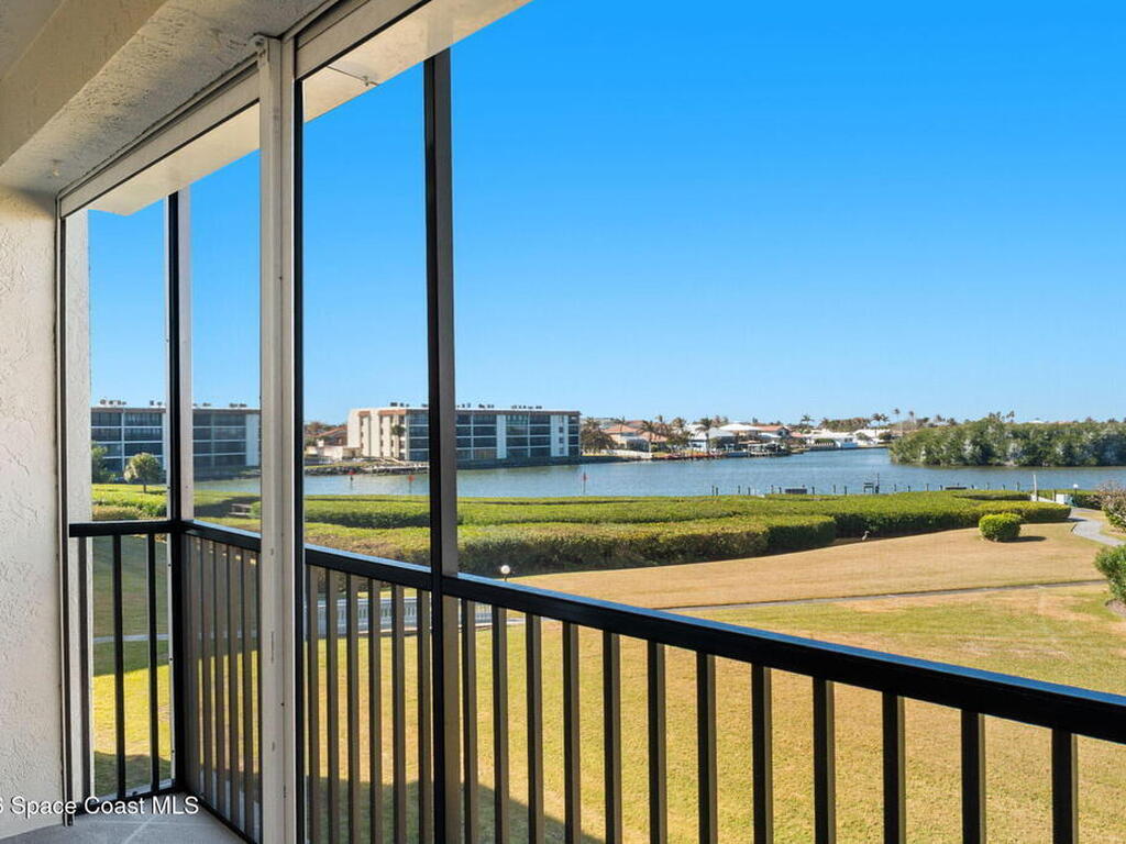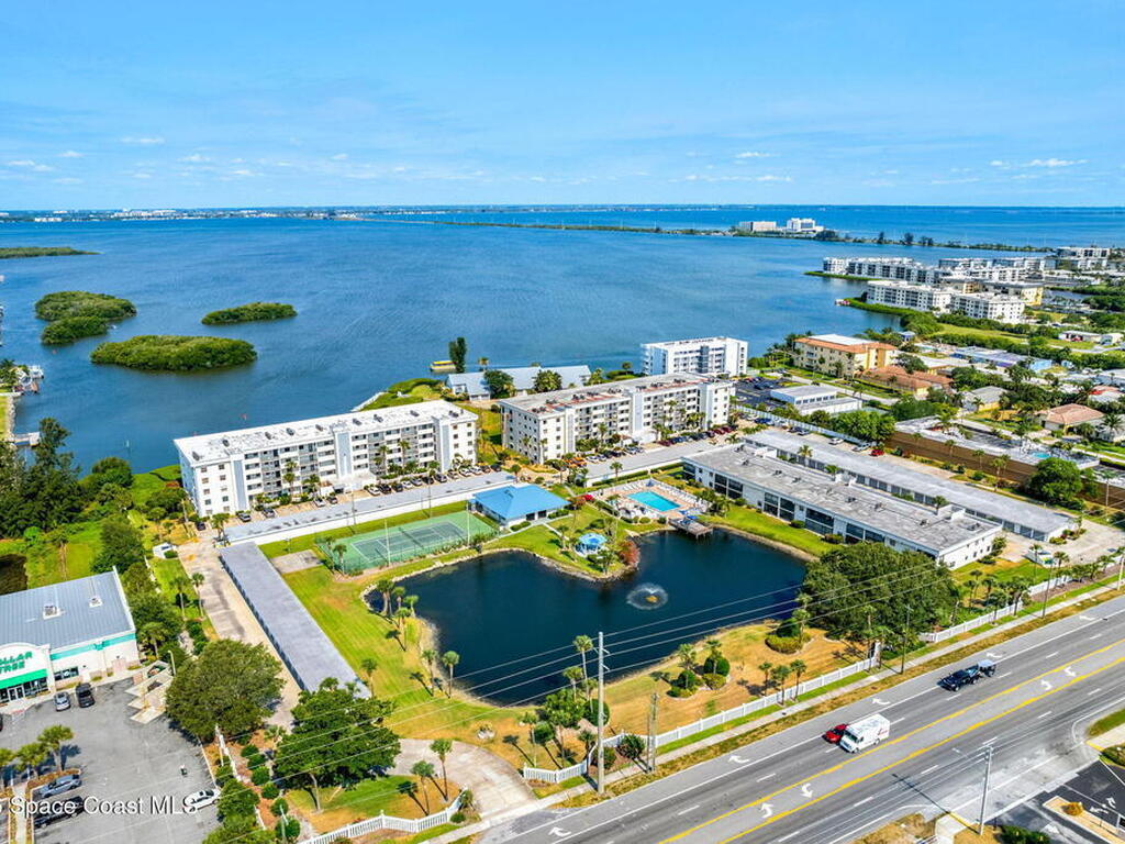 Enjoy front-row sunset views over the Banana River from this rare 2-bedroom, 2-bath condo in Fountain Cove. With nearly double the balcony and living space of any neighboring units, this wide-layout plan feels more like a stand-alone home than a condo, offering unobstructed panoramic water views. Inside, you'll find it warm and inviting, with new laminate flooring in the main living areas and a spacious, open layout that's ideal for everyday living or seasonal stays. The large primary suite offers water views and an en-suite bath, while a private in-unit washer and dryer and a one-car garage just steps from the main building add everyday convenience. Fountain Cove offers resort-style amenities including a riverfront heated pool, spa, tennis courts, and scenic boardwalk. The oversized balcony is perfect for relaxing, watching wildlife, or taking in the boat parade and spectacular sunsets. All just a short walk to the beach, Publix, and restaurants.