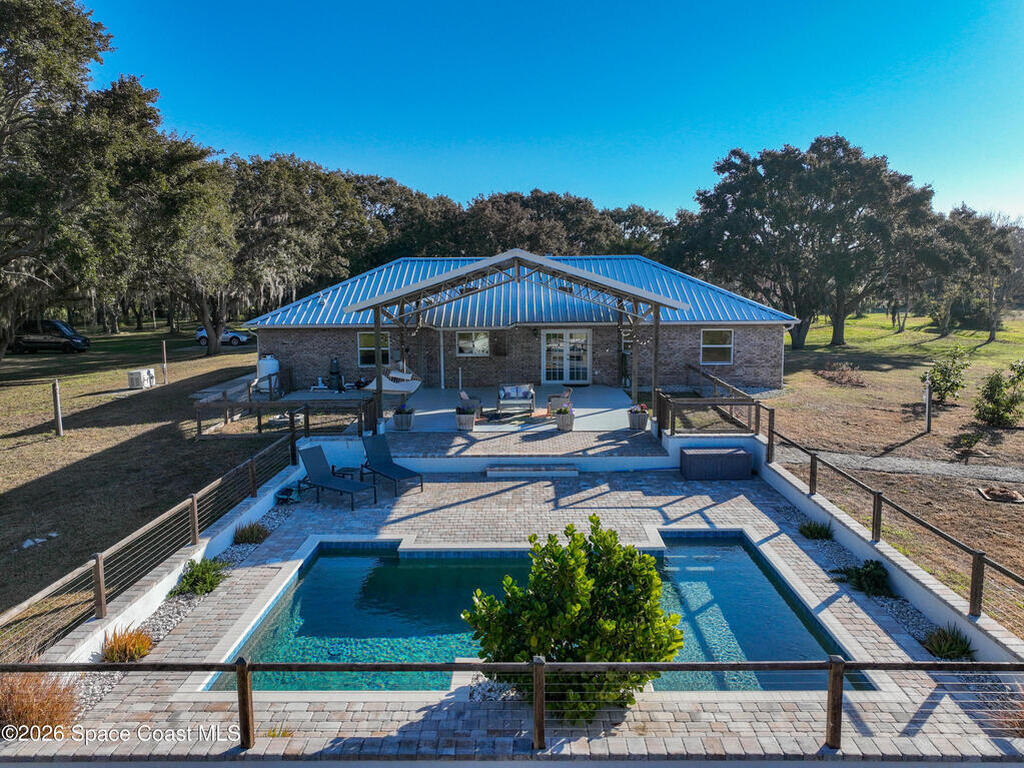 Private retreat set on 5 SCENIC ACRES adorned with majestic oak trees, this beautifully UPDATED 3-bedroom, 2-bath home with a split floor plan offers refined comfort and relaxed rural living. The kitchen features custom cabinetry, a large island, granite countertops, and new appliances, ideal for entertaining or everyday enjoyment. The residence is thoughtfully upgraded with a METAL ROOF, IMPACT WINDOWS, and a WHOLE HOME GENERATOR with Propane Tank for peace of mind. Outdoor living is exceptional with a POOL surrounded by pavers, expansive 24x24 COVERED PATIO, and an inviting FIRE PIT perfect for evening gatherings. The grounds are designed for beauty and function, including a fully fenced GARDEN with irrigation, raised beds, mature fruit trees, pond, and a CHICKEN COOP. Additional features include a DETACHED GARAGE/WORKSHOP with roll-down doors, ample space for hobbies or storage, and unmatched privacy. This rare property delivers the luxury country lifestyle you've been waiting for