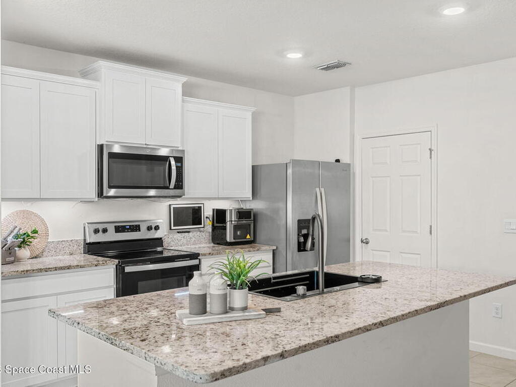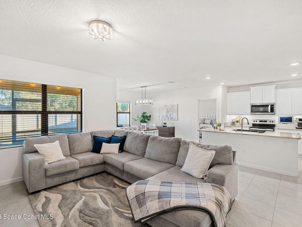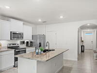 Step inside and feel the calm, easy flow of a home designed for real life. From the moment you arrive, the charming front porch and clean architectural lines set the tone--welcoming you into a space that feels both modern and warm. As you enter, natural light draws you through the foyer and into the heart of the home, where an open-concept layout brings the kitchen, dining, and living areas together seamlessly.The kitchen is the kind of space where mornings begin slowly and gatherings linger--featuring crisp cabinetry, stainless steel appliances, a spacious island with breakfast bar seating, and plenty of counter space for cooking, entertaining, or simply enjoying a quiet cup of coffee. Tile floors flow throughout the main living areas, enhancing the bright, airy feel and making everyday living effortless.