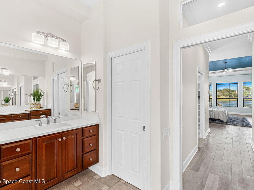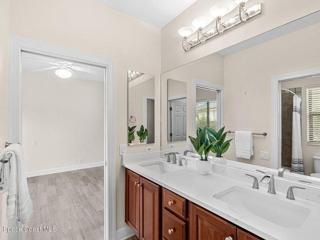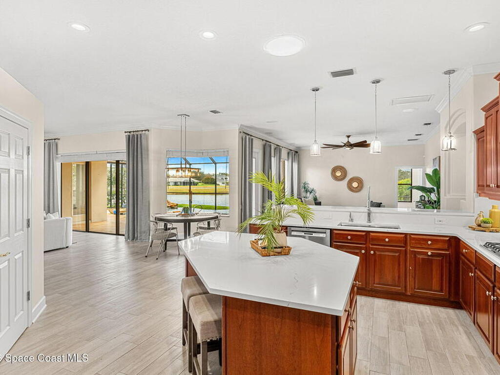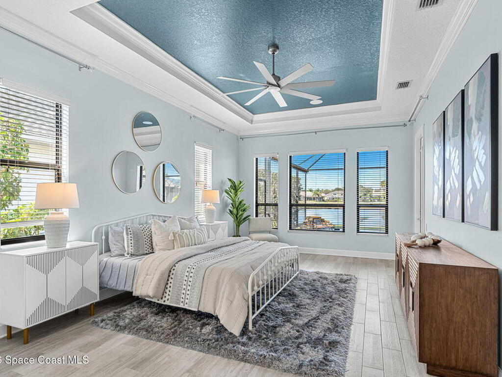 Located within the sought-after Baytree neighborhood of Suntree, this lakefront residence offers a thoughtful blend of comfort, privacy, and everyday livability in one of Brevard County's most established and well-regarded communities. Known for its quiet streets, strong school systems, and exceptional sense of safety, Baytree remains one of the Space Coast's most consistently desirable residential settings.The home features four bedrooms and four baths with a well-designed split bedroom floor plan, including a first-floor primary suite that provides privacy and ease of living. High ceilings and connected living spaces create a natural, open flow throughout, while the main living areas and primary bedroom enjoy peaceful views of the pool and outdoor living space, reinforcing a relaxed indoor-outdoor atmosphere.
