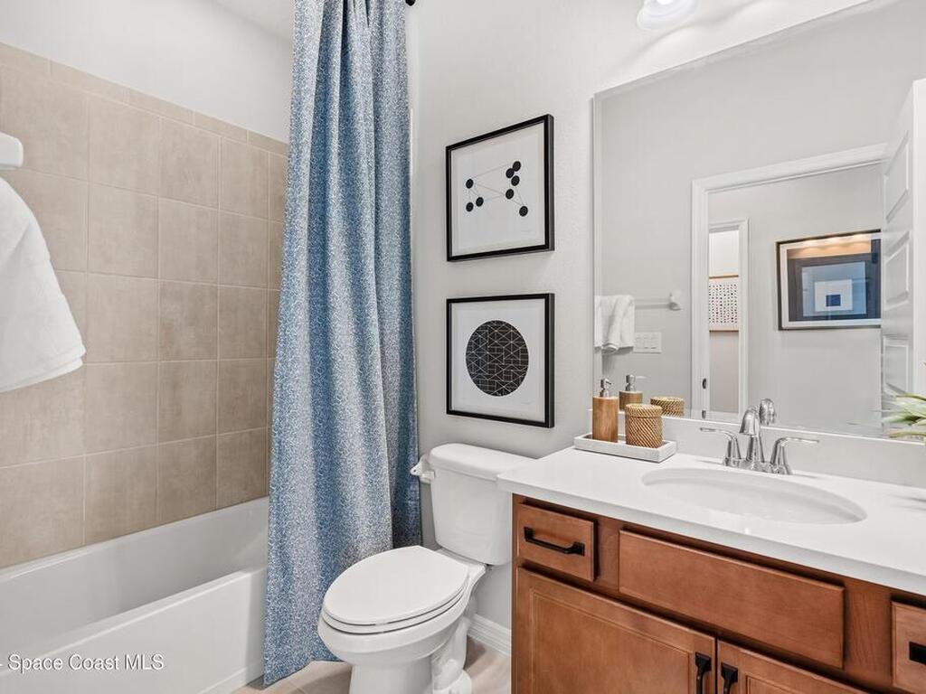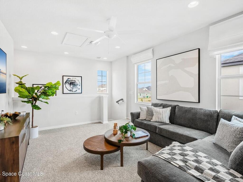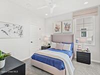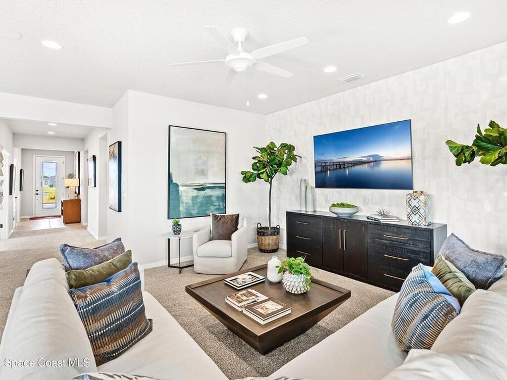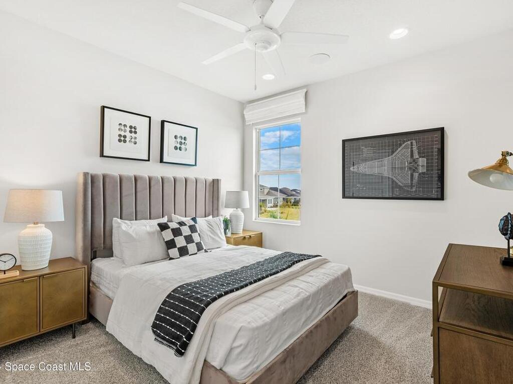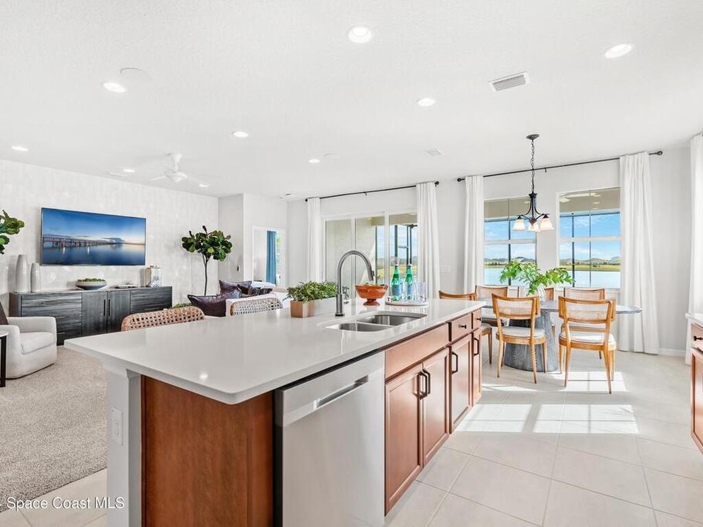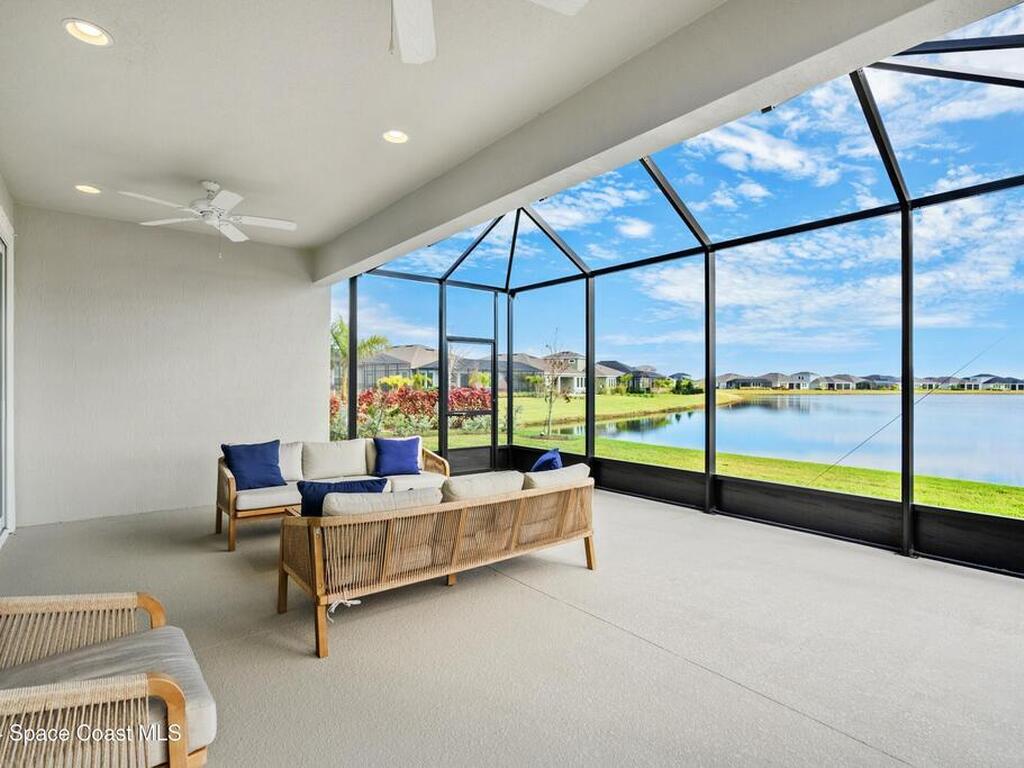 Lakefront Former Model Home in Viera where modern elegance meets an active, amenity-rich lifestyle. Built in 2023 and sited for long water views, this home welcomes you with brand new luxury vinyl plank flooring through the main living areas and an open floorplan with high ceilings that frame the lake from an oversized screened porch an ideal spot for morning coffee, sunset gatherings, or relaxed entertaining. The gourmet island kitchen features quartz countertops, stainless steel appliances, a pantry, and a large dining area overlooking the water, while a dedicated office with French doors provides a quiet workspace. The downstairs primary suite offers an expansive walk-in closet and a spa-like bath with double sinks, and two additional bedrooms plus two full baths on the main level ensure comfortable space for family and guests. Upstairs a spacious loft serves as a flexible family or recreation room accompanied by an additional bedroom and full bath. Located in Viera's award