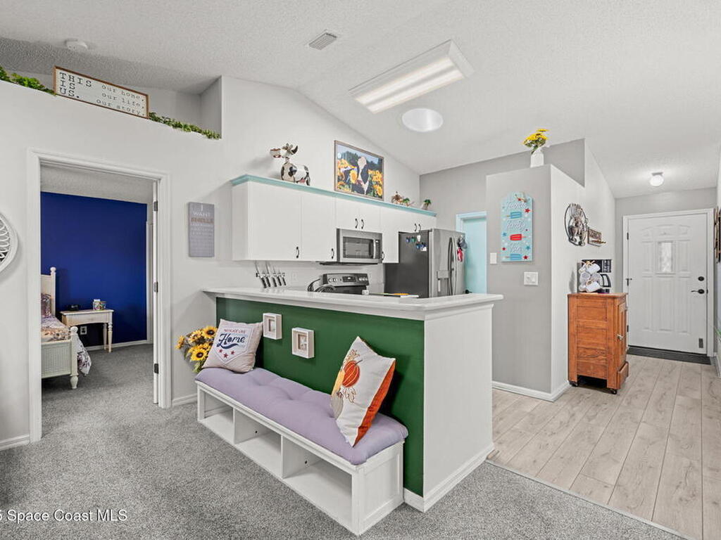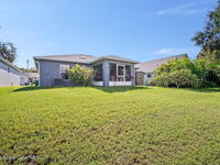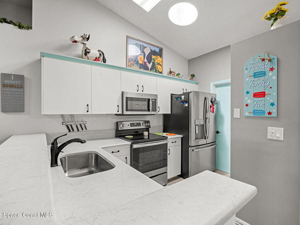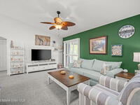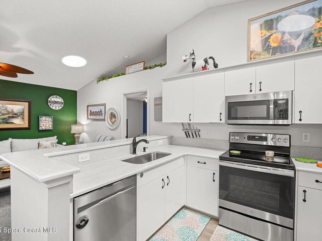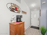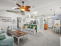 Pack a bag and escape the cold! This beautifully updated 3-bedroom, 2-bath, concrete block home is move-in ready! Nestled in a small, quiet cottage-style community with serene lake views, this cozy house is just 15 minutes from the ocean. Inside is all-new flooring, fresh interior & exterior paint, and plantation blinds throughout. The open-concept living area is filled with natural light, enhanced by new ceiling fans, solar tunnels and a fun, beach-inspired color palette. The updated kitchen features quartz countertops, newer stainless steel appliances, ample cabinet space and a pantry. A split floor plan offers privacy to guests. Enjoy peaceful mornings with coffee by the lake in your private back patio oasis.The 2019 roof adds peace of mind, and the entire home has been thoughtfully maintained and styled for low-maintenance, high-comfort living. Located minutes from top-rated schools, shopping centers, and local restaurants, this home truly has it all.