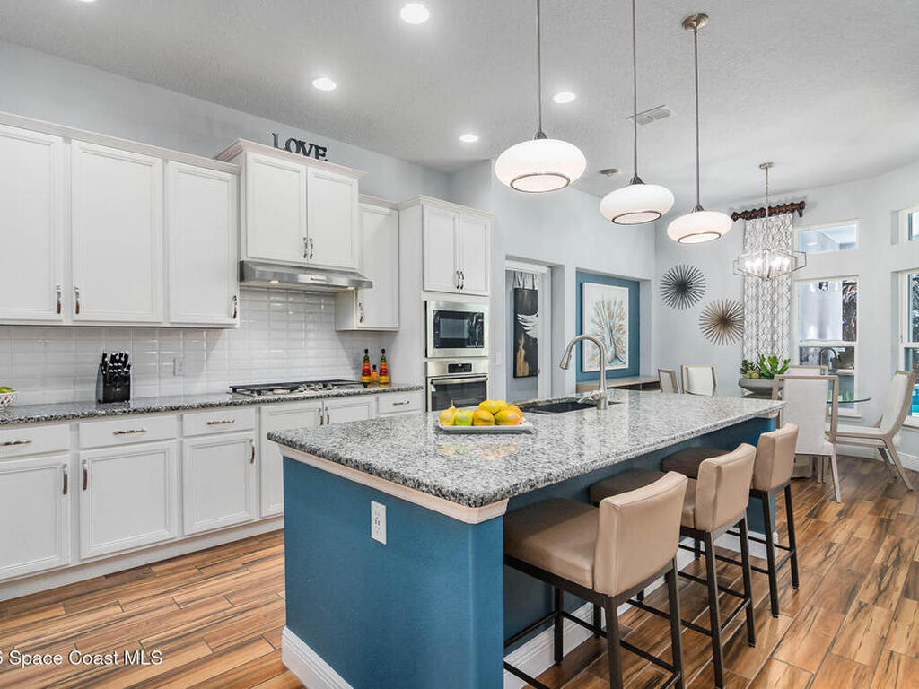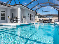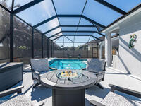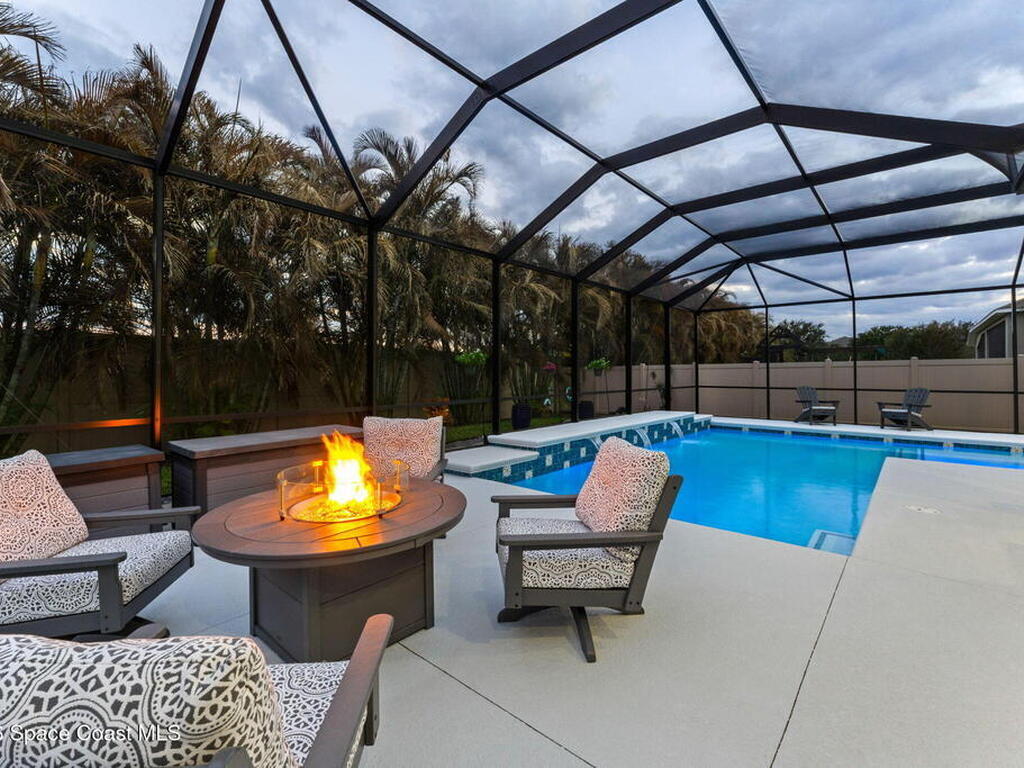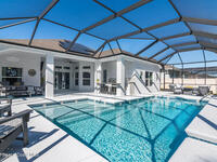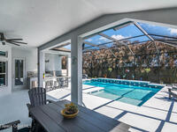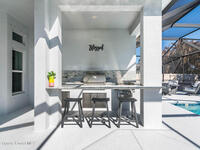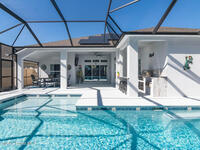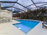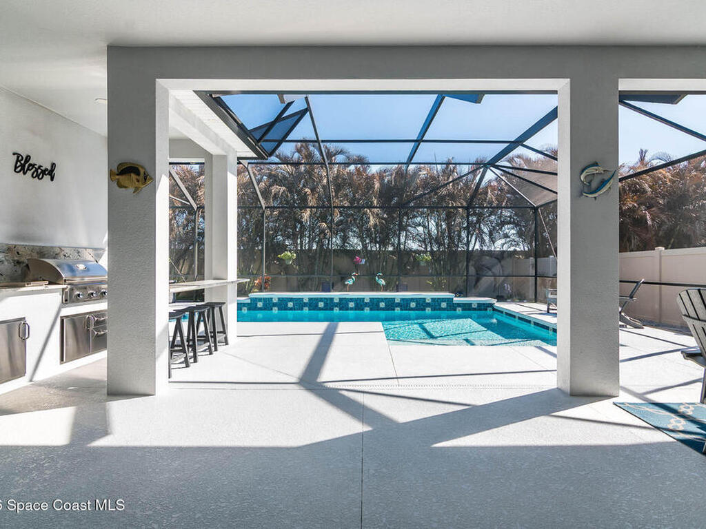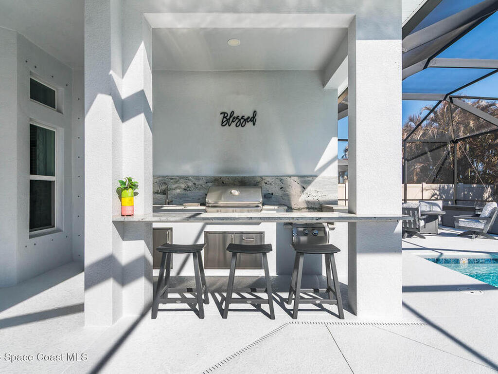 Immaculate home just 9 min. from the beach, close to shops, restaurants, grocery stores & A-rated schools. Designed for comfort & entertaining, this open-plan home features an exceptional outdoor living space with a summer kitchen, including a grill & gas burners, plus a gorgeous swimming pool with a waterfall & shallow entry, ideal for kids or in-pool seating. Fully fenced yard w/ two gates & outdoor TV. Inside, enjoy high ceilings & wood-look tile throughout, paired w/ white cabinets & granite counters. The kitchen is a standout w/ SS appliances, wall microwave & oven, vent hood, supersized island & casual dining area overlooking the large lanai. Additional upgrades include extended driveway, epoxy-painted garage, cabinets in the laundry room, tankless gas water heater, AC w/ UV light & overflow safety system, security camera system & solar panels to be paid in full at closing. Owner averages only $50/month electric bill. Loaded w/ upgrades & thoughtfully designed for Florida living