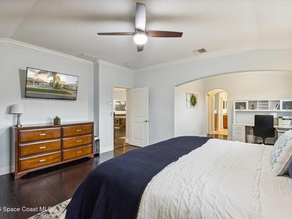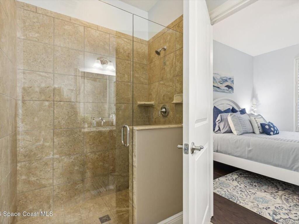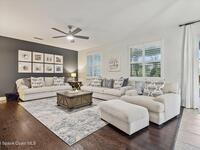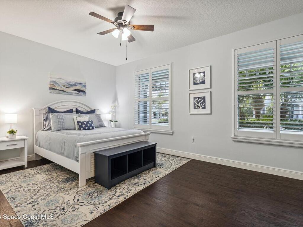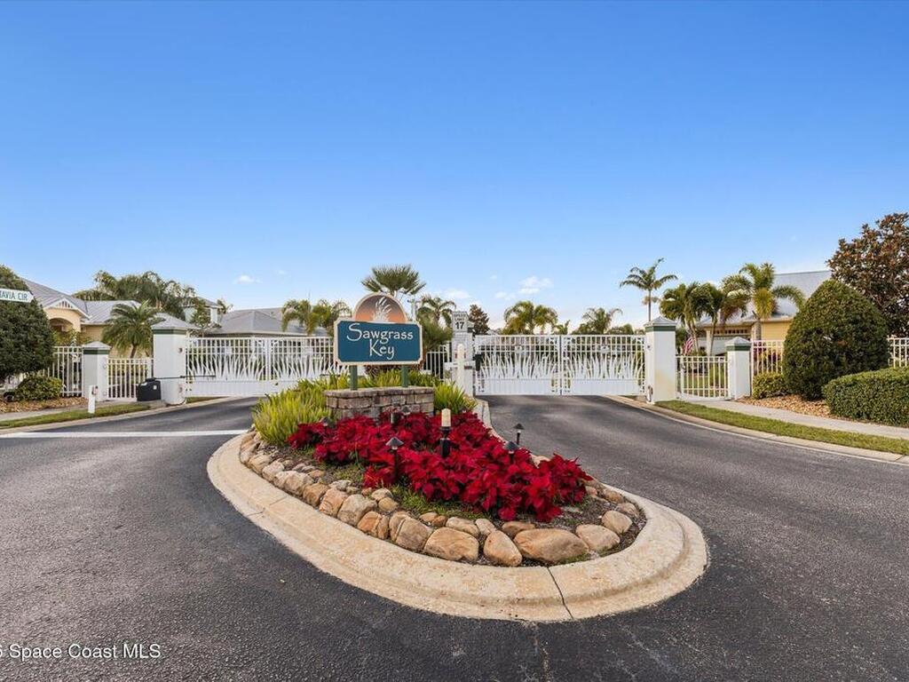Welcome to luxury living in the gated Sawgrass Key community of Suntree/Viera. This move-in ready 4-bedroom, 5-bath home features a spacious open floor plan perfect for everyday living and entertaining. The gourmet kitchen includes double wall ovens, gas cooktop, 42-inch cabinetry, granite countertops, a butler's pantry, and a large walk-in pantry. Hand-scraped hardwood floors and fresh 2023 interior paint add warmth and modern appeal. Upstairs offers a generous bonus room and a luxurious primary suite with soaking tub, dual vanities, and separate shower. Each bedroom features its own full bath. Enjoy a 10x40 trussed lanai with no rear neighbors, a 40-year metal roof, oversized 2-car garage, porte cochere, paver driveway, and maintenance-free HOA living. Tenant occupied until June 15, 2026.