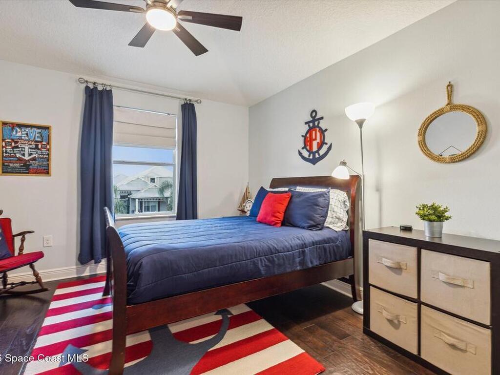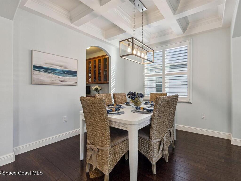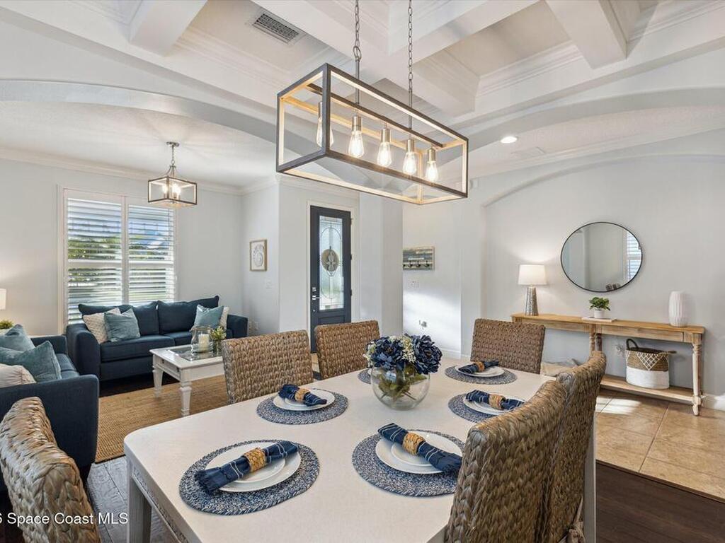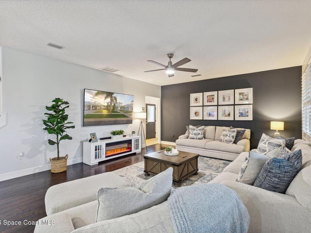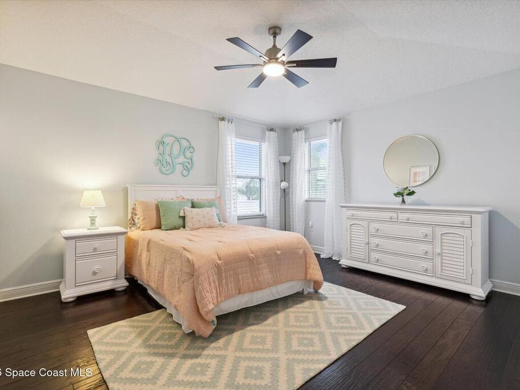 Welcome to luxury living in the gated Sawgrass Key community of Suntree/Viera. This move-in ready 4-bedroom, 5-bath home features a spacious open floor plan perfect for everyday living and entertaining. The gourmet kitchen includes double wall ovens, gas cooktop, 42-inch cabinetry, granite countertops, a butler's pantry, and a large walk-in pantry. Hand-scraped hardwood floors and fresh 2023 interior paint add warmth and modern appeal. Upstairs offers a generous bonus room and a luxurious primary suite with soaking tub, dual vanities, and separate shower. Each bedroom features its own full bath. Enjoy a 10x40 trussed lanai with no rear neighbors, a 40-year metal roof, oversized 2-car garage, porte cochere, paver driveway, and maintenance-free HOA living. Tenant occupied until June 15, 2026.