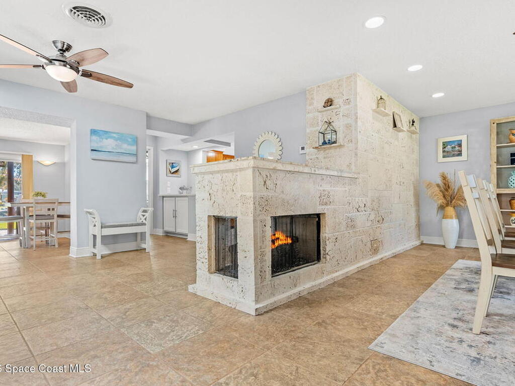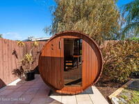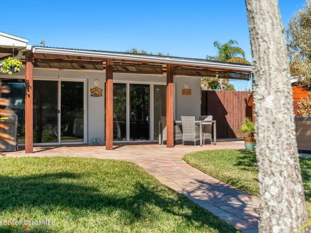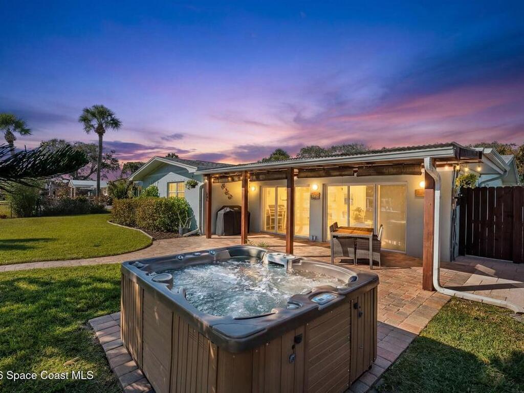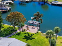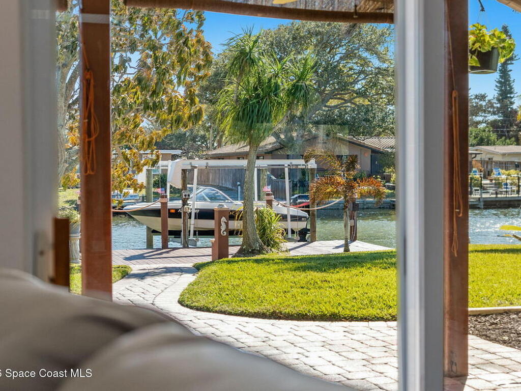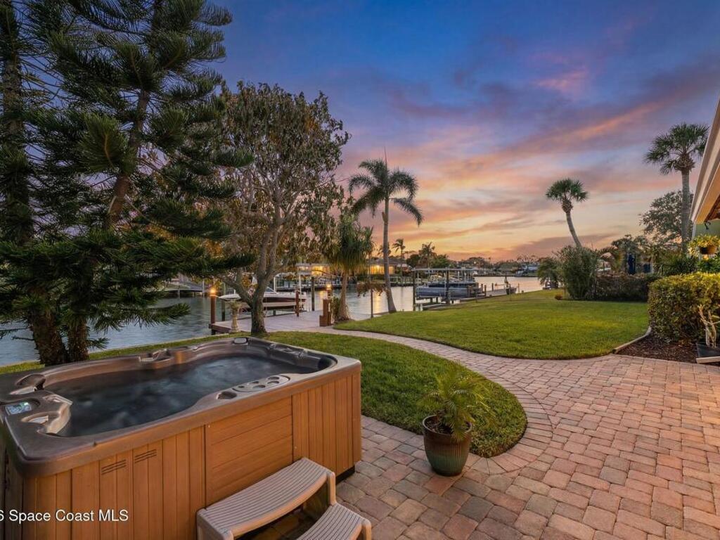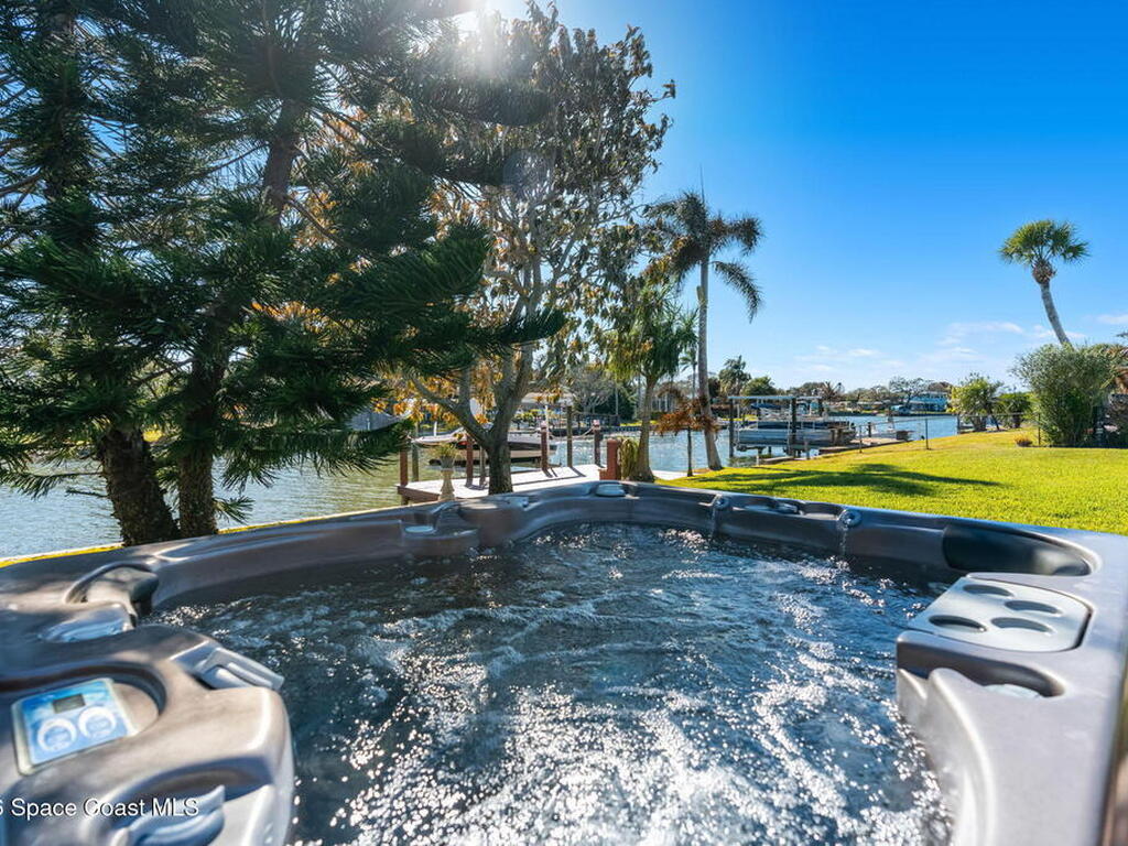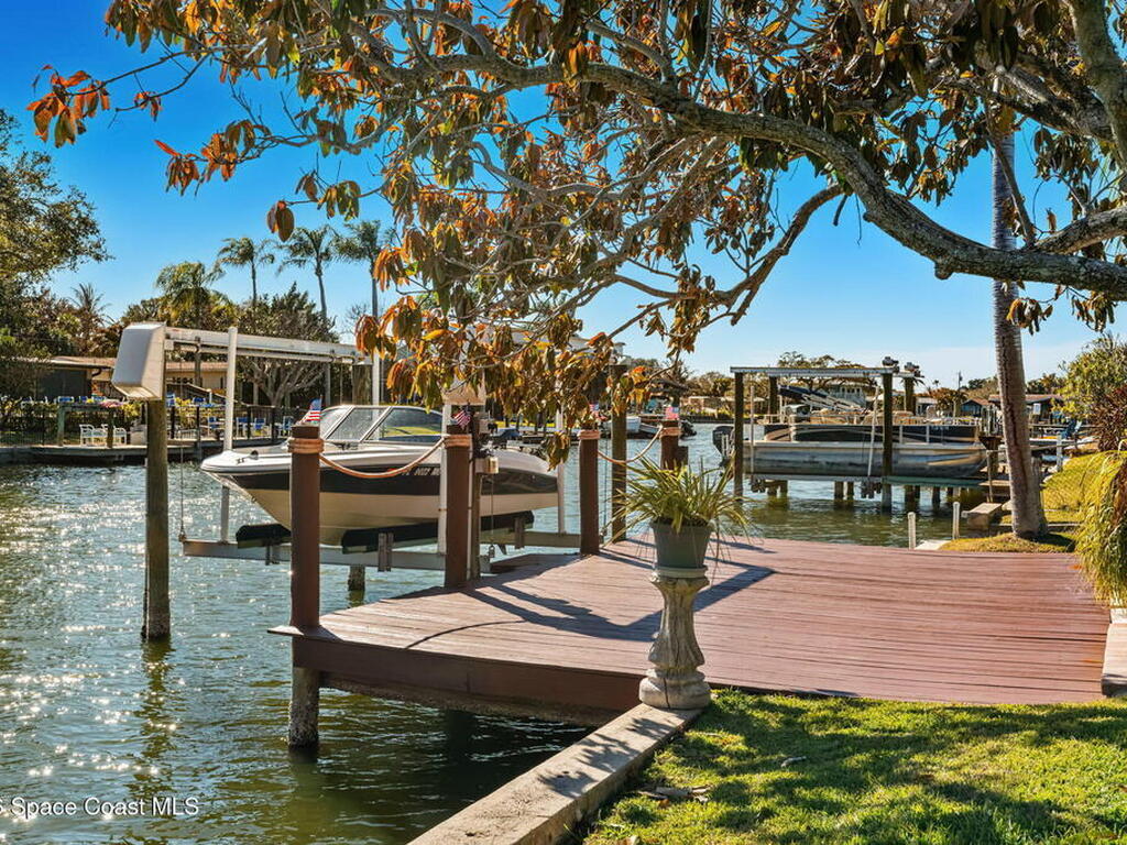 Turnkey canal-front living in one of Cocoa Beach's most favored neighborhoods, Cocoa Isles. This spacious single-story home features an open floor plan, peaceful water views and abundant natural light. Step outside to a large dock, newer boat lift, and be on the river within minutes - perfect for boating, paddleboarding, kayaking, or fishing right from your backyard while dolphins and manatees come to visit. Inside you'll find quartz counters, ''beach-retro'' style cabinets & drawers, SS appliances, keystone propane fireplace, split floor plan, and a comfortable primary suite with updated bathroom and walk-in closet. Major systems have been upgraded including newer roof, A/C, water heater, and 200 amp electrical service. Enjoy your very own wellness oasis, relaxing year-round with a covered patio, hot tub, sauna, and a south-facing water view perfect for sunbathing. Large 2-car garage, reclaimed-water irrigation, and included washer & dryer. Furnishings and decor negotiable.