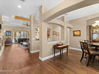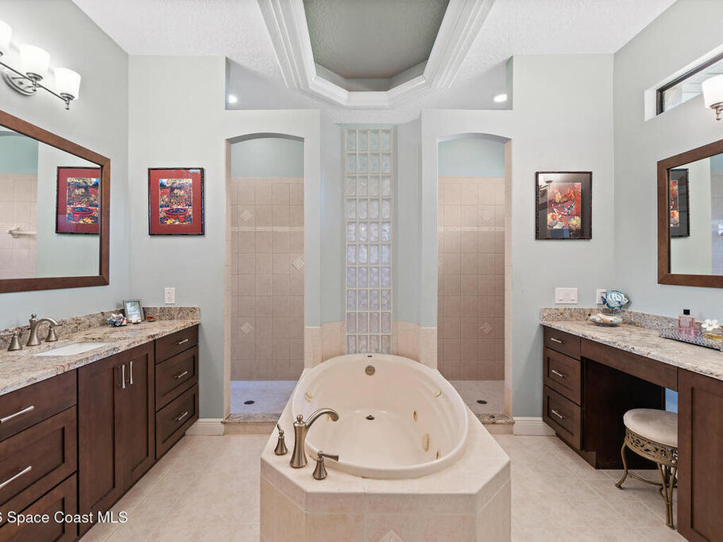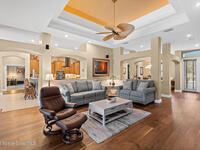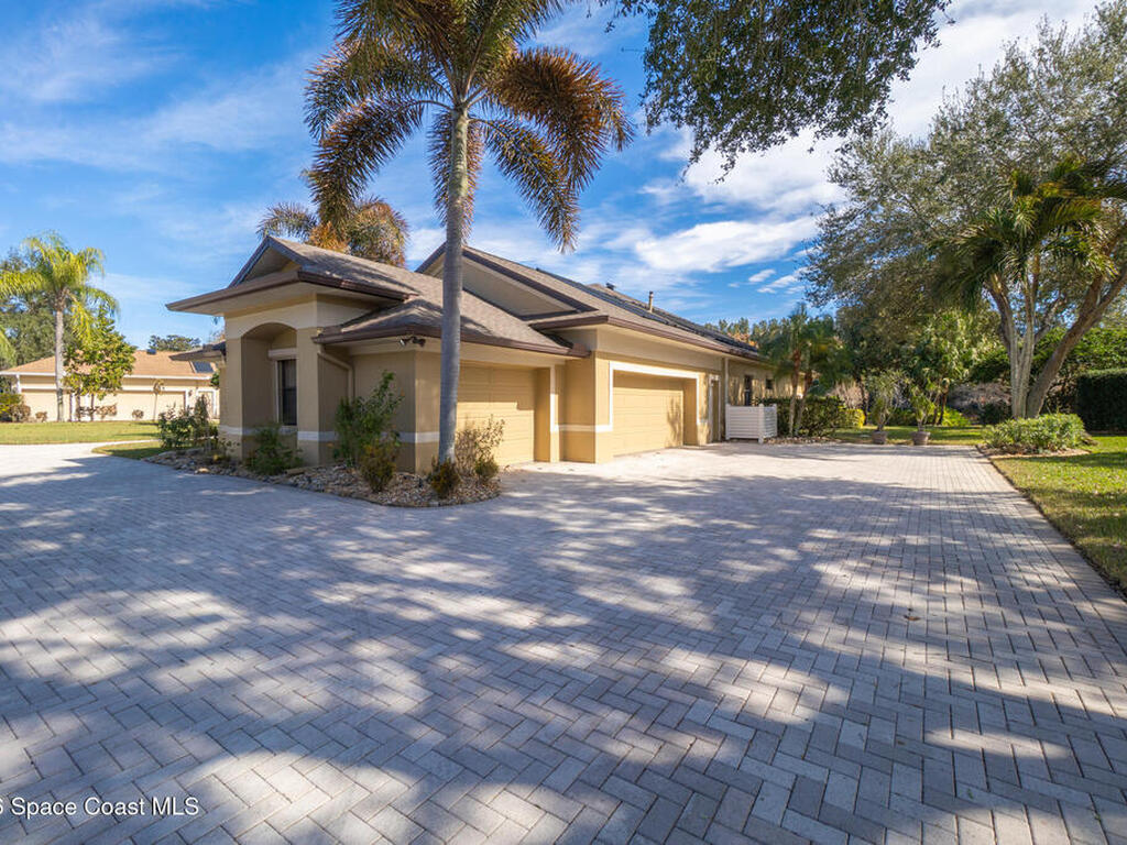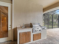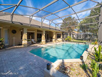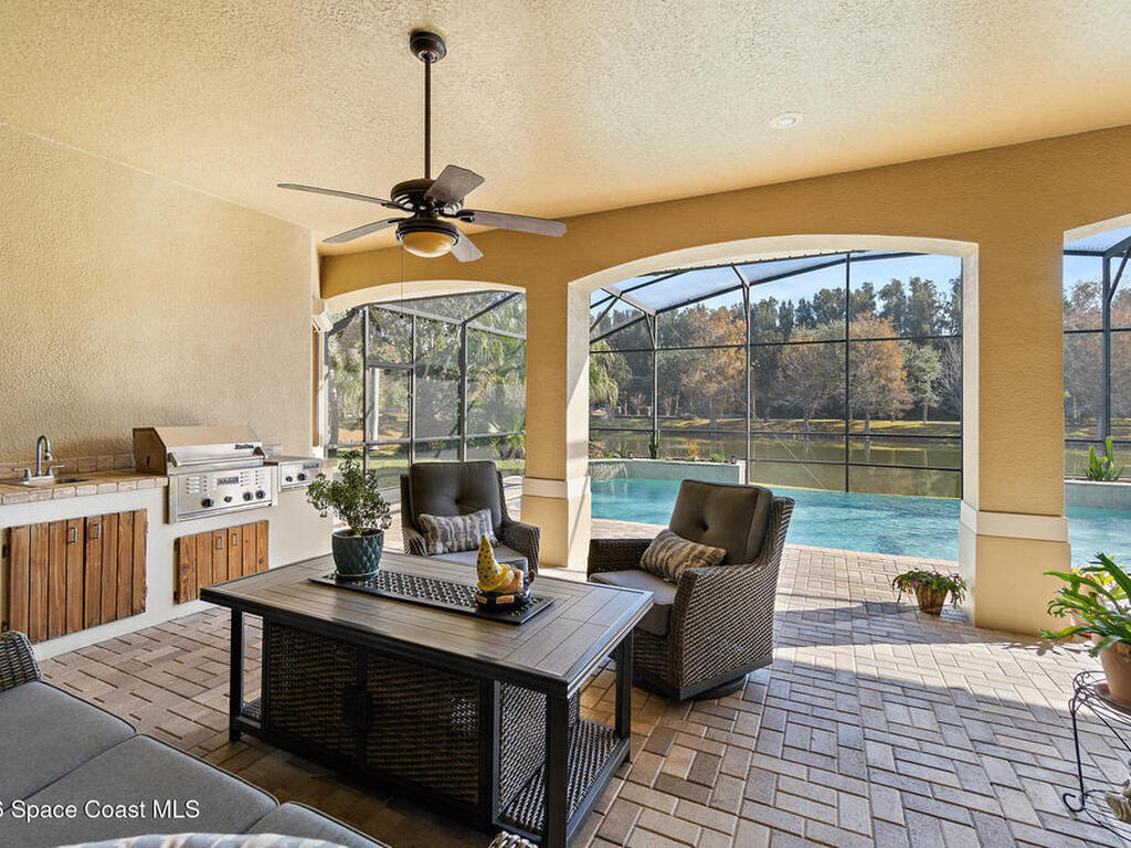 Welcome to luxury living in the heart of Merritt Island at The Plantation! This stunning 3-Bed/3-Bath home on an expansive lot showcases an open floor plan with elegant formal living and dining rooms. The chef's kitchen boasts hardwood cabinets, a center island with range, a generous breakfast bar, and a walk-in pantry. Through pocket sliding glass doors, enter your resort-style backyard featuring an outdoor summer kitchen, paver patio, and screen-enclosed solar-heated infinity pool with serene lake views. The spa-like primary ensuite bath features a lighted whirlpool bath, dual vanities, and his-and-hers walk-in showers. Highlights include built-in features, lighted & tiered ceilings, a gas fireplace, storm shutters, fresh paint inside and out, an expansive laundry room, and an oversized 3-car garage. The circular paver driveway welcomes you to this tree-lined sanctuary with lush tropical landscaping. Don't miss your chance to own this stunning lakefront beauty!