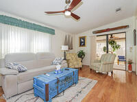 Clean! Freshly updated w/ paint, LVP floors, New Appliances, New AC, Ceiling fans. Oak floors =timeless style. Dine in kitchen, plua dining room. LR features HIGH ceilings, 2 bonus rooms. Primary w seperate vanity area, step in shower. Corner lot for added space, carport w extra parking. Roof i2016. This feels like your full time home or perfect winter get away. Dynamic community w pickleball, golf, tennis, clubhouse great live bands, clubs for every interest or enjoy the natural beauty of a fishing dock on the IR river & a private Beach Access minutes away. Not Granny's Place-Light, bright and move in ready. $972 paid annually in RE taxes. one time app fee of $1555 due at closing.
