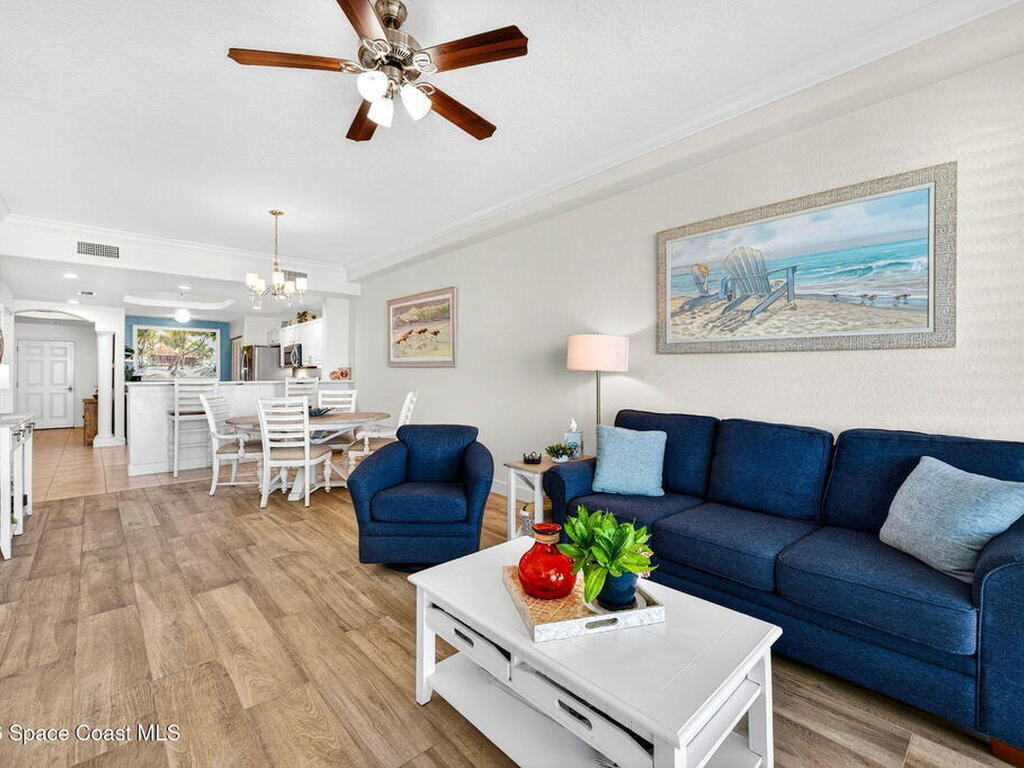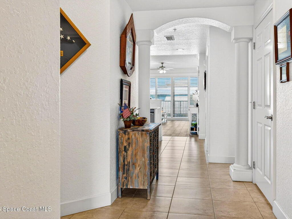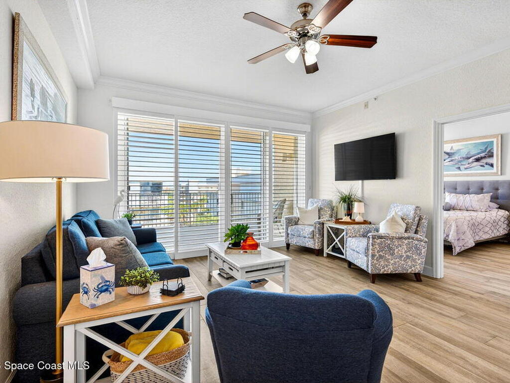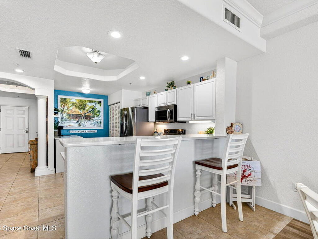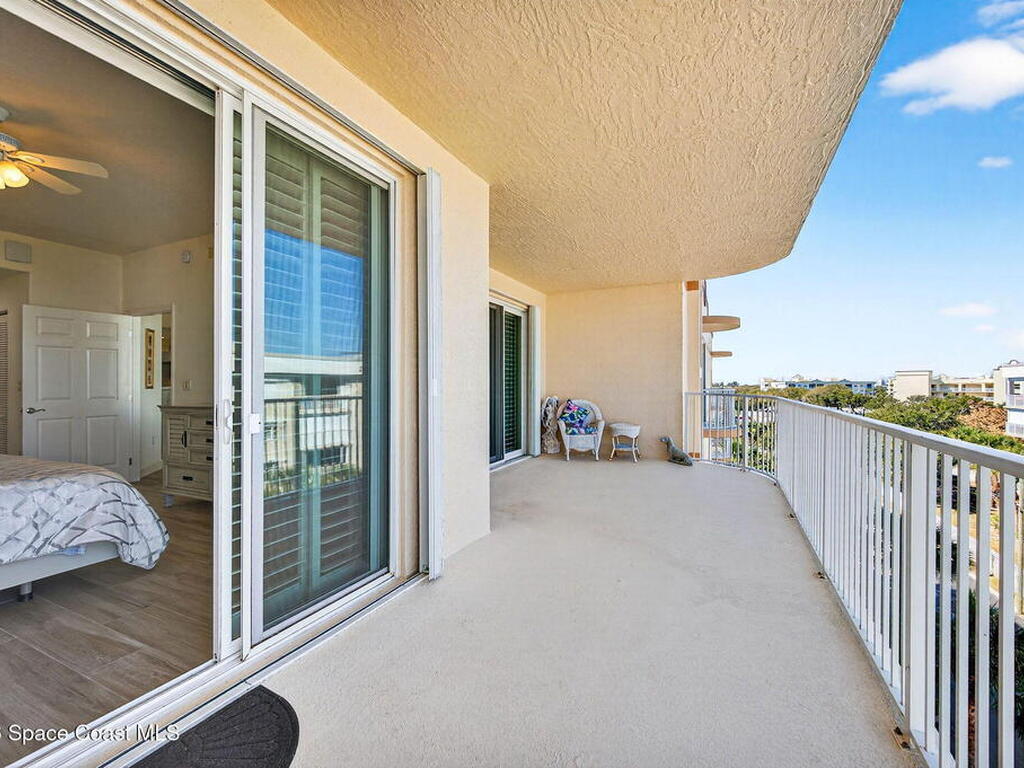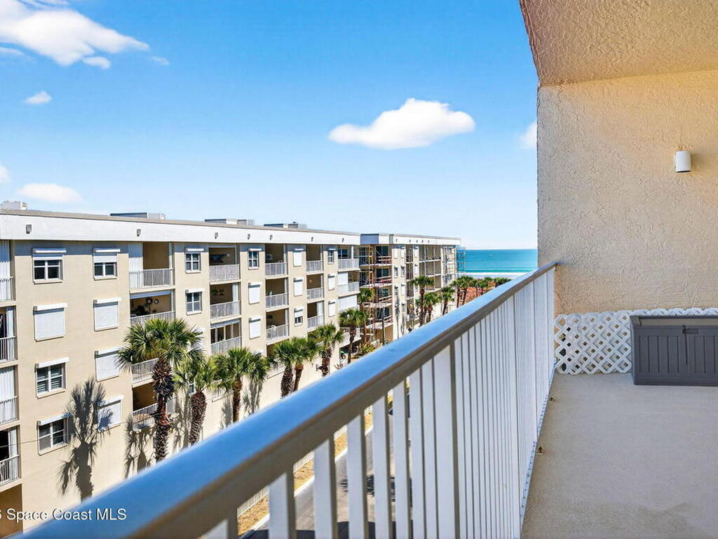 5th FLOOR--Top-floor BEACHFRONT living at Mystic Vistas with DIRECT CRUISE SHIP and ROCKET LAUNCH VIEWS! This light-filled condo features soaring ceilings, open floor plan, and tile throughout. Expansive sliders lead to a private north-facing balcony with stunning views. The kitchen offers quartz countertops, modern appliances, island, and breakfast bar. The primary suite includes dual walk-in closets and a spa style bath with soaking tub. A secondary bedroom with ensuite provides guest privacy, while the third bedroom offers flexible space for office or guests. Laundry room, ample storage, and storm shutters add convenience. HVAC 2026; Tankless Water Heater 2023 and energy efficient windows. Gated community amenities include secure lobby, garage parking, four heated pools, fitness center, tennis, racquetball and private beach access. Recent updates: paint, elevators, lobby flooring, and roof. Close to Port Canaveral, Jetty Park, Beaches, and Orlando attractions. Schedule your showing!
