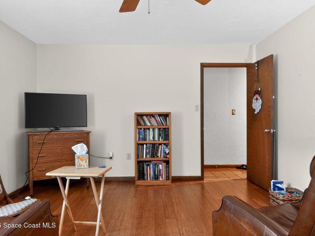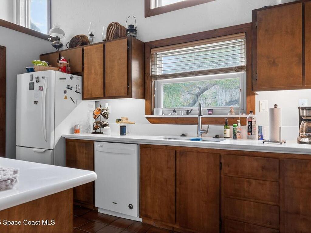 This custom built 4 bedroom/3 bath home offers 2, 080 sq ft. Situated on a spacious 1.03-acre lot, just minutes from Kennedy Space Center. Inside, soaring ceilings, wood flooring, and a striking fireplace with a marble accent wall create a warm, inviting living space. The kitchen features abundant cabinetry and flows seamlessly into the main living areas, ideal for everyday living and entertaining. Bedrooms include custom built-ins, while a versatile lower-level den is currently used as an additional bedroom.Enjoy outdoor living with a screen-enclosed pool, generous yard space, and a private setting on paved roads. Additional features include a 2 car garage, detached storage building, and a metal roof under 10 years old. A unique property offering space, character, and a prime location.