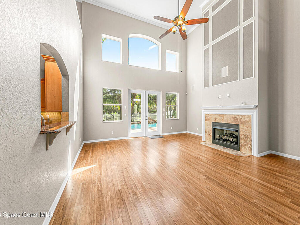 Exceptional space, comfort, and privacy define this stunning 5 bedroom, 3.5 bathroom pool home in the gated community of Chastain Manor. Offering nearly 4, 000 square feet of living space, the thoughtfully designed layout includes a private office and spacious primary suite on the main level, plus an upstairs loft, four secondary bedrooms, and three full baths. The updated kitchen features 42'' cabinets, granite countertops, and a gas cooktop. Vaulted 20-foot ceilings, crown molding, custom tile, and a gas fireplace add elegance throughout. Enjoy rocket launches all year round from your screened heated saltwater pool, large patio and fenced yard backing to protected wetlands. Oversized 3-car garage for added storage. Minutes to I-95, 5 minutes to The Indian River, 12 minutes to The Brevard Zoo, 15 minutes to the beach and Patrick's Space Force Base.