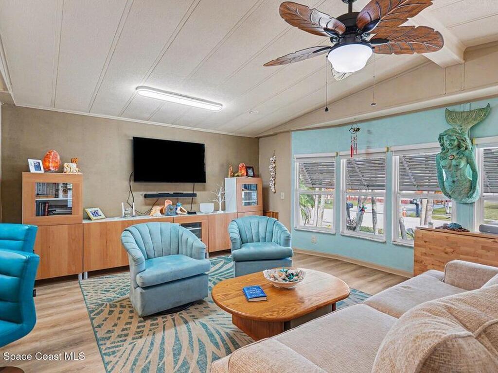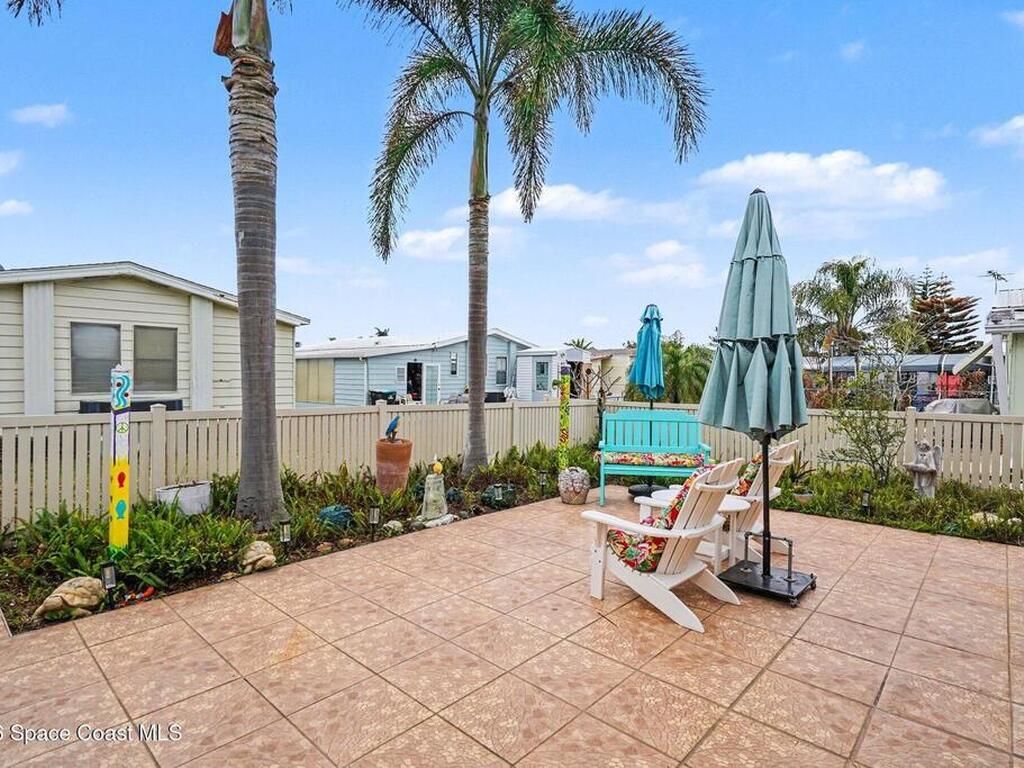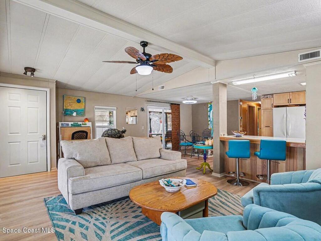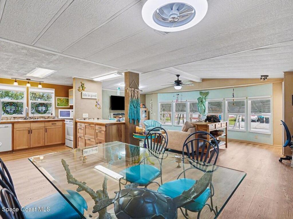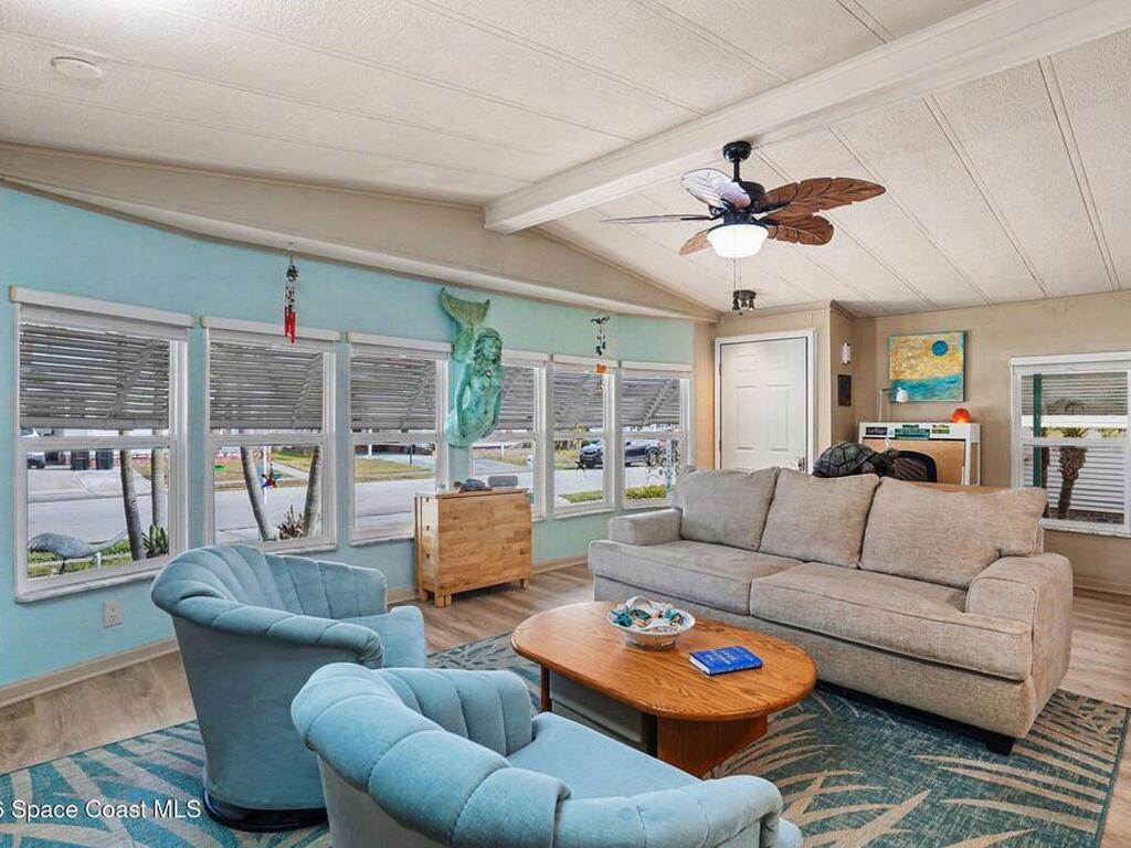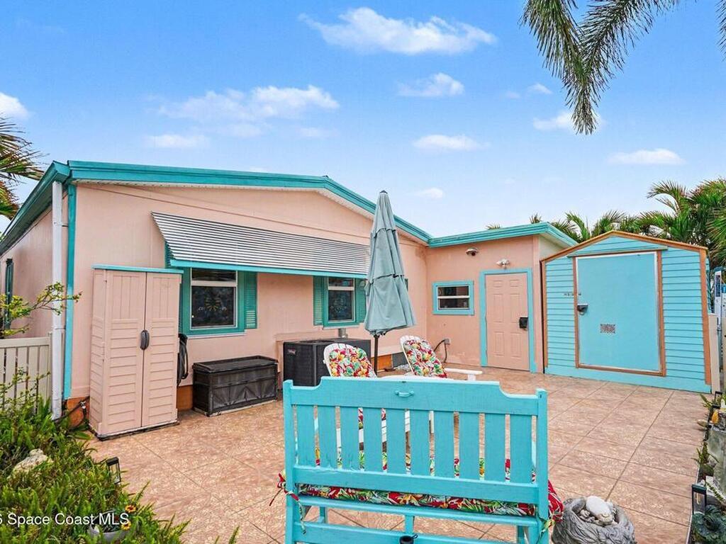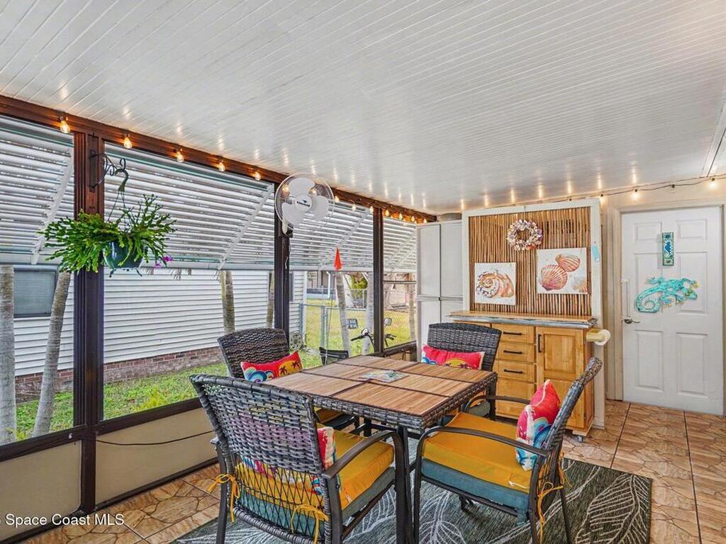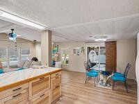 Lovingly maintained 2-bedroom, 2-bath manufactured home featuring thoughtful updates and pride of ownership throughout. The light and bright interior showcases updated kitchens and bathrooms with beautiful cabinetry, along with newer LVP flooring in the living areas and bedrooms. Enjoy peace of mind with a metal roof and a 2023 AC system. Double-pane windows with hurricane shutters add comfort and protection, while skylights in both bathrooms bring in natural light. Relax on the spacious screened porch or take advantage of the versatile additional room with a portable AC--perfect for an office, hobby space, or guest area. There is space for your projects with the attached workshop. Outside, you'll find a tiled patio, fenced yard, and storage shed, offering plenty of space for outdoor enjoyment. Located in an established 55+ community offering a heated pool, clubhouse, tennis courts, pickleball, and shuffleboard--all for a low monthly fee of just $45. You own the land!
