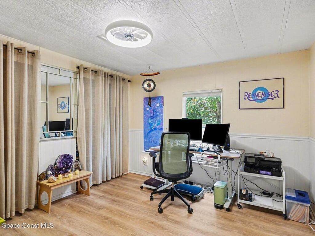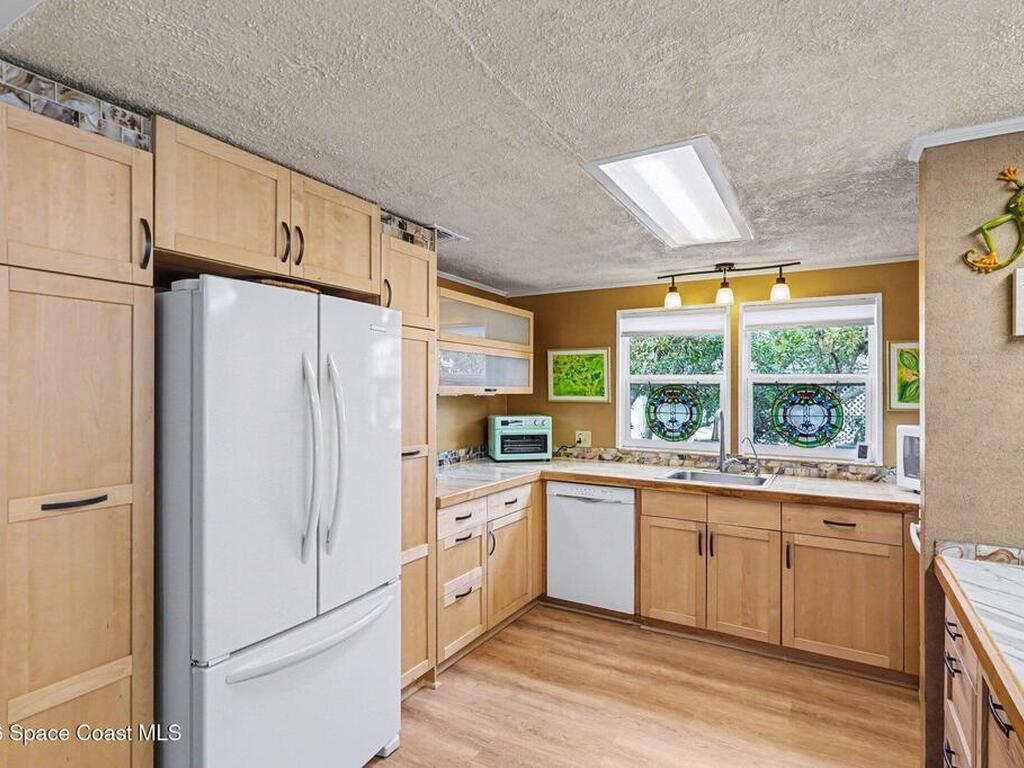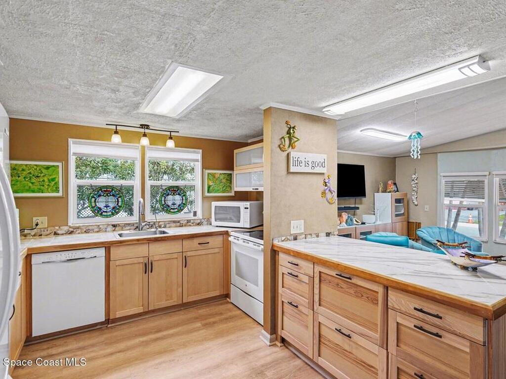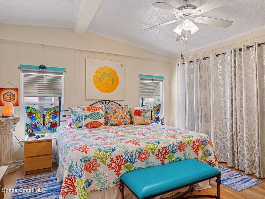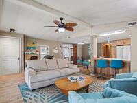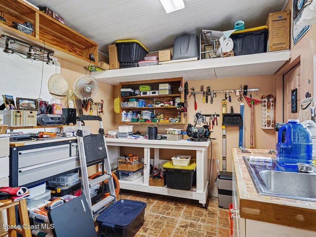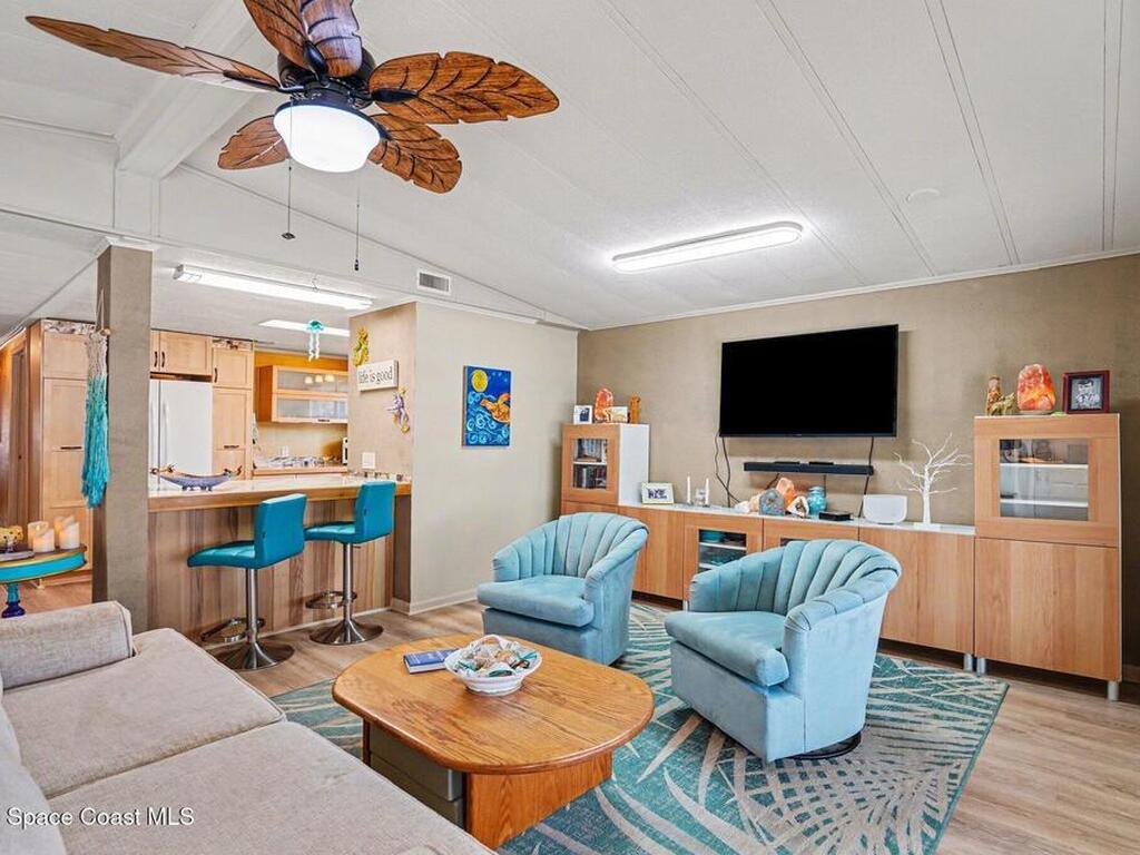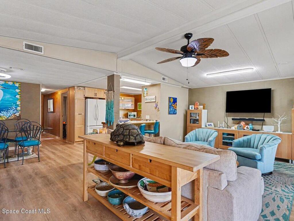 Lovingly maintained 2-bedroom, 2-bath manufactured home featuring thoughtful updates and pride of ownership throughout. The light and bright interior showcases updated kitchens and bathrooms with beautiful cabinetry, along with newer LVP flooring in the living areas and bedrooms. Enjoy peace of mind with a metal roof and a 2023 AC system. Double-pane windows with hurricane shutters add comfort and protection, while skylights in both bathrooms bring in natural light. Relax on the spacious screened porch or take advantage of the versatile additional room with a portable AC--perfect for an office, hobby space, or guest area. There is space for your projects with the attached workshop. Outside, you'll find a tiled patio, fenced yard, and storage shed, offering plenty of space for outdoor enjoyment. Located in an established 55+ community offering a heated pool, clubhouse, tennis courts, pickleball, and shuffleboard--all for a low monthly fee of just $45. You own the land!