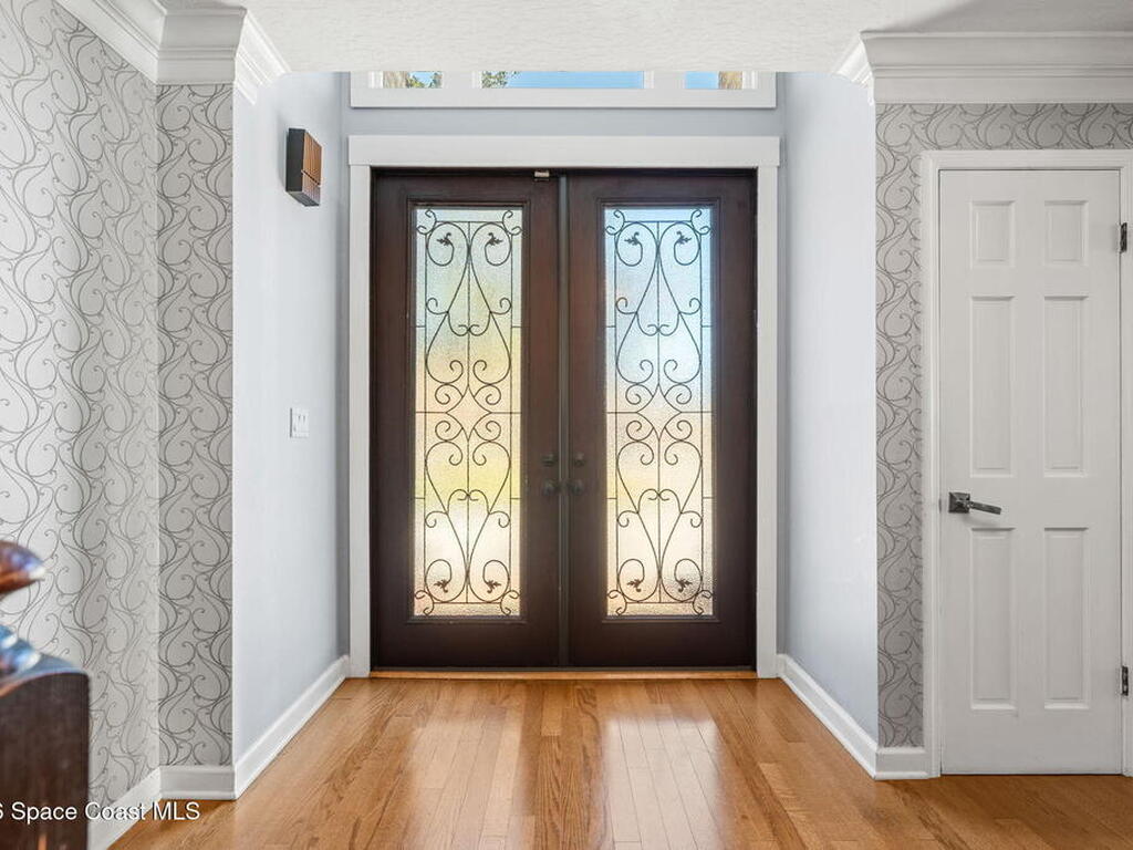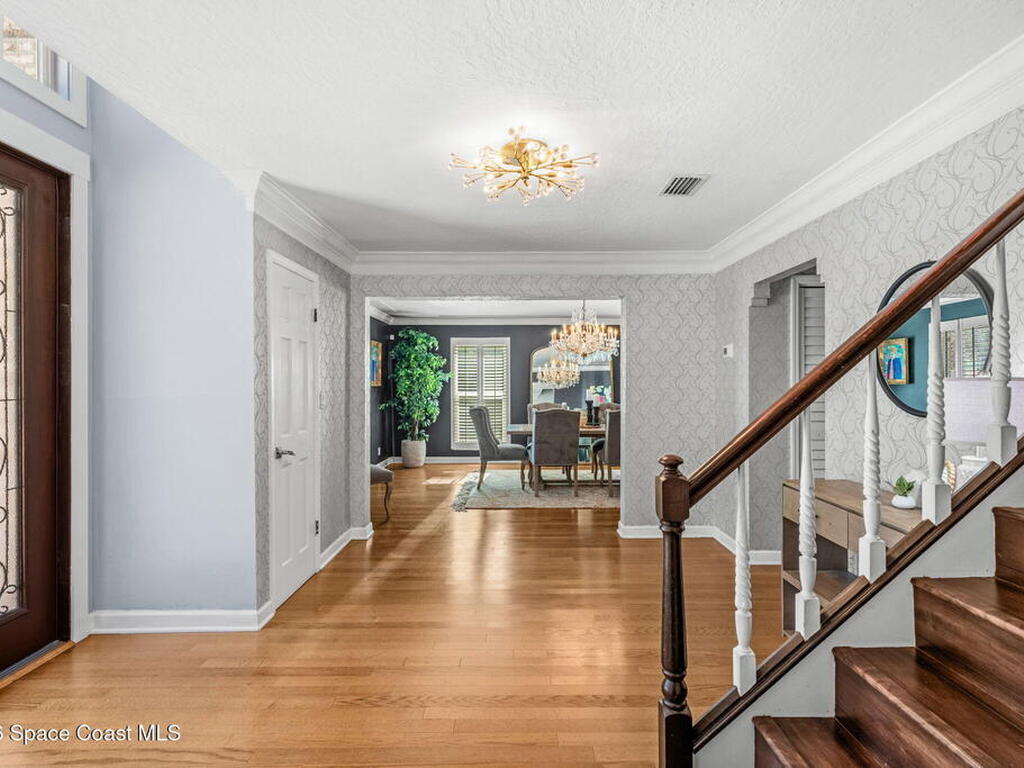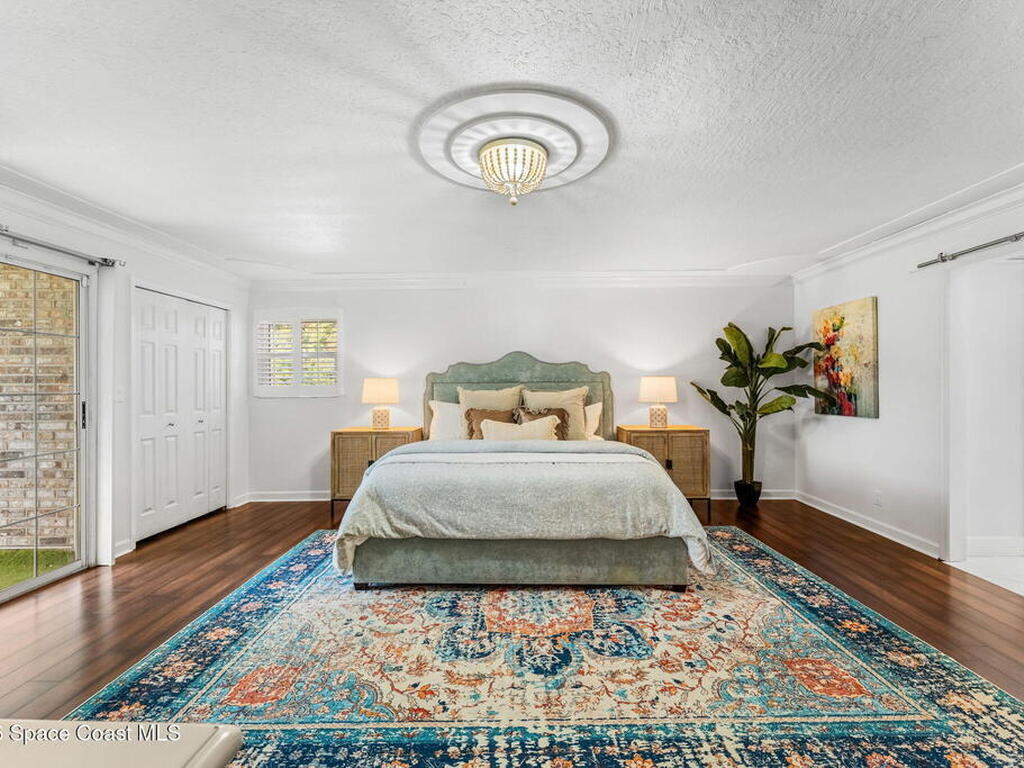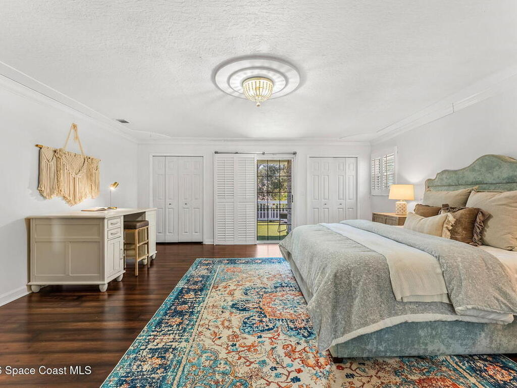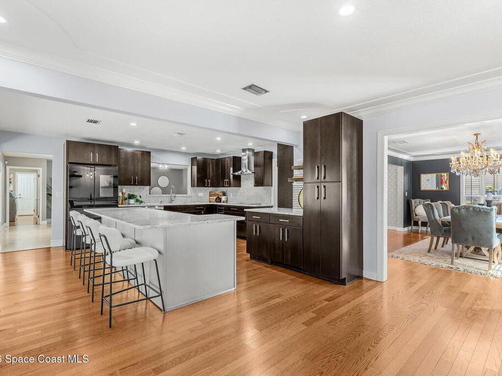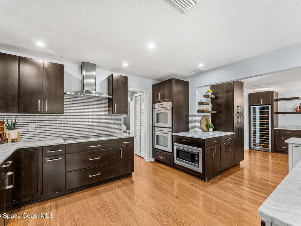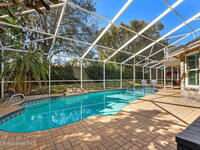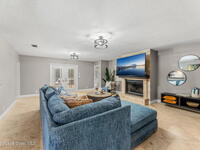 Located on a quiet cul-de-sac in Woodbridge at Suntree, this two-story brick French Provincial home sits directly adjacent to the 18th hole of Suntree Country Club. Offering 3, 487 square feet, 5 bedrooms, and 5 full baths, the home blends timeless architecture with extensive 2022 updates throughout.Designed with family living and entertaining in mind, the home features hardwood floors, a wood-burning fireplace, and multiple gathering spaces that flow seamlessly to the expansive covered lanai and screened pool with gas-heated spa. The fully modernized kitchen showcases marble countertops, double wall ovens, an induction cooktop, butler's pantry, and an impressive entertainment extension complete with a 200-bottle wine refrigerator and keg fridge.Upstairs, the primary suite offers four custom closets and direct access to a private rooftop deck with panoramic views.