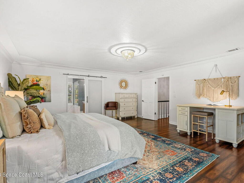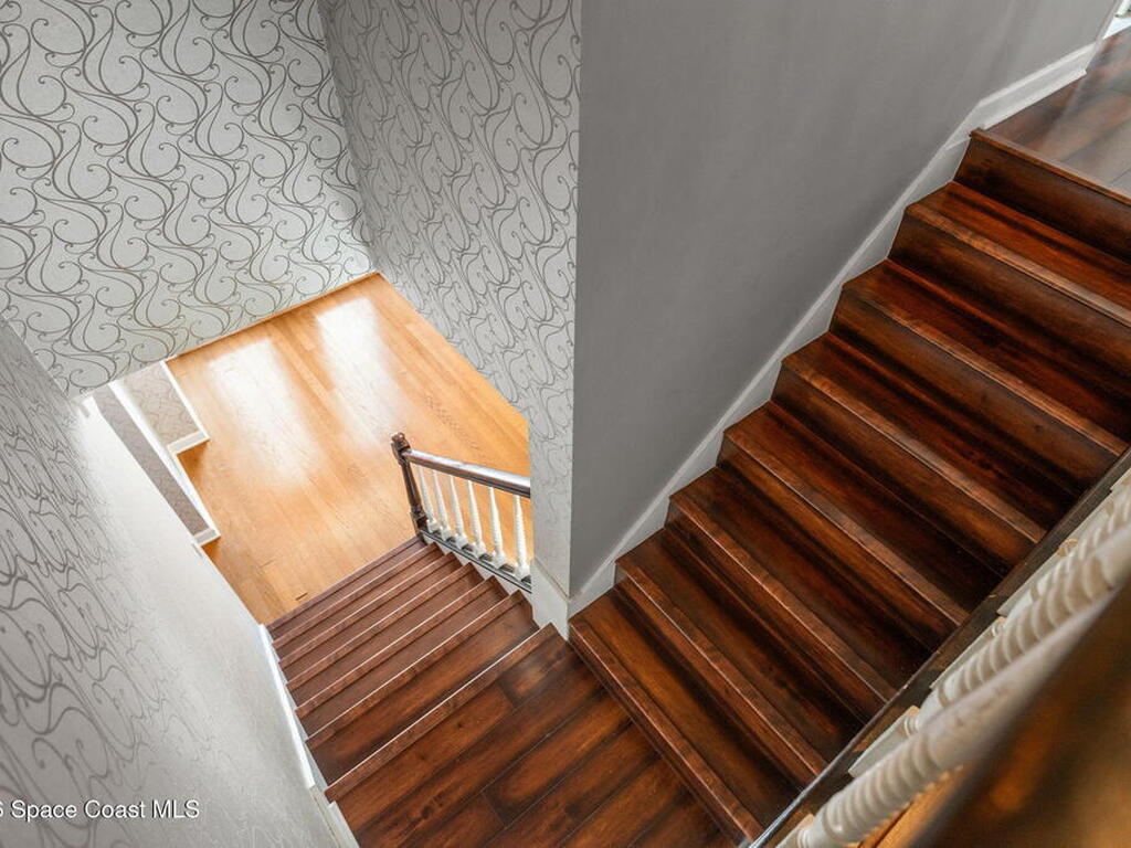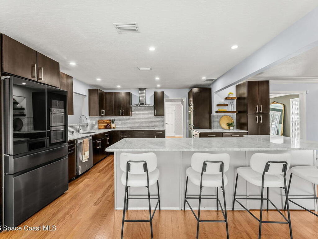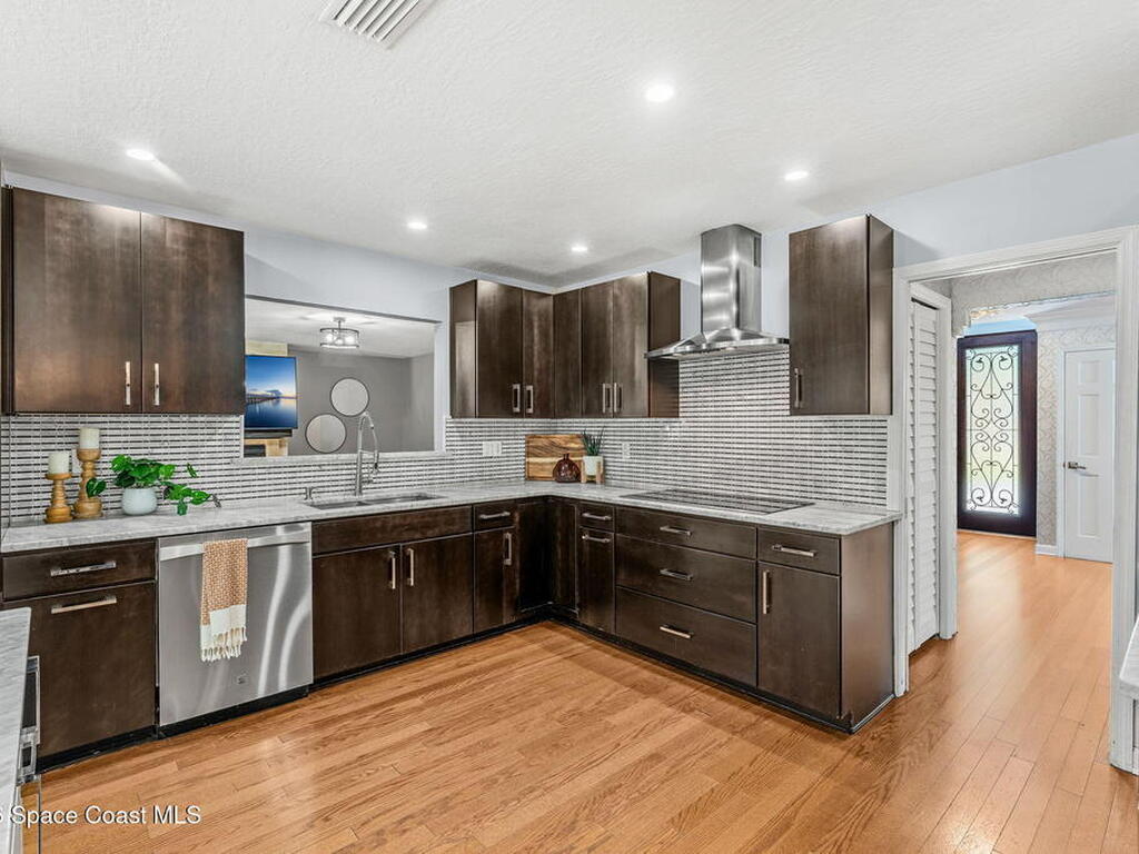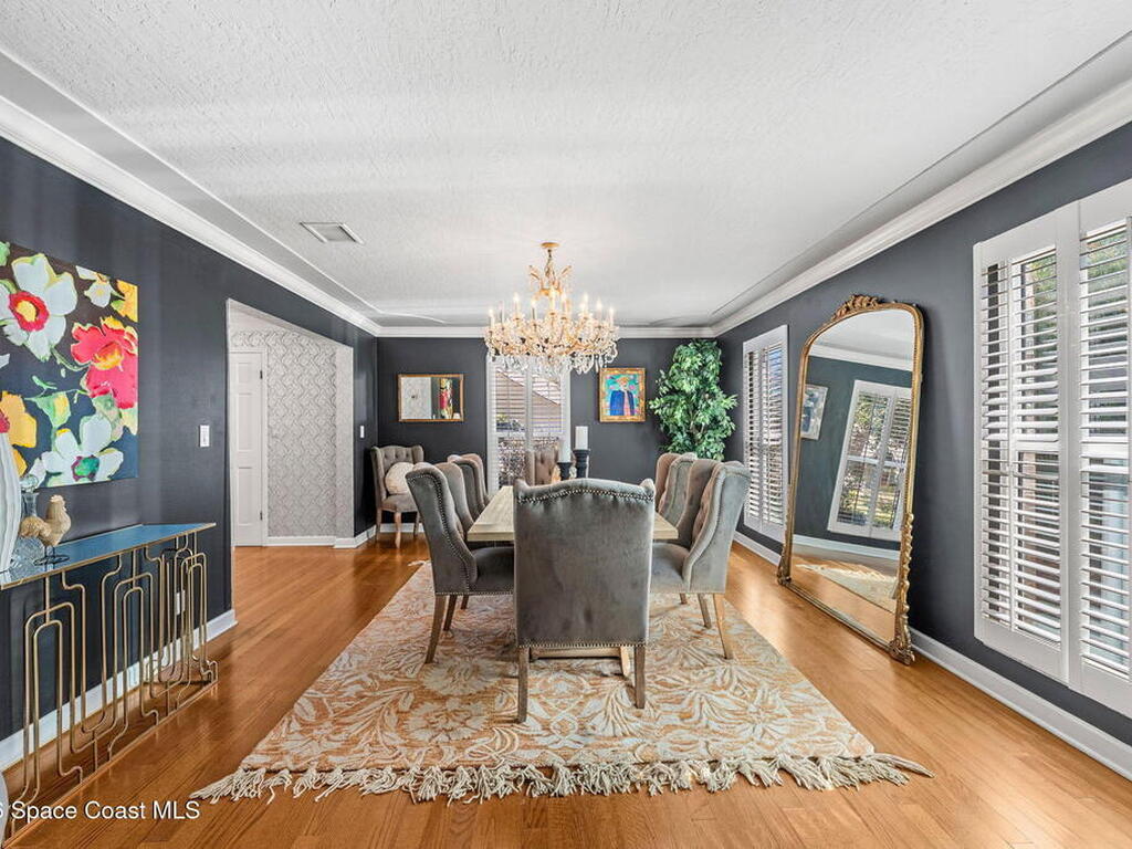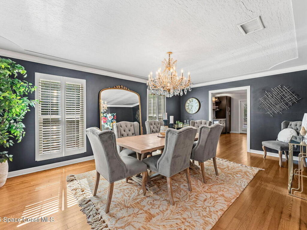 Located on a quiet cul-de-sac in Woodbridge at Suntree, this two-story brick French Provincial home sits directly adjacent to the 18th hole of Suntree Country Club. Offering 3, 487 square feet, 5 bedrooms, and 5 full baths, the home blends timeless architecture with extensive 2022 updates throughout.Designed with family living and entertaining in mind, the home features hardwood floors, a wood-burning fireplace, and multiple gathering spaces that flow seamlessly to the expansive covered lanai and screened pool with gas-heated spa. The fully modernized kitchen showcases marble countertops, double wall ovens, an induction cooktop, butler's pantry, and an impressive entertainment extension complete with a 200-bottle wine refrigerator and keg fridge.Upstairs, the primary suite offers four custom closets and direct access to a private rooftop deck with panoramic views.