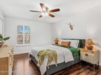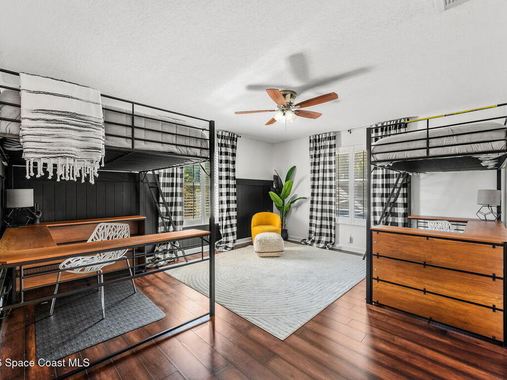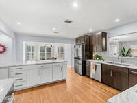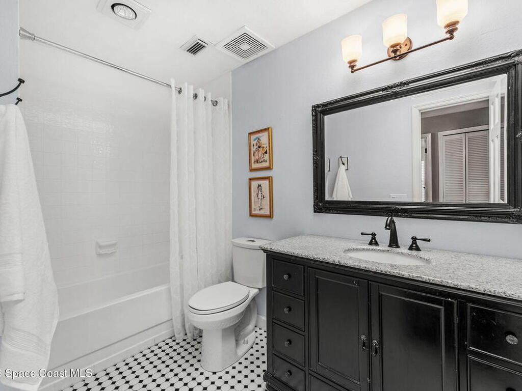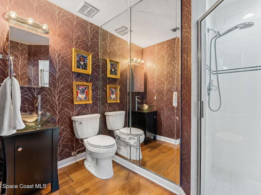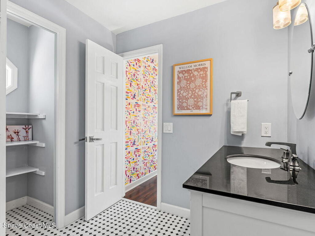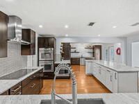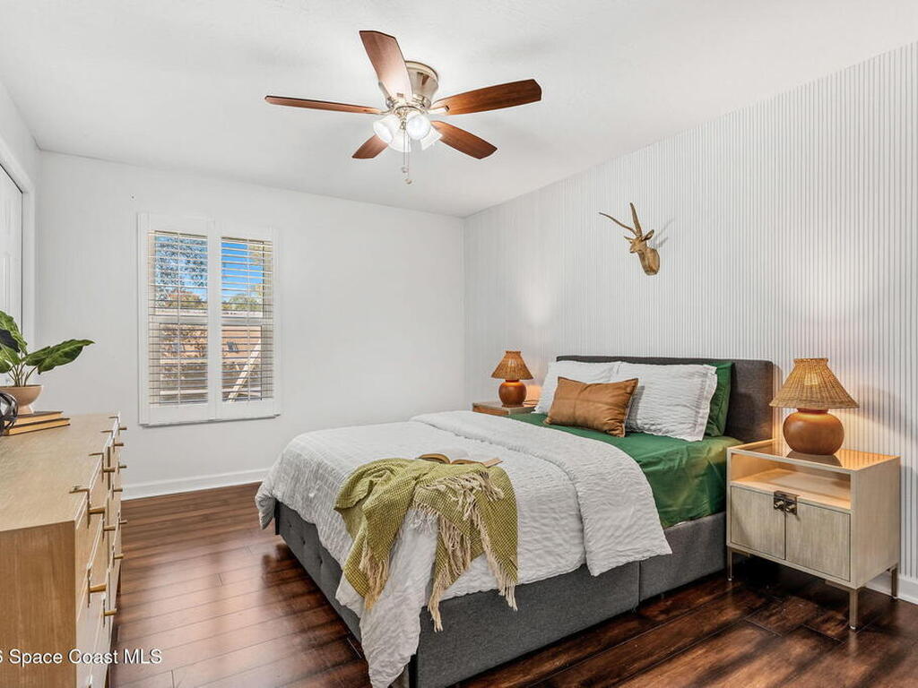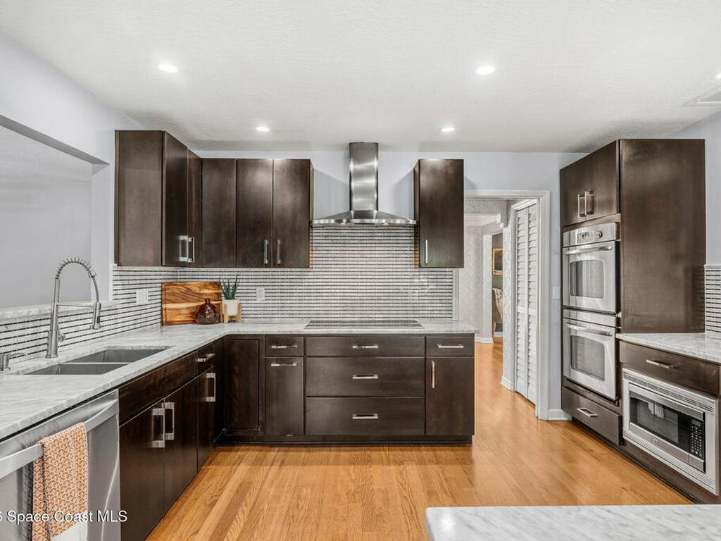 Located on a quiet cul-de-sac in Woodbridge at Suntree, this two-story brick French Provincial home sits directly adjacent to the 18th hole of Suntree Country Club. Offering 3, 487 square feet, 5 bedrooms, and 5 full baths, the home blends timeless architecture with extensive 2022 updates throughout.Designed with family living and entertaining in mind, the home features hardwood floors, a wood-burning fireplace, and multiple gathering spaces that flow seamlessly to the expansive covered lanai and screened pool with gas-heated spa. The fully modernized kitchen showcases marble countertops, double wall ovens, an induction cooktop, butler's pantry, and an impressive entertainment extension complete with a 200-bottle wine refrigerator and keg fridge.Upstairs, the primary suite offers four custom closets and direct access to a private rooftop deck with panoramic views.