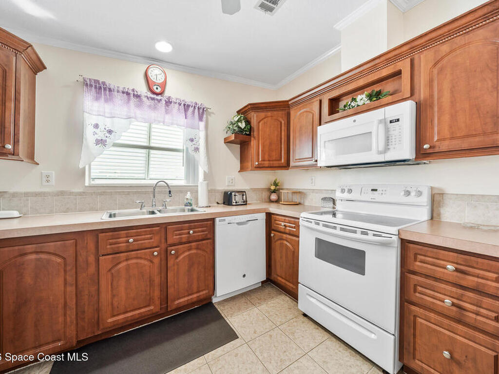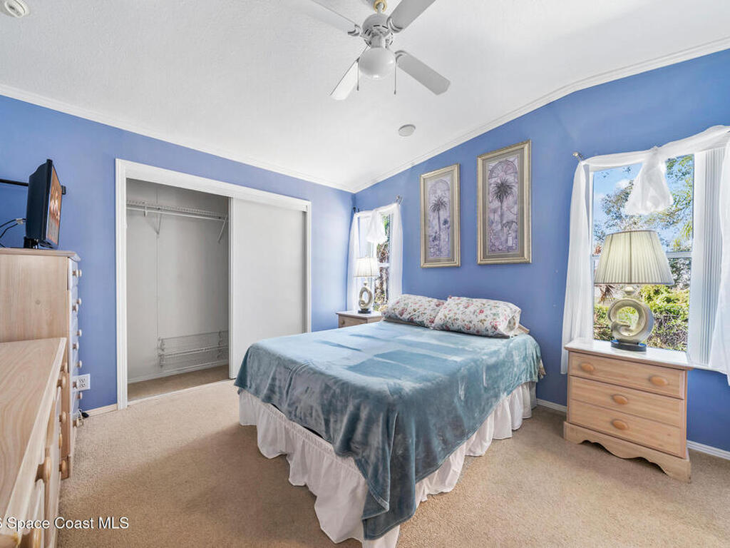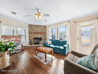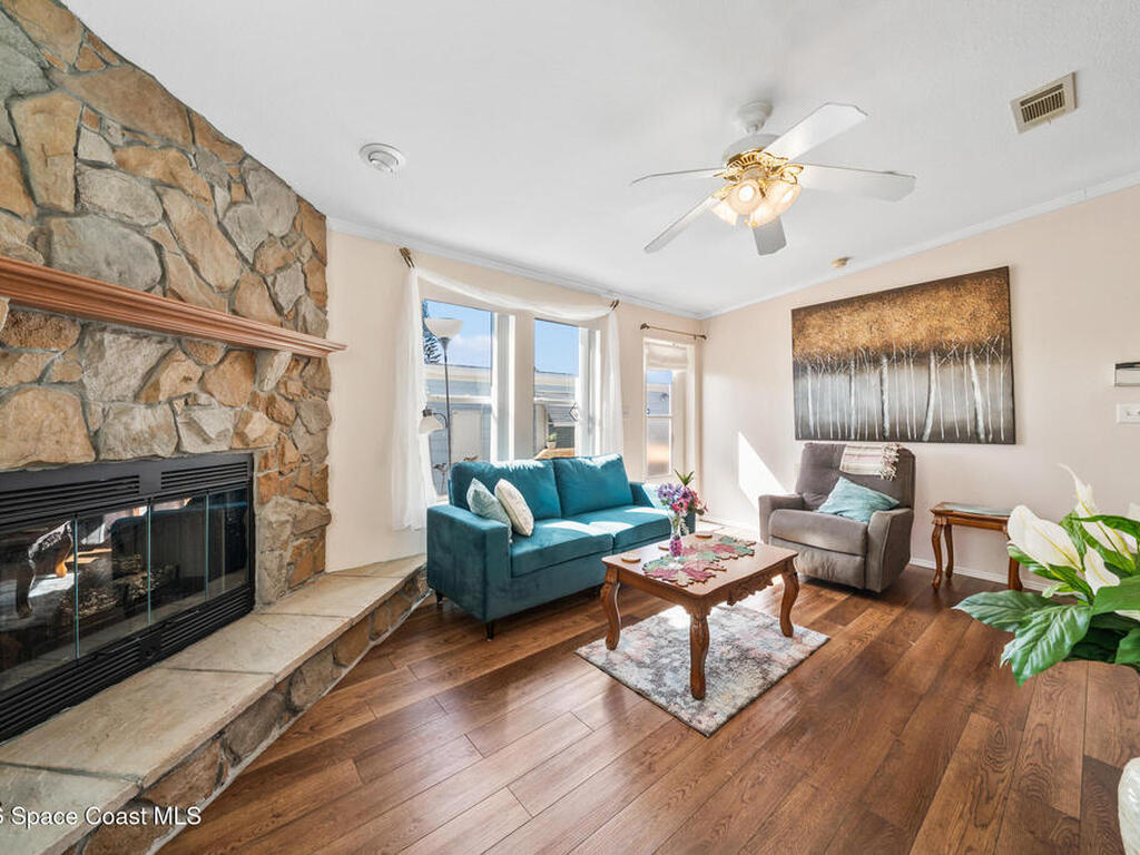 Palm Bay Colony is a 55+ community offering an active clubhouse, heated pool, pickleball, shuffleboard, tennis, and fitness center -- and here, you don't just own the home, you own the land. The $1, 500 membership has already been paid by the current owner and transfers to you. Ongoing fee is just $45/month. This well-kept 2-bedroom, 2-bath home features vaulted ceilings, laminate flooring in the main living areas, and a stone wood-burning fireplace that anchors the space. The kitchen offers solid wood cabinetry and opens comfortably to the dining and living areas. The primary suite includes a walk-in shower and generous counter space. Outside, enjoy a FL room, covered carport, storage shed, and a fully fenced backyard with mature trees and patio space -- easy to maintain and enjoy Florida living. Conveniently located near shopping, dining, and the beaches.