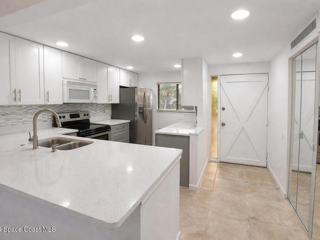 Wake up to breathtaking Banana River views in this beautifully updated condo, perfectly situated in a peaceful Cocoa Beach setting. This light-filled residence features a modern kitchen with quartz countertops, stainless-steel appliances, and stylish finishes throughout. The updated bathrooms include a Bluetooth-enabled mirror in the primary bath, while new flooring and fresh interior paint create a clean, move-in-ready feel. The flexible layout offers two comfortable bedrooms plus a spacious bonus room ideal for a home office, fitness area, or additional living space. The enclosed lanai with impact glass provides a serene spot to relax, entertain, or watch spectacular rocket launches over the river. Residents enjoy access to a community pool and dock, with potential boat slip availability, all just minutes from the Atlantic Ocean, local dining, shopping, and parks. Experience the perfect blend of modern updates, coastal lifestyle, and waterfront tranquility.HVAC-2024, Water Heater-2025
