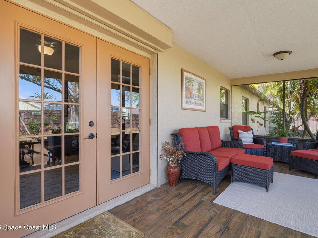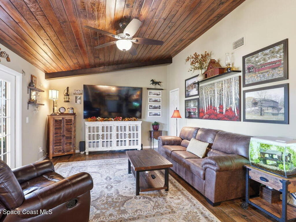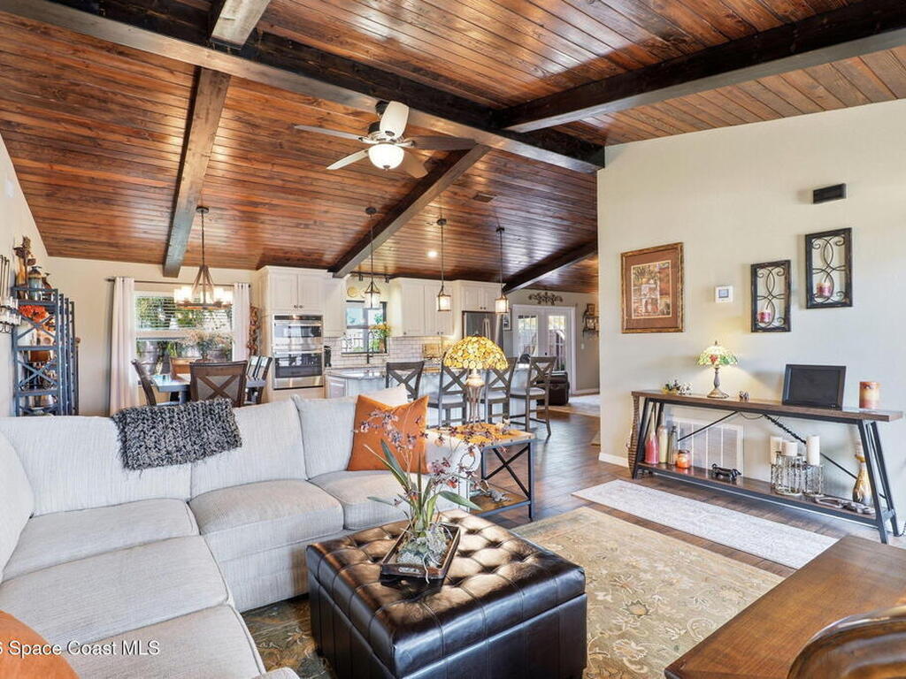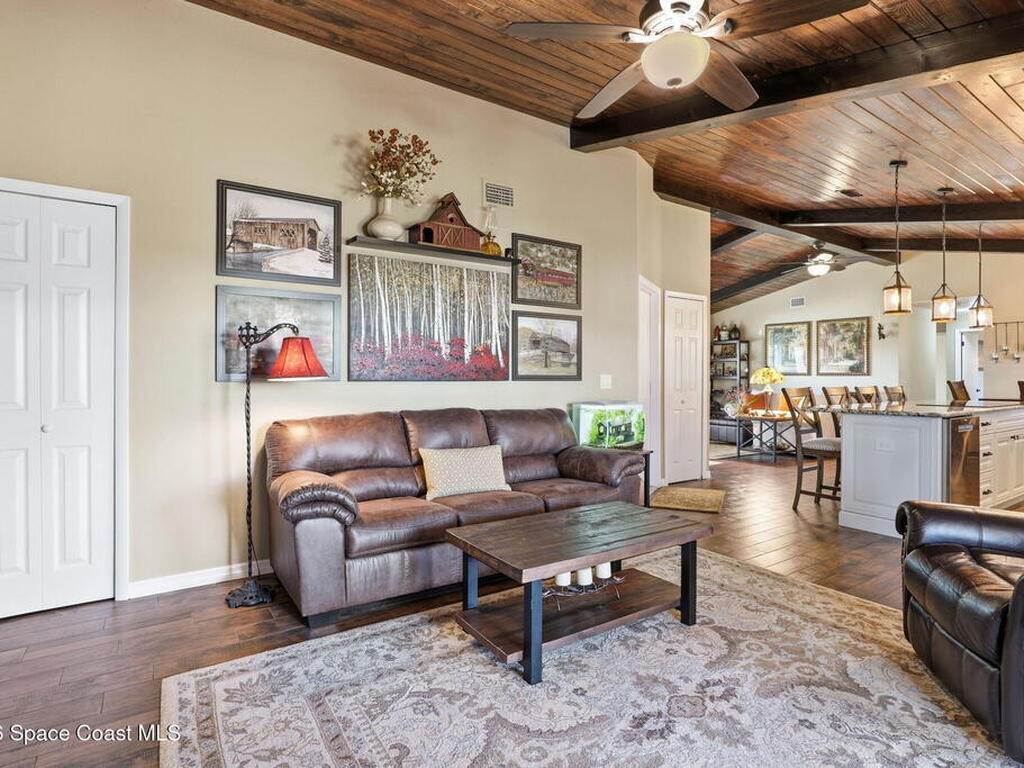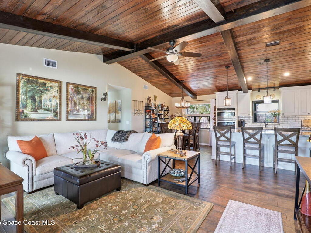 This home exudes thoughtful style and design from the very moment you arrive. Vaulted tongue-and-groove ceilings with exposed beams create warmth, complemented by wood-look tile flowing seamlessly throughout the entire home. The impressive kitchen features 15-inch deep soft-close cabinetry, sleek induction cooktop, GE Profile appliances, and Waterdrop reverse osmosis filtration system that even filters water for ice cubes. Impact windows provide peace of mind, along with a 2024 roof, 2018 gas water heater, and a variable-speed AC system (2014) which is known for its longer-than-average lifespan. Screened porch and private fully fenced backyard offers premium cedar fencing (resistant to rot and insects), storage sheds, and double-gate yard access with potential to store a small trailer or boat. Ideally located near Publix, the Eau Gallie Arts District, and I-95. Schedule a showing today!