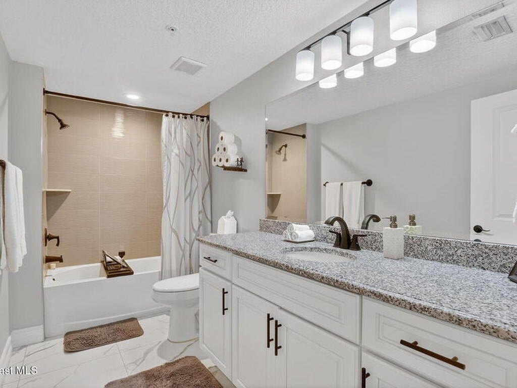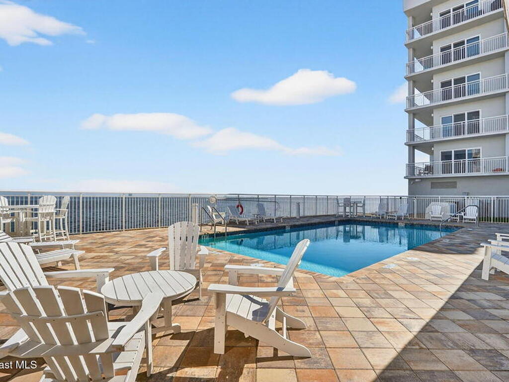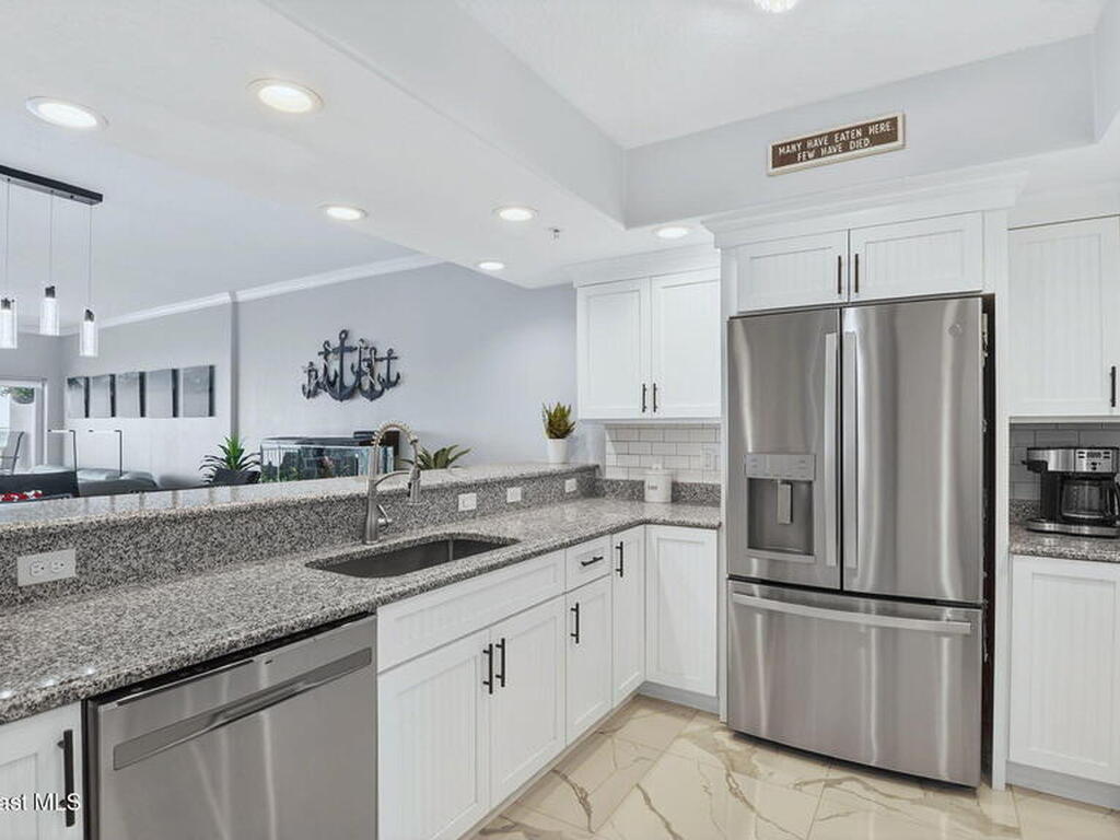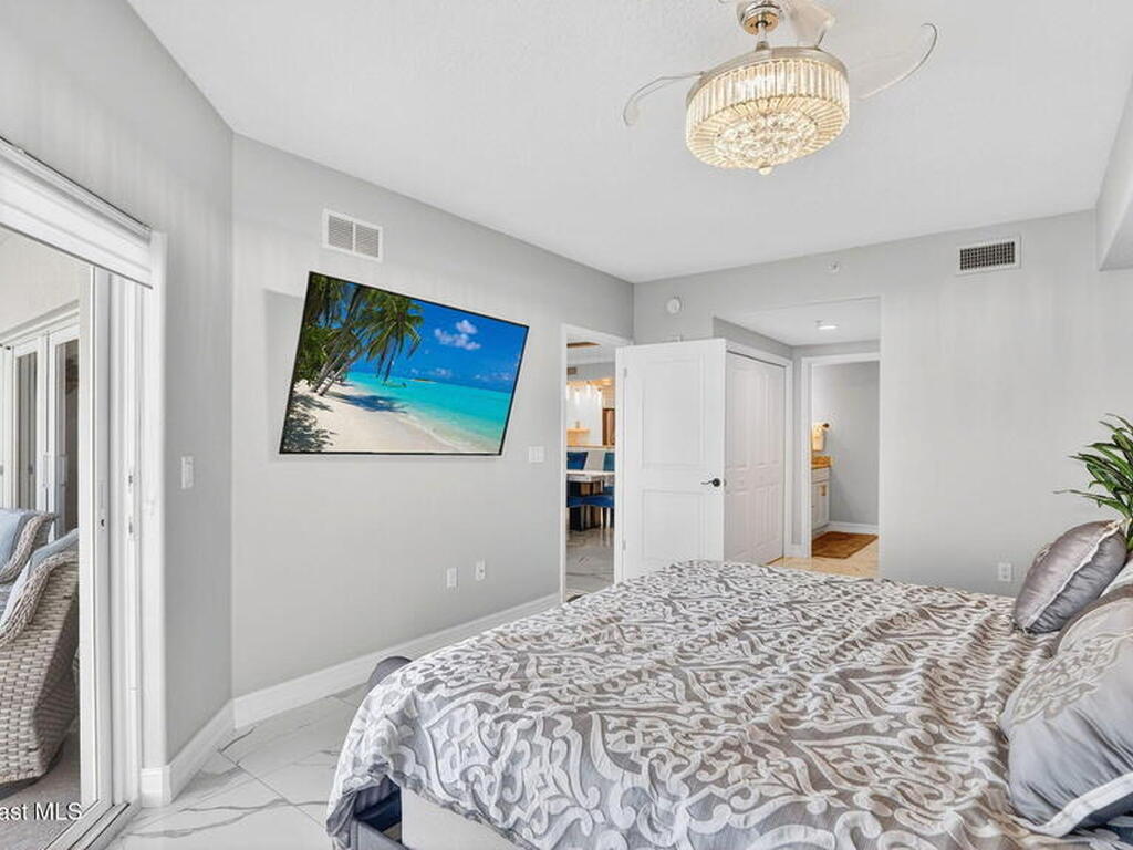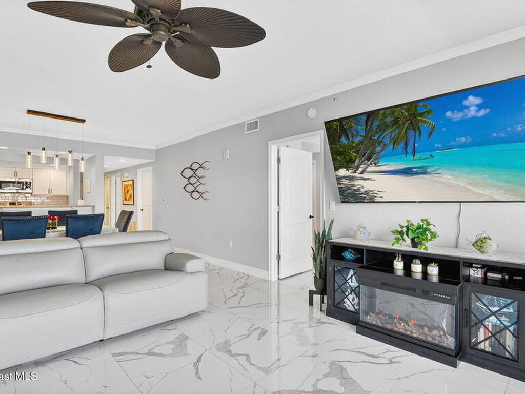 Built in 2023 & offering the 2nd Largest Floor Plan in River Palms, this Waterfront Condo delivers iconic Space Coast Views. Enjoy Impact Windows & a Private Balcony overlooking the Indian River & Kennedy Space Center for front row seats to Rocket Launches from the Living Room or the Primary. Inside, oversized Porcelain Tile runs throughout, paired w/ Granite Counters in the Kitchen & Baths. The Kitchen shines w/ SS Appliances, an Upgraded Double Oven, Farmhouse Sink, & Classic Subway Tile. A dedicated Laundry Room includes a Smart Front Load Washer/Dryer + Pedestals & Utility Sink. The Living & Dining areas are enhanced w/ Crown Molding. The Primary Suite features a Walk-in Closet & En Suite w/ Dual Sinks. Spot Manatees, Dolphins & Stingrays daily! Resort Style Amenities include a Waterfront Heated Pool, Clubhouse, Fitness Center, & Garage Parking. Maintenance Fee includes Water, Sewer, Trash, Internet & Cable. Minutes to Beaches, Dining, Shopping & SR 528.