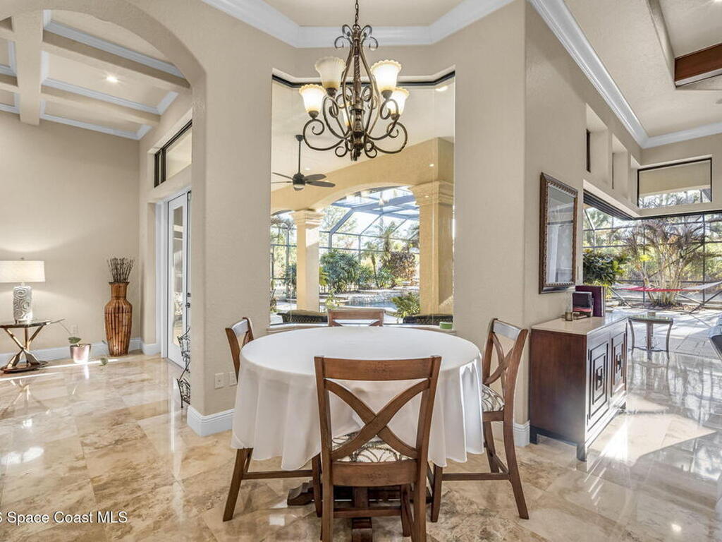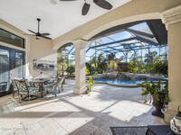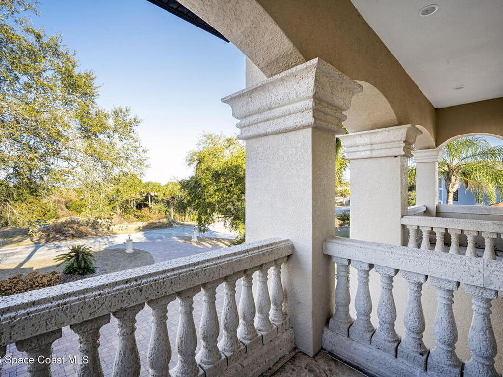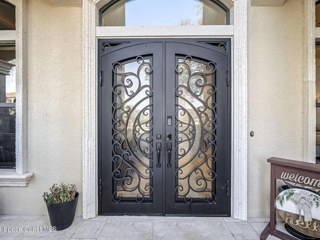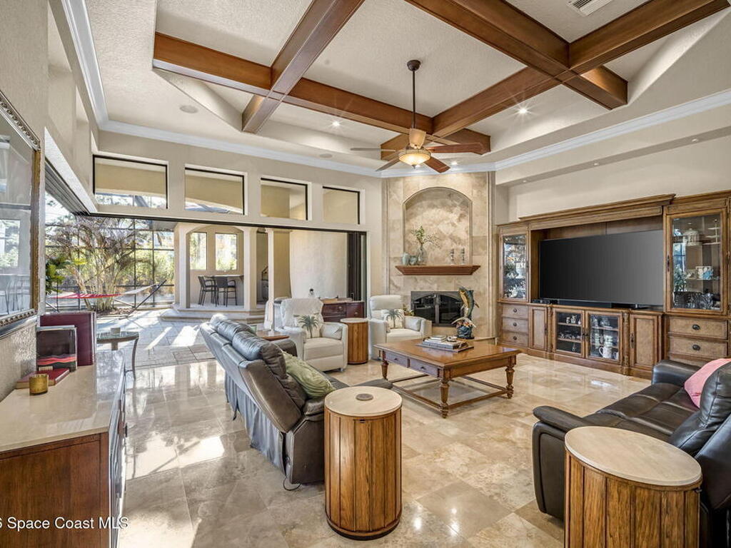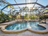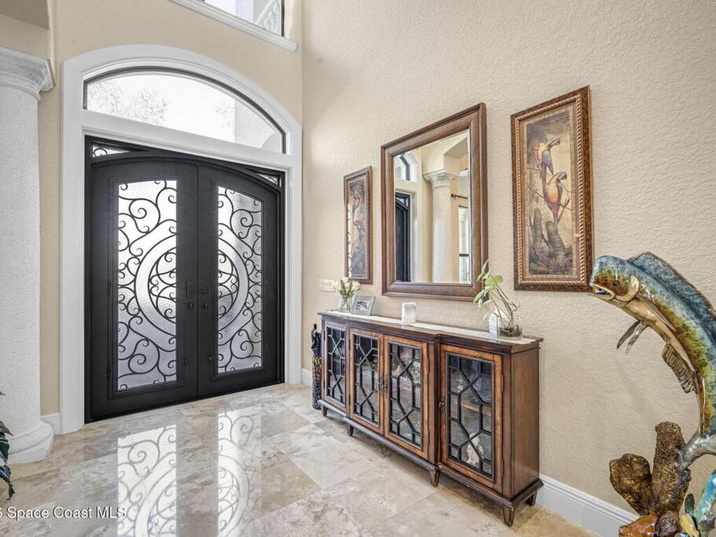 Custom-designed luxury pool home featuring a saltwater pool and spa with waterfall, fire bowls, and color-changing LED lighting. Equipped with PGT impact-rated windows, soaring tray and coffered ceilings, summer kitchen, and energy-efficient spray foam insulation. Expansive 90-degree pocket sliders create a seamless indoor-outdoor living space, ideal for entertaining. Spacious family room with fireplace. The chef's kitchen offers a large center island, granite counters, solid wood cabinetry, premium appliances, and a butler's pantry. Travertine and Brazilian cherry floors run throughout. Four private bedroom suites, each with its own bath. First-floor primary suite includes an elegant bath with dual vanities. Upstairs features a theater/entertainment room with kitchenette. Enjoy private access to a 200' dock across the street. Exceptional curb appeal and meticulous craftsmanship throughout. Located in the gated Hidden Creek community on the Space Coast, just steps from the Indian River