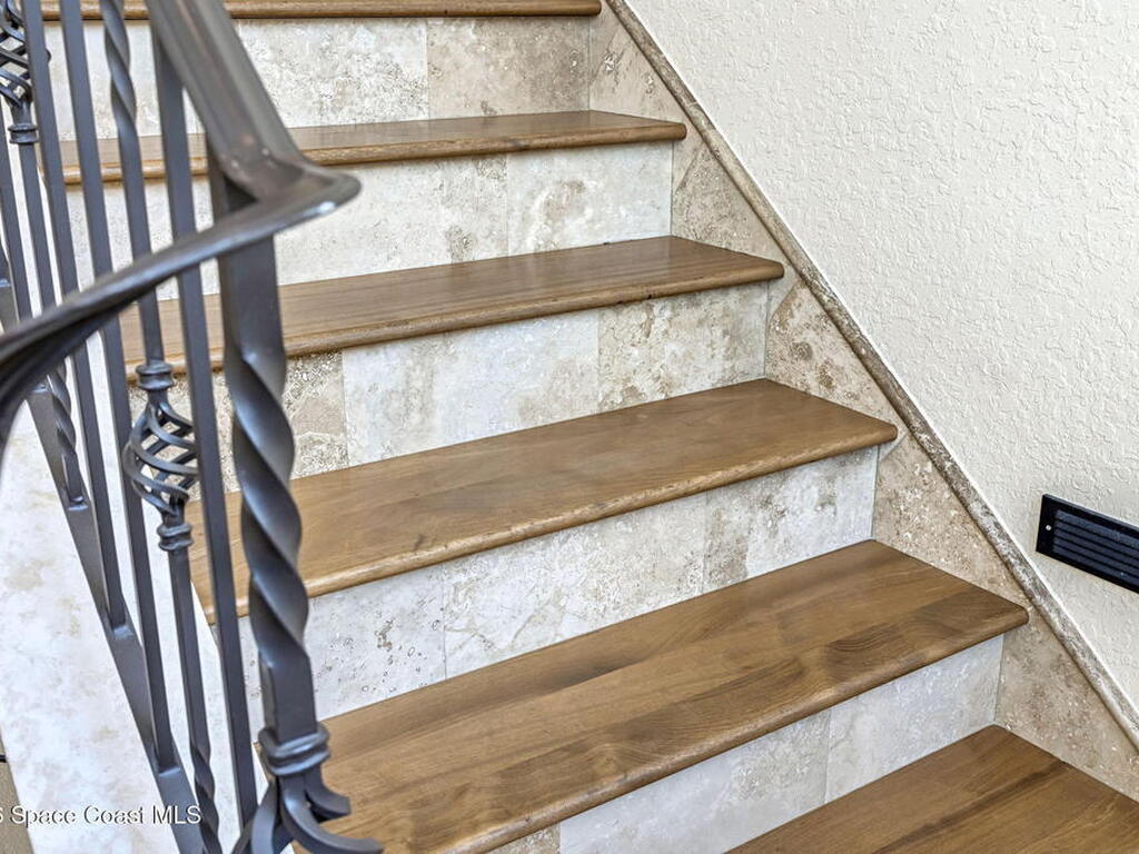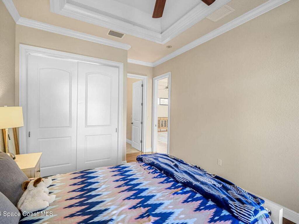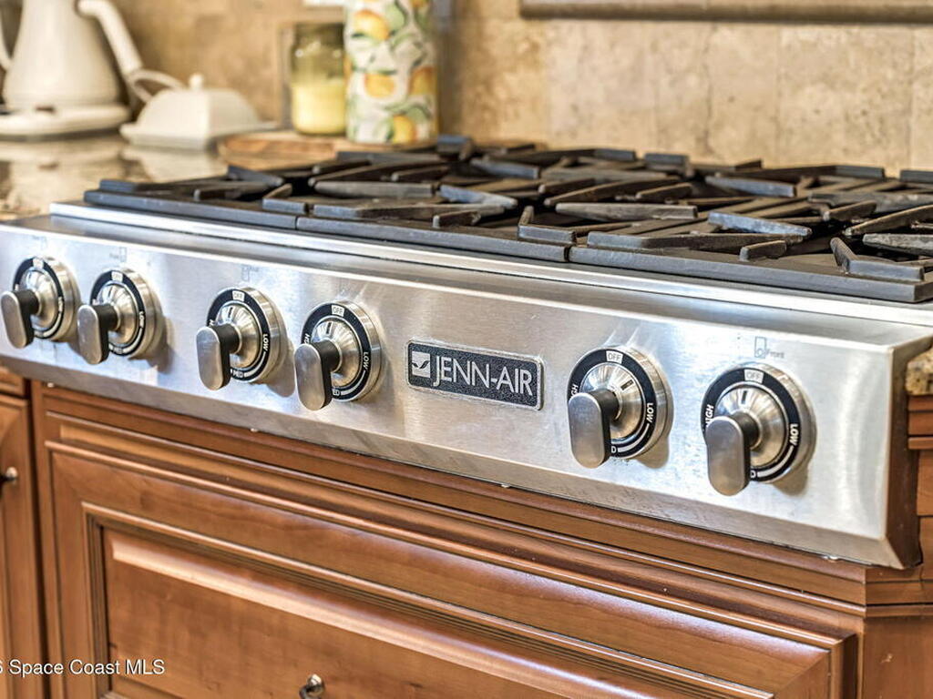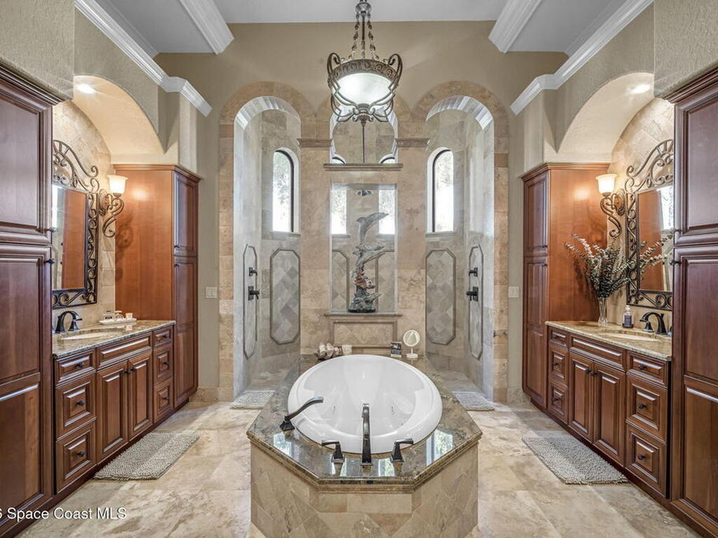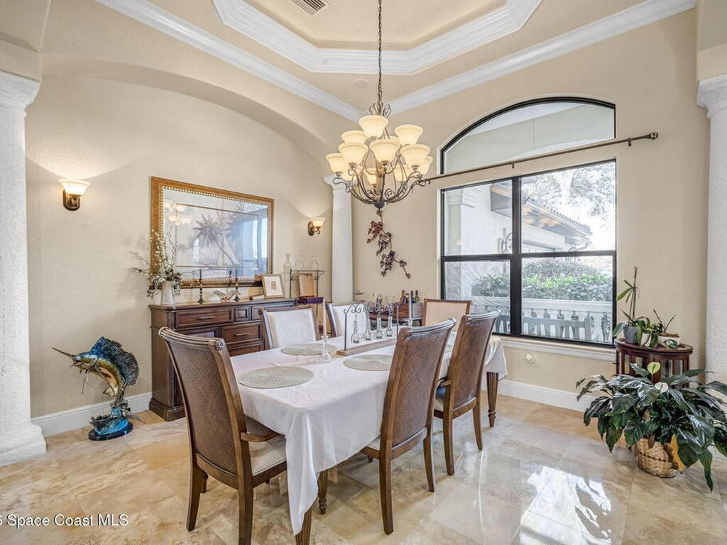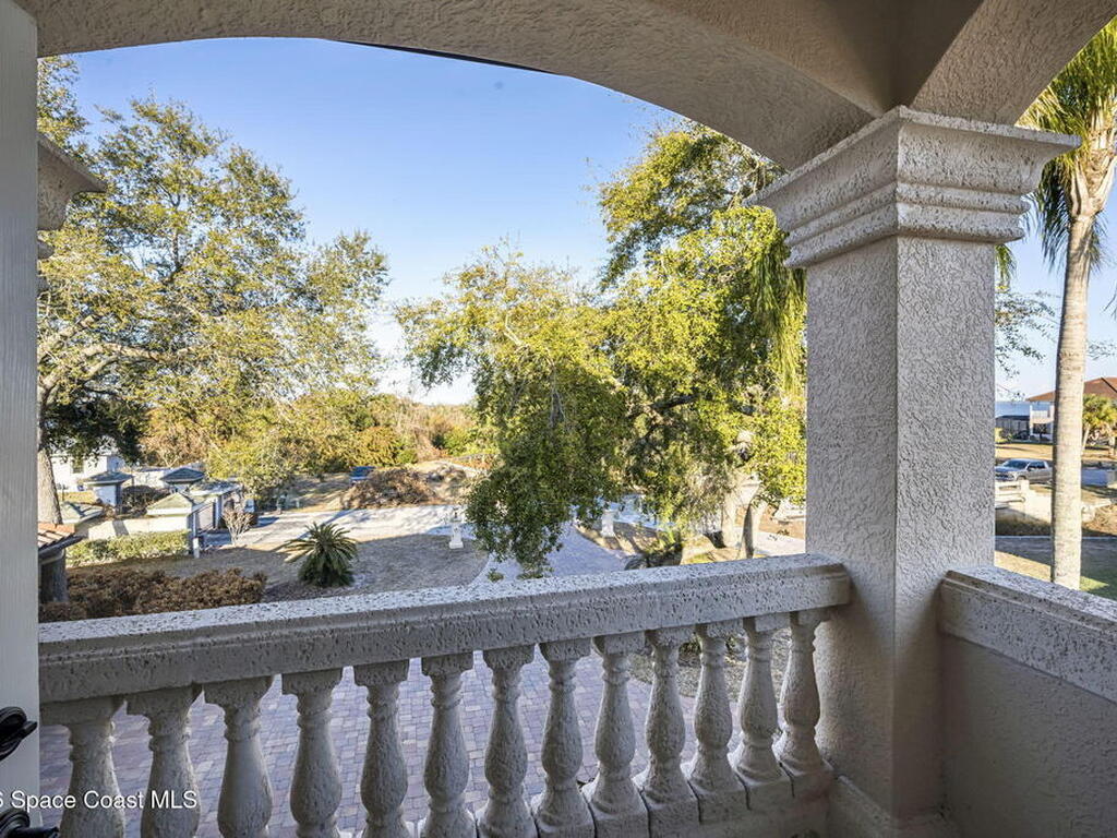 Custom-designed luxury pool home featuring a saltwater pool and spa with waterfall, fire bowls, and color-changing LED lighting. Equipped with PGT impact-rated windows, soaring tray and coffered ceilings, summer kitchen, and energy-efficient spray foam insulation. Expansive 90-degree pocket sliders create a seamless indoor-outdoor living space, ideal for entertaining. Spacious family room with fireplace. The chef's kitchen offers a large center island, granite counters, solid wood cabinetry, premium appliances, and a butler's pantry. Travertine and Brazilian cherry floors run throughout. Four private bedroom suites, each with its own bath. First-floor primary suite includes an elegant bath with dual vanities. Upstairs features a theater/entertainment room with kitchenette. Enjoy private access to a 200' dock across the street. Exceptional curb appeal and meticulous craftsmanship throughout. Located in the gated Hidden Creek community on the Space Coast, just steps from the Indian River