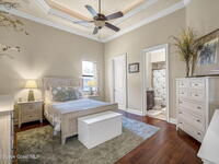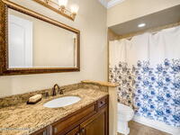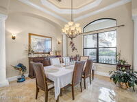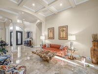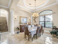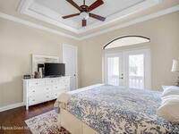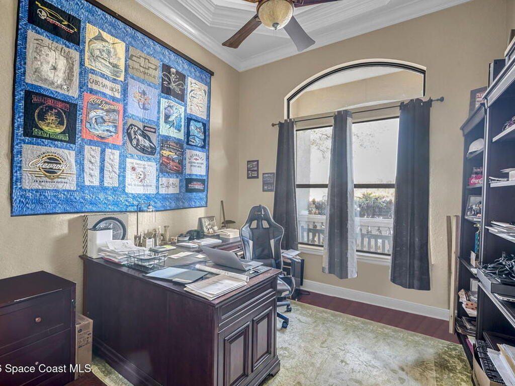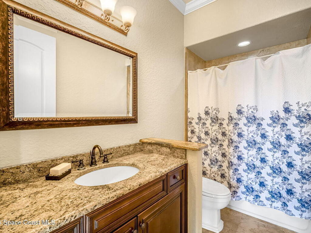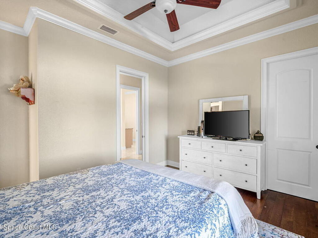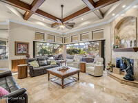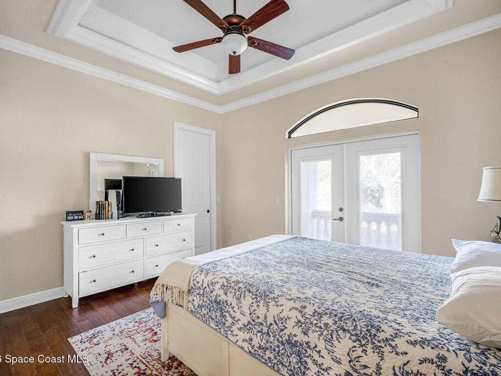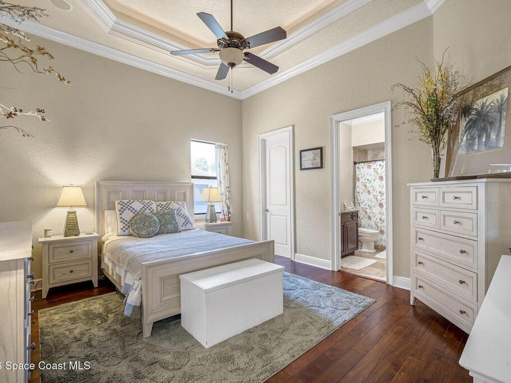 Custom-designed luxury pool home featuring a saltwater pool and spa with waterfall, fire bowls, and color-changing LED lighting. Equipped with PGT impact-rated windows, soaring tray and coffered ceilings, summer kitchen, and energy-efficient spray foam insulation. Expansive 90-degree pocket sliders create a seamless indoor-outdoor living space, ideal for entertaining. Spacious family room with fireplace. The chef's kitchen offers a large center island, granite counters, solid wood cabinetry, premium appliances, and a butler's pantry. Travertine and Brazilian cherry floors run throughout. Four private bedroom suites, each with its own bath. First-floor primary suite includes an elegant bath with dual vanities. Upstairs features a theater/entertainment room with kitchenette. Enjoy private access to a 200' dock across the street. Exceptional curb appeal and meticulous craftsmanship throughout. Located in the gated Hidden Creek community on the Space Coast, just steps from the Indian River