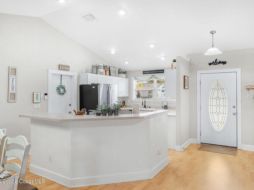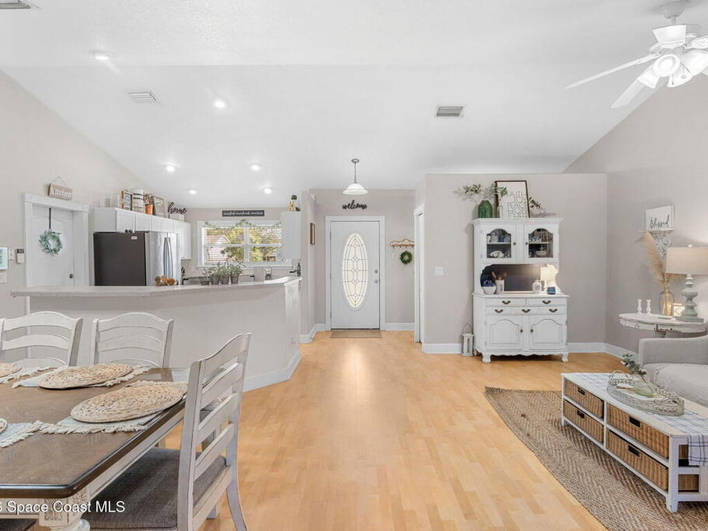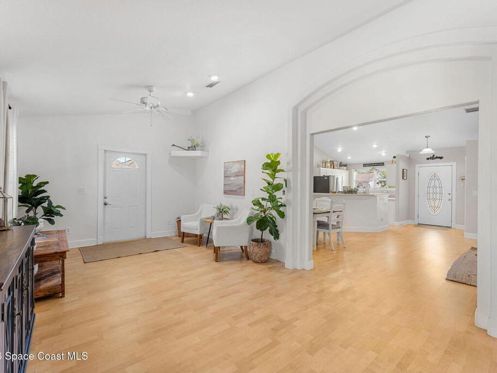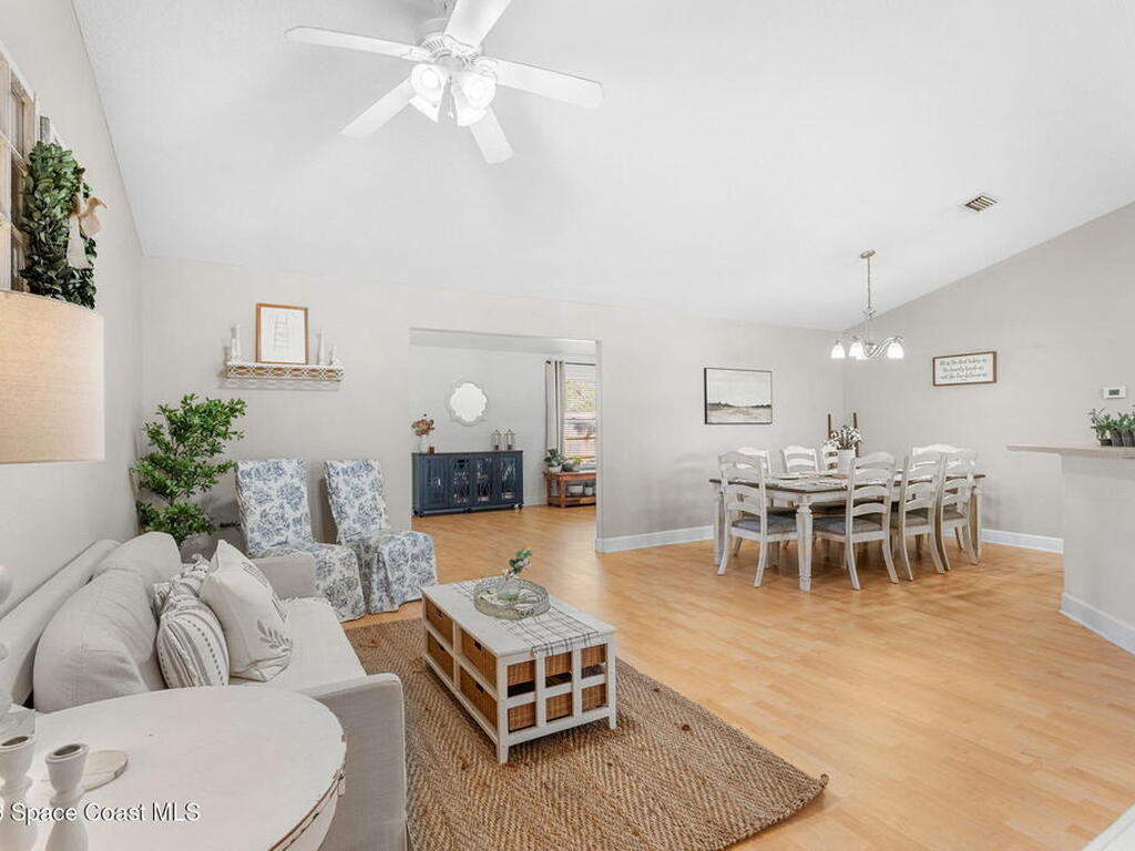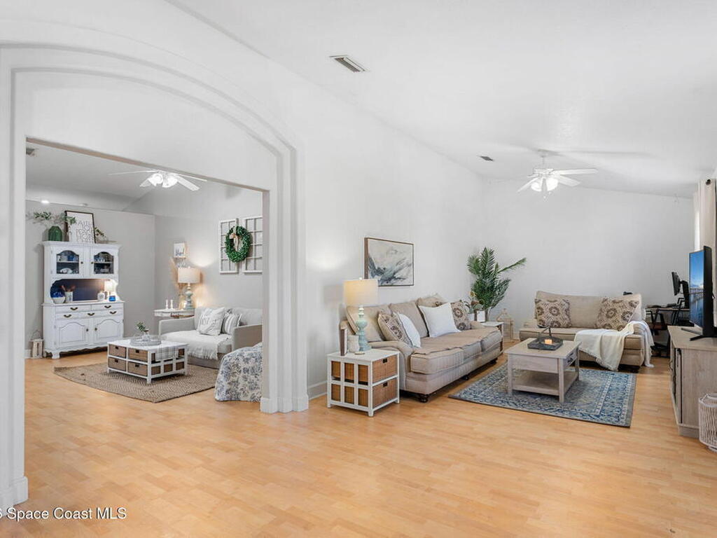 Welcome home to 449 Gilbert Drive NE in the heart of Central Palm Bay, where space, light, and comfort come together beautifully.Pulling up, you'll immediately notice the inviting curb appeal--mature palms, a wide driveway, and a side-entry two-car garage set on a generous .27-acre lot. This is the kind of property that gives you breathing room, with a fully fenced backyard and no HOA to limit your lifestyle.Step inside and you're greeted by soaring vaulted ceilings and warm wood-look laminate flooring that flows through the main living areas. The open floor plan creates an airy, expansive feel from the moment you enter. Rounded archways and soft natural light give the home character and warmth, while the layout offers flexibility for the way you live.The kitchen truly anchors the home. Crisp white cabinetry, new major kitchen appliances (May 2024), generous counter space, and a breakfast bar make it both functional and welcoming.